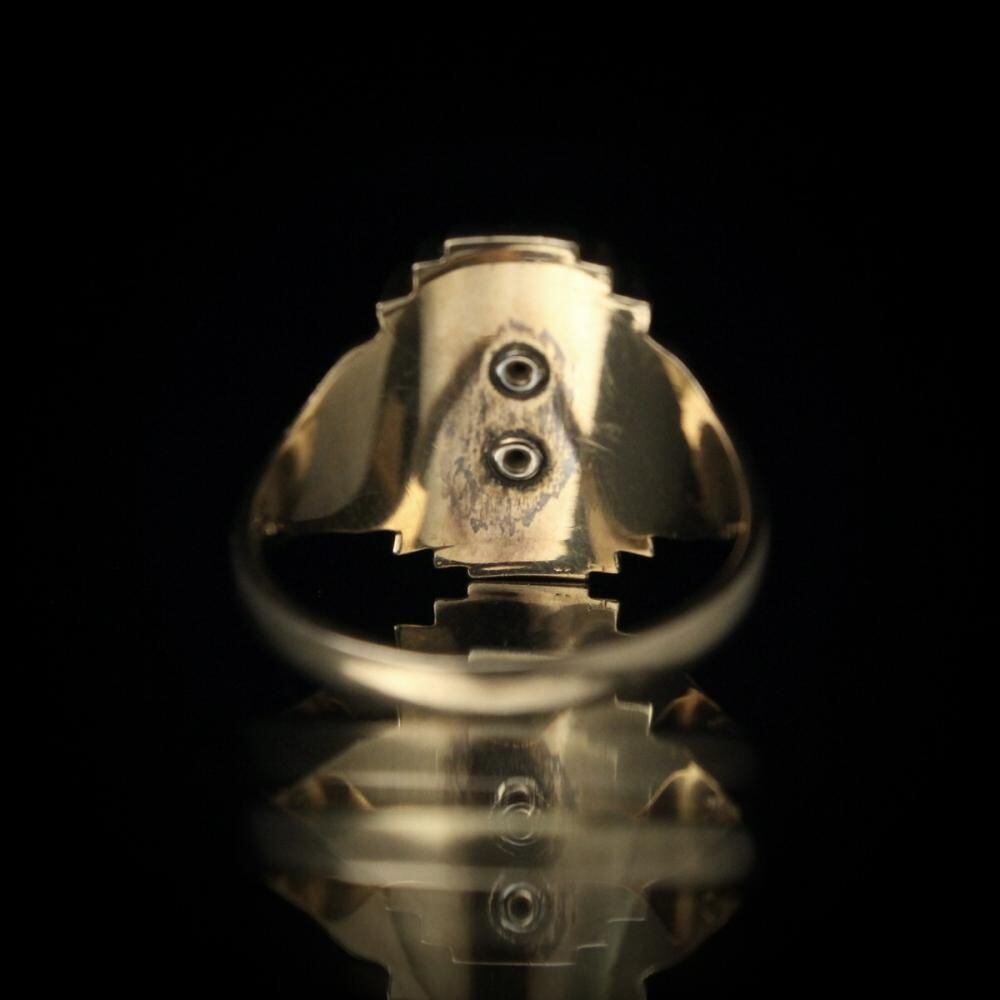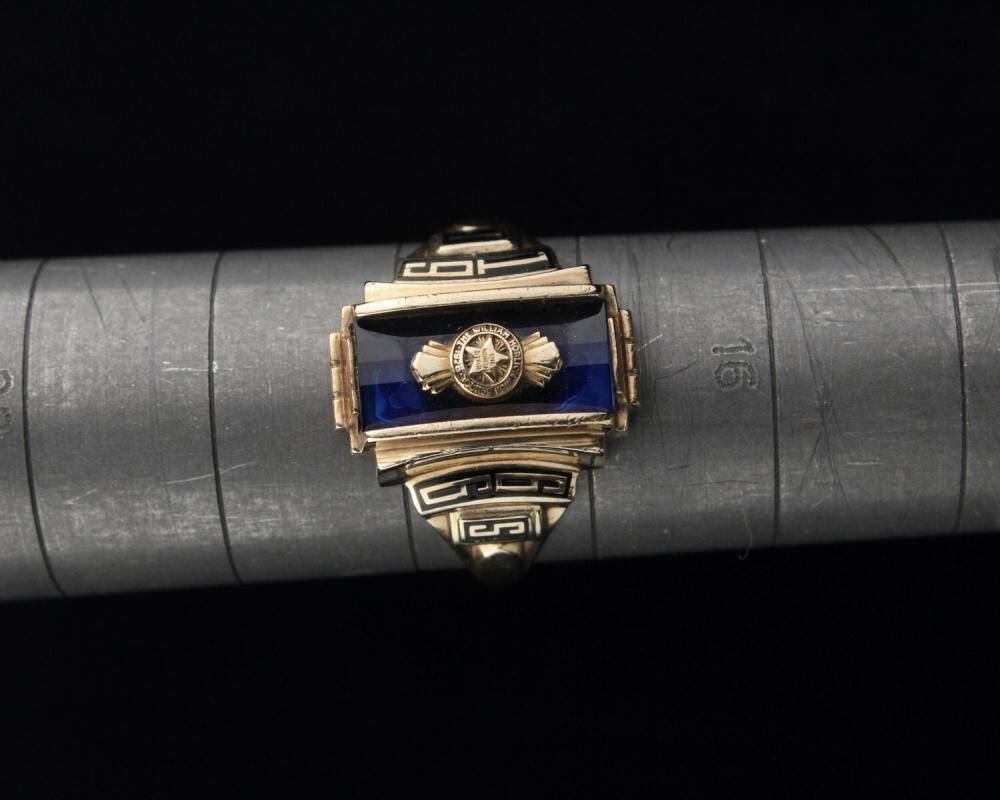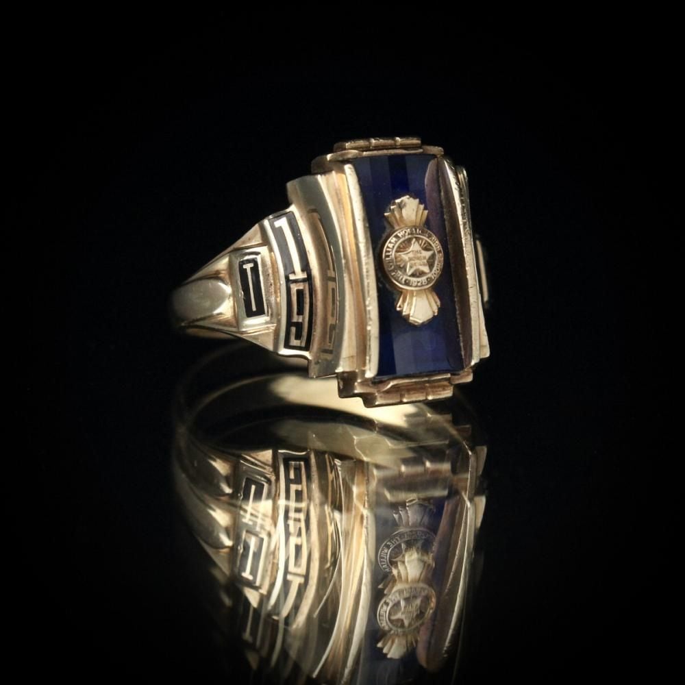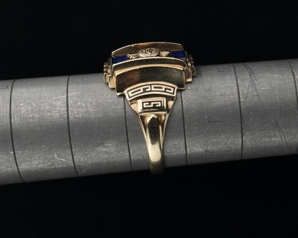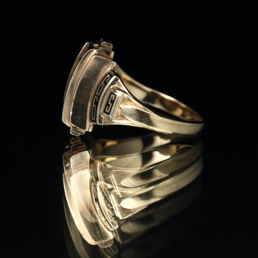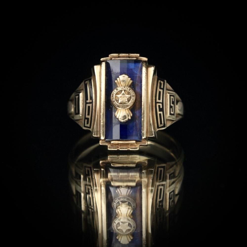 A vintage class ring from 1966. It retains the Art Deco influence with its angular silhouette, substantial medium-sized top, and striking top stone. The star emblem on the top is also a memorable design element. Made by NOMAK, stamped with 10kt gold. There is a slight chip on the onyx. Please check the condition in the photos and understand the characteristics of vintage items before purchasing.