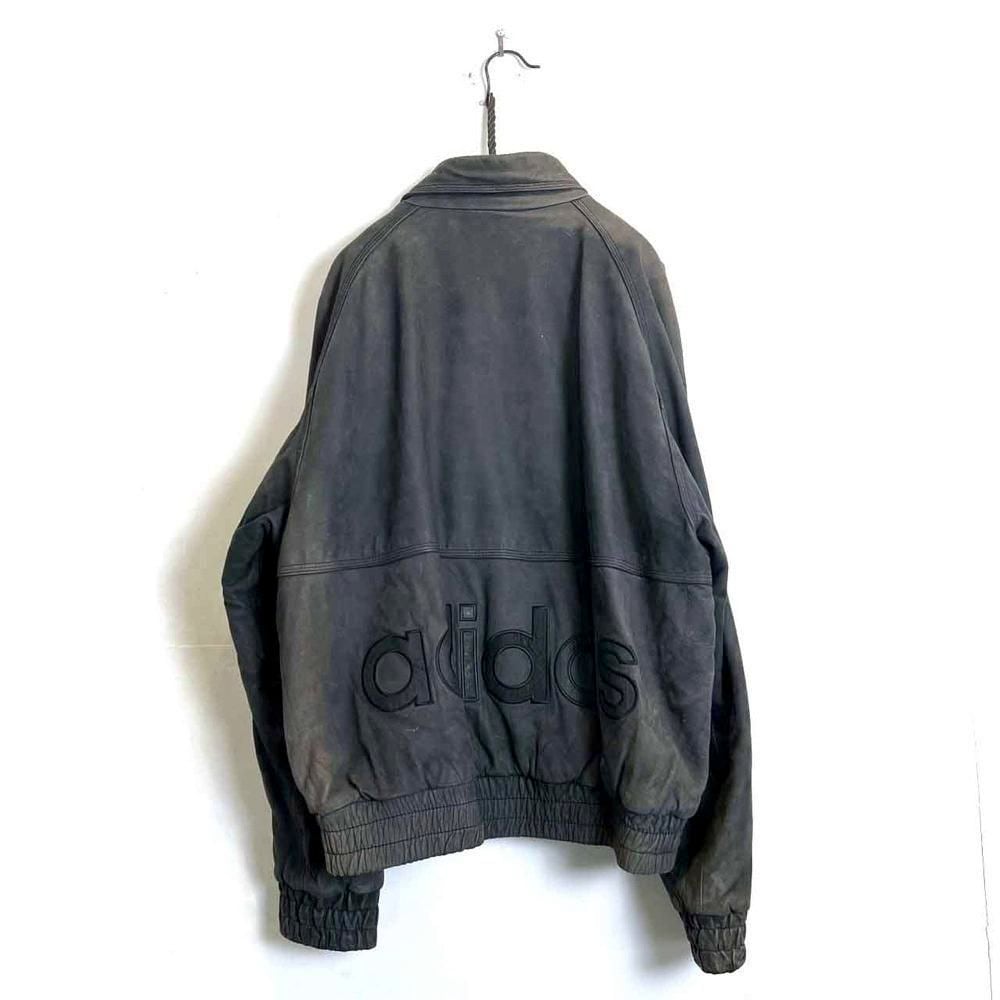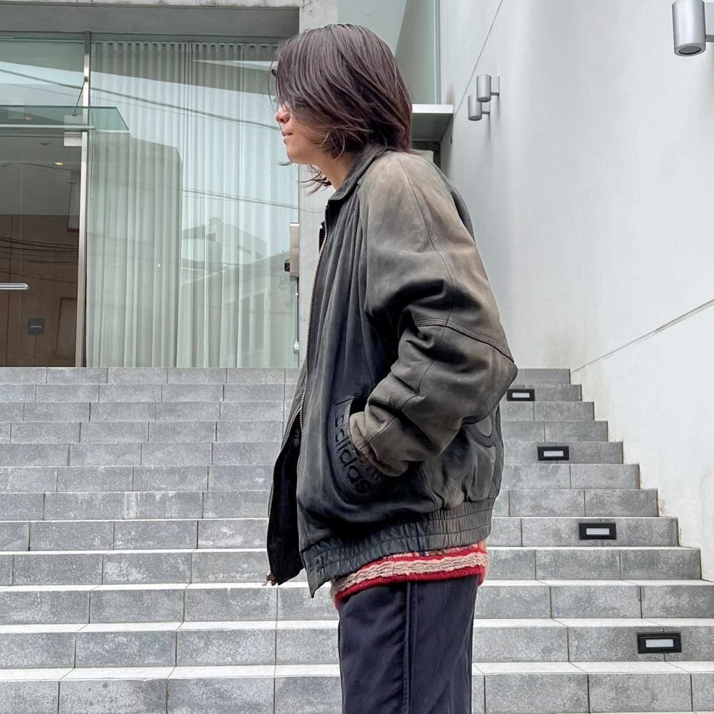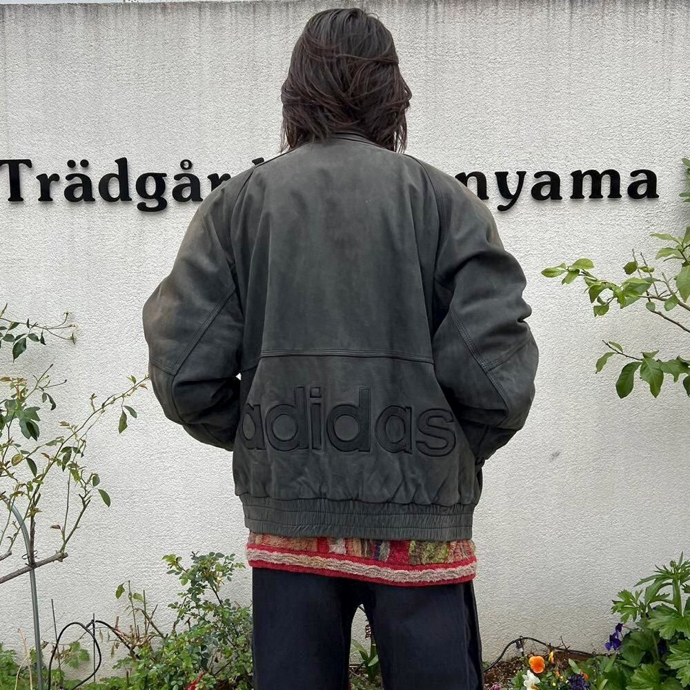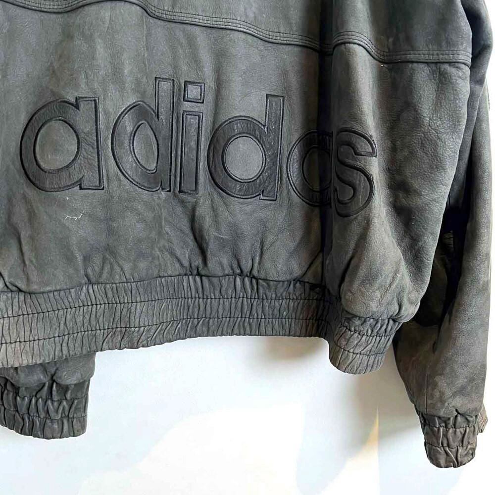 This 90s Adidas nubuck leather jacket has a beautifully faded charcoal color that has developed a unique patina over time. The matte texture of the nubuck leather, combined with the Adidas logo, gives it a sophisticated, understated look that belies its sporty brand image. The jacket has a comfortably relaxed fit and a great silhouette.