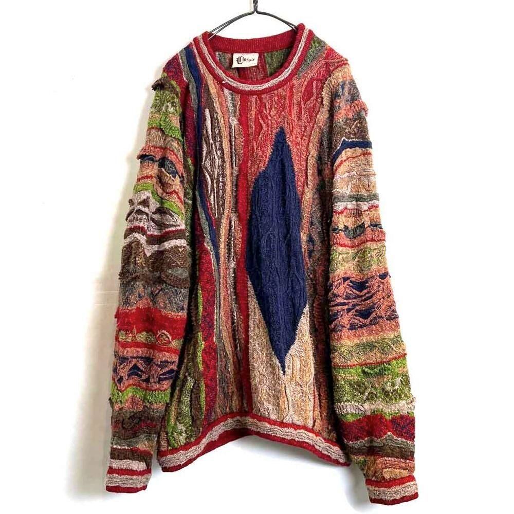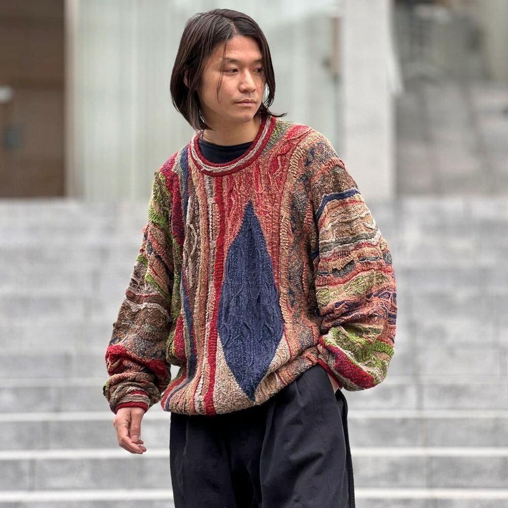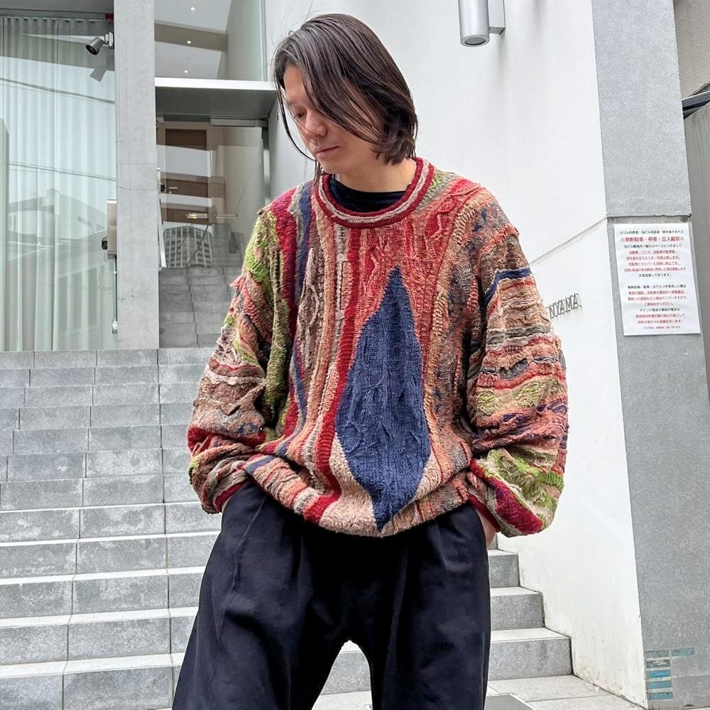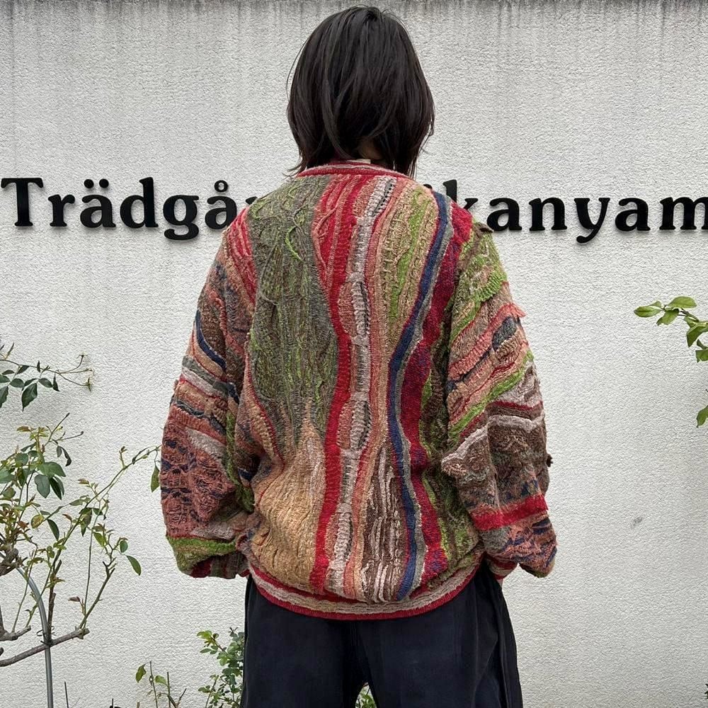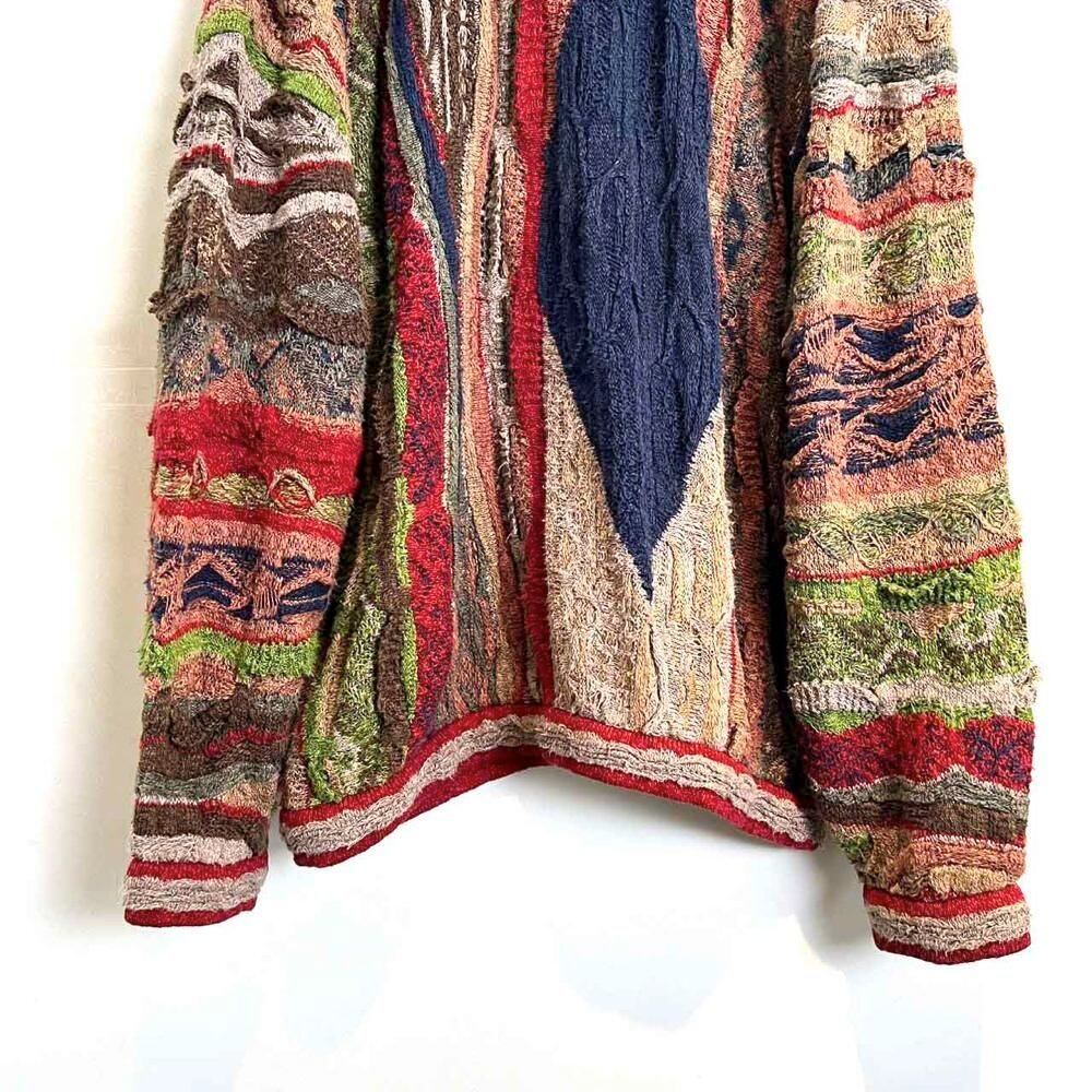 This 90s Coozy crewneck sweater features a muted khaki base color with a mossy, weathered look that gives it a great atmosphere. Made from a cotton and linen blend, it has a soft, smooth feel and boasts Coozys signature high-quality 3-D knit construction. The size is marked as XL, and the relaxed drape creates a great silhouette.