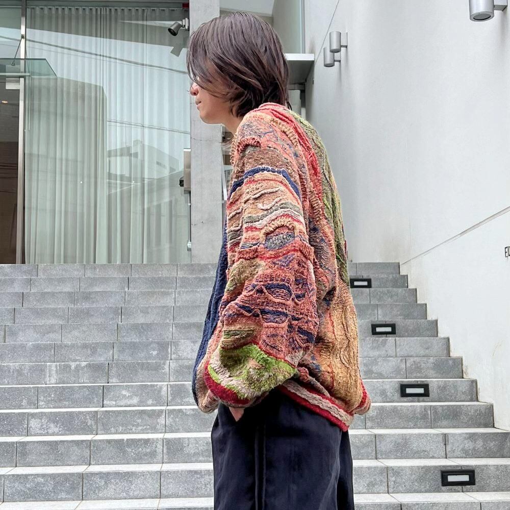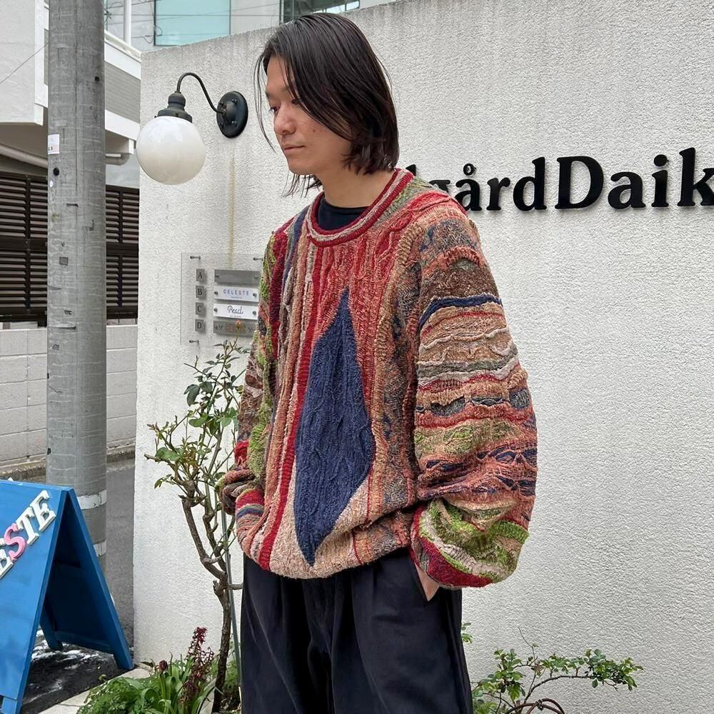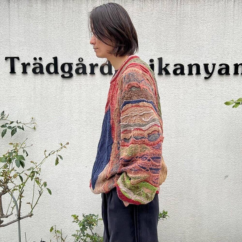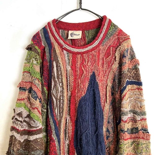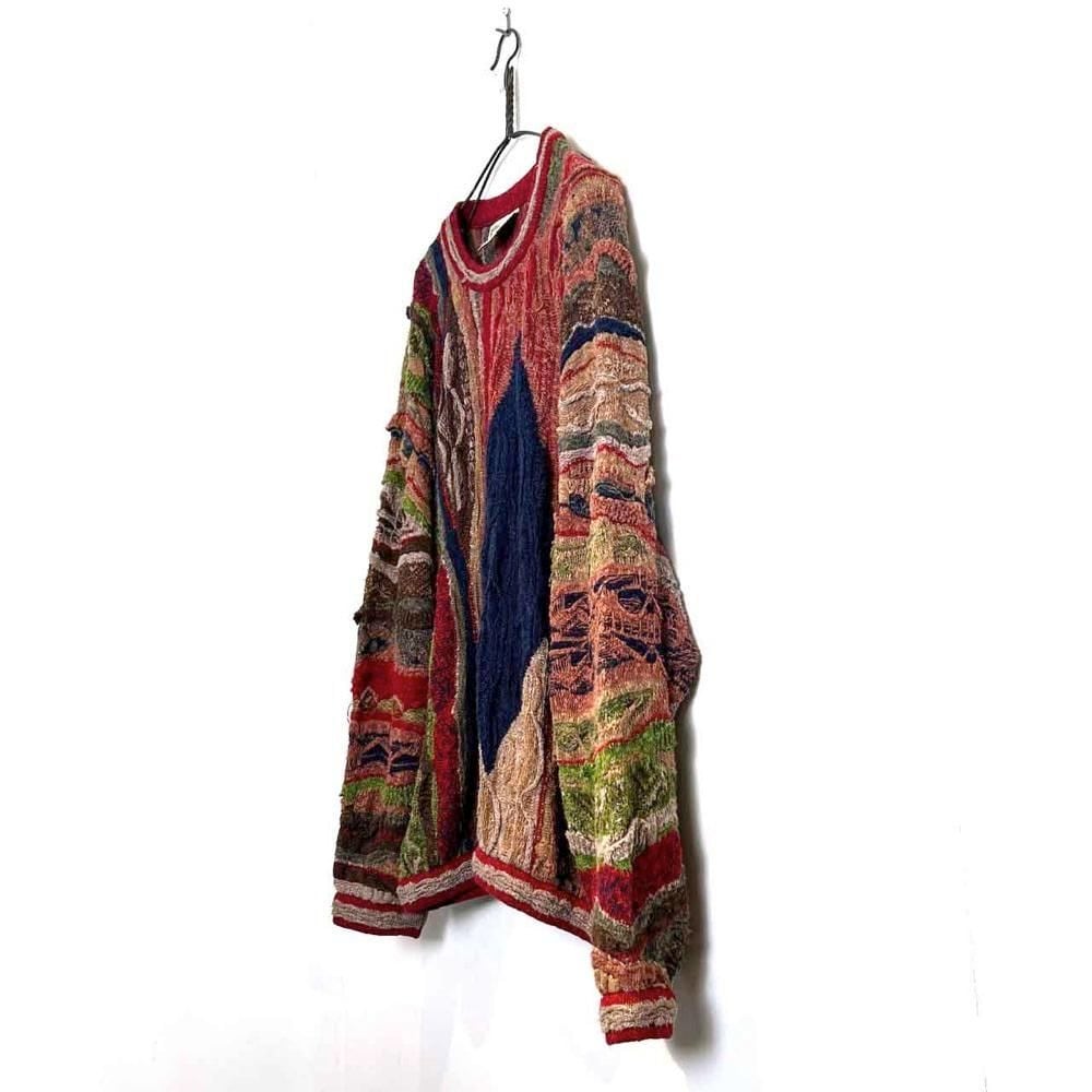 This 90s Coozy crewneck sweater features a muted khaki base color with a mossy, weathered look that gives it a great atmosphere. Made from a cotton and linen blend, it has a soft, smooth feel and boasts Coozys signature high-quality 3-D knit construction. The size is marked as XL, and the relaxed drape creates a great silhouette.