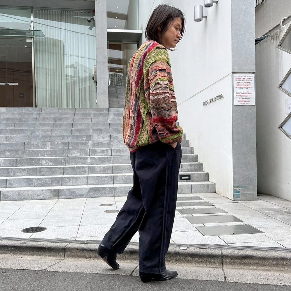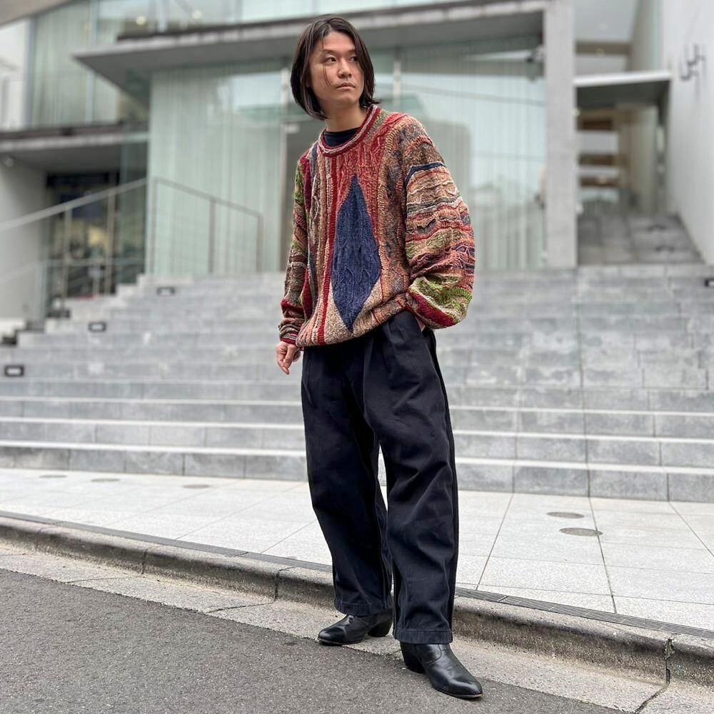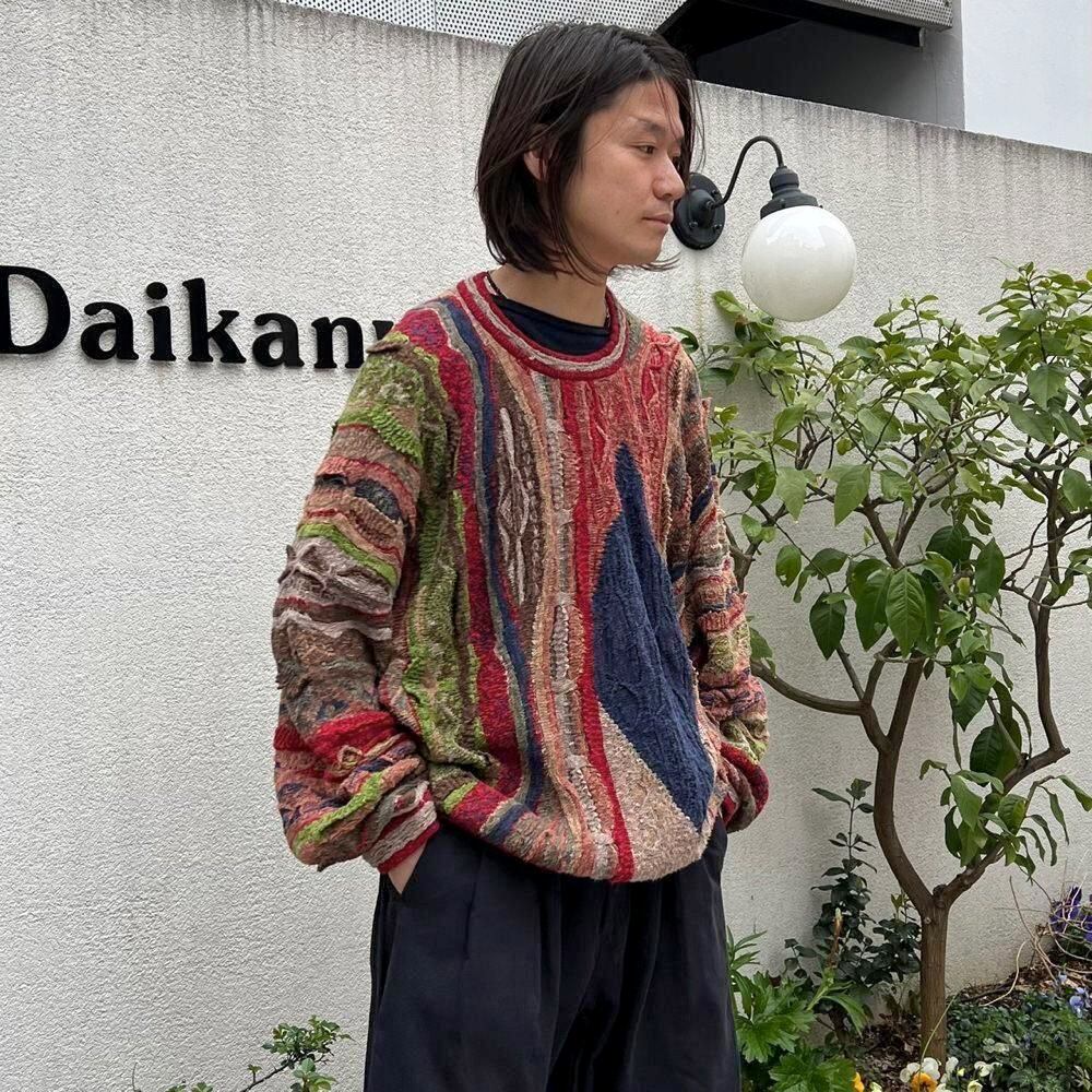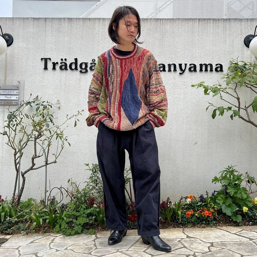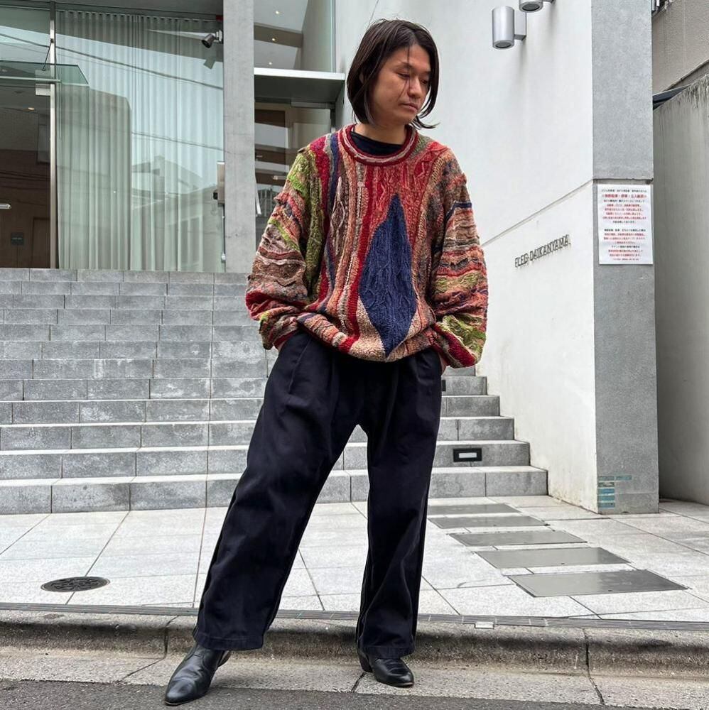 This 90s Coozy crewneck sweater features a muted khaki base color with a mossy, weathered look that gives it a great atmosphere. Made from a cotton and linen blend, it has a soft, smooth feel and boasts Coozys signature high-quality 3-D knit construction. The size is marked as XL, and the relaxed drape creates a great silhouette.