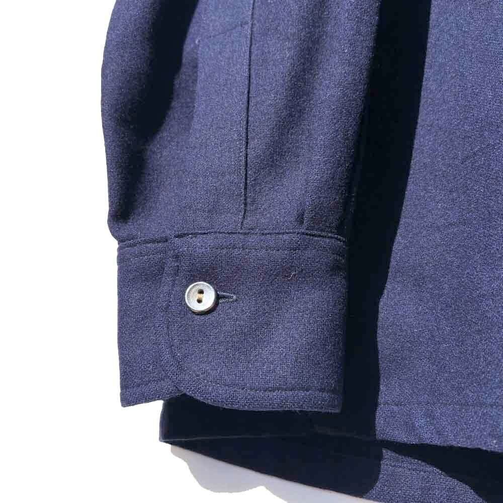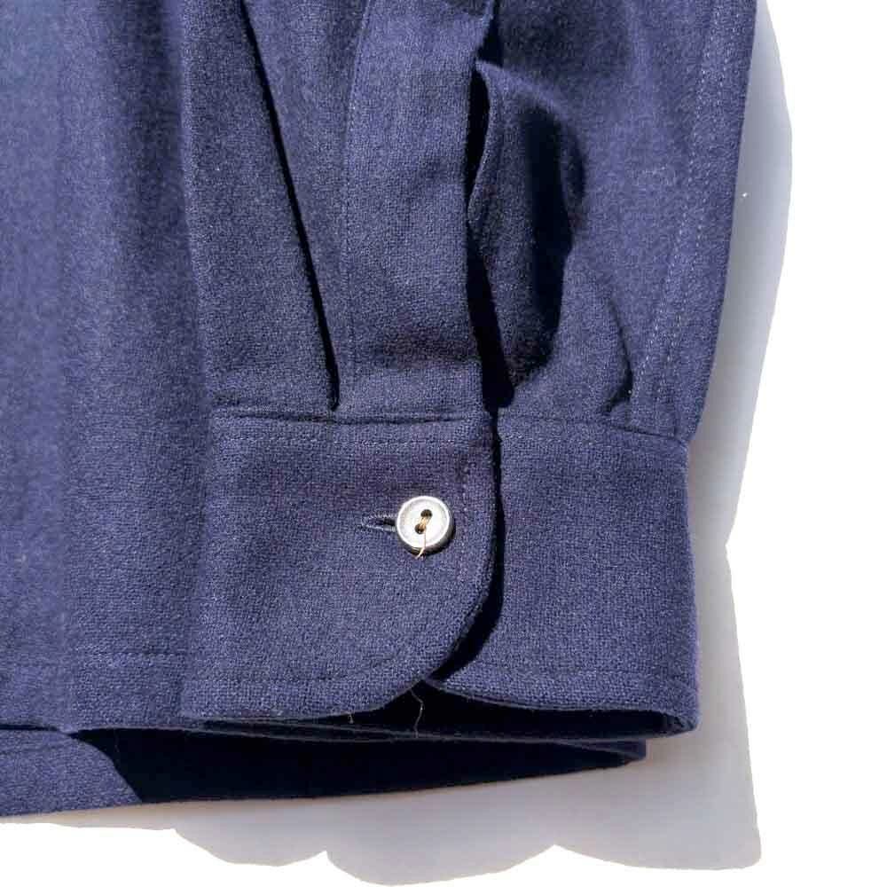 The wool body, in a muted navy tone characteristic of vintage pieces, has a soft and smooth texture. The design, featuring embroidery on the placket, follows a 1950s vintage style while also possessing a sophisticated, somewhat jazzy feel.