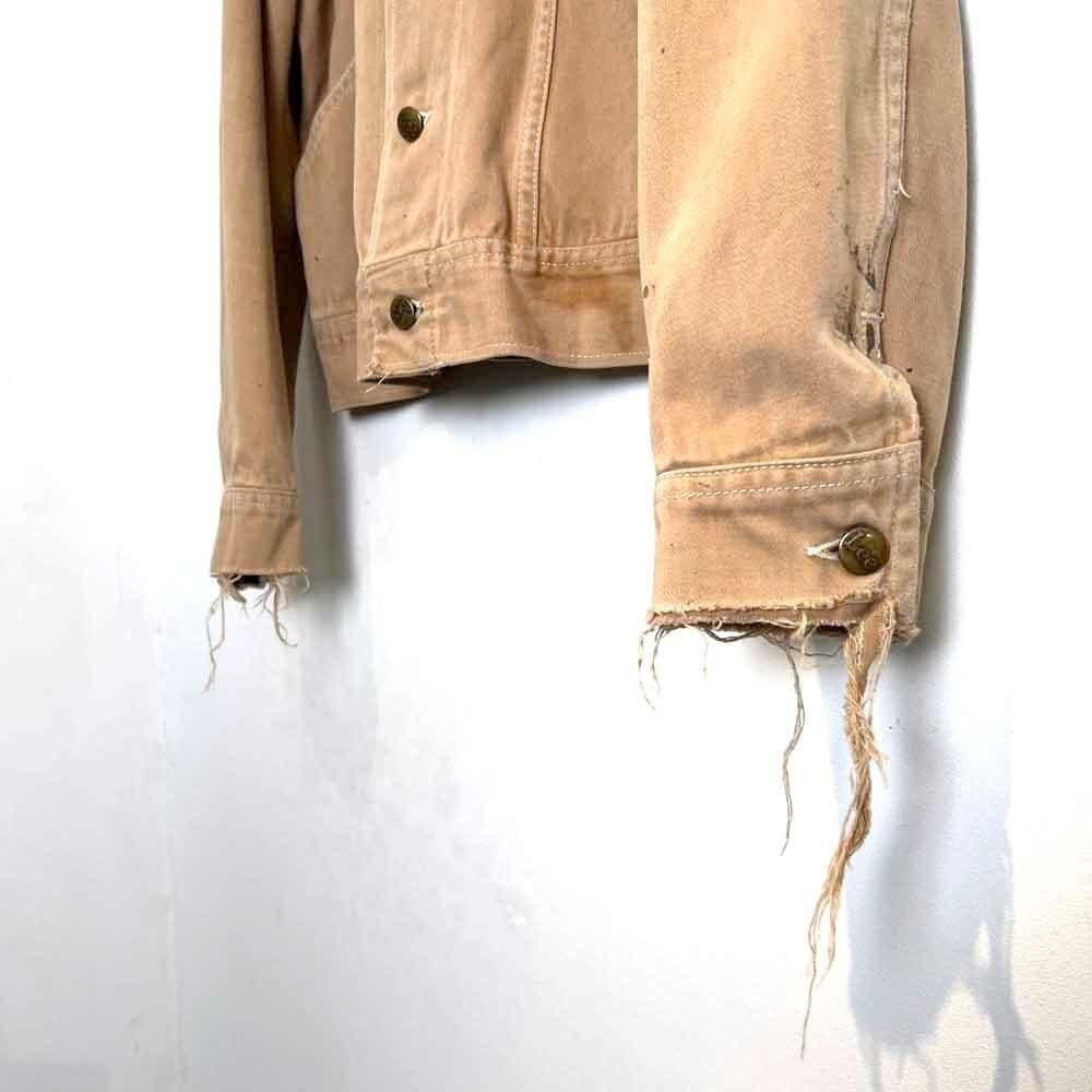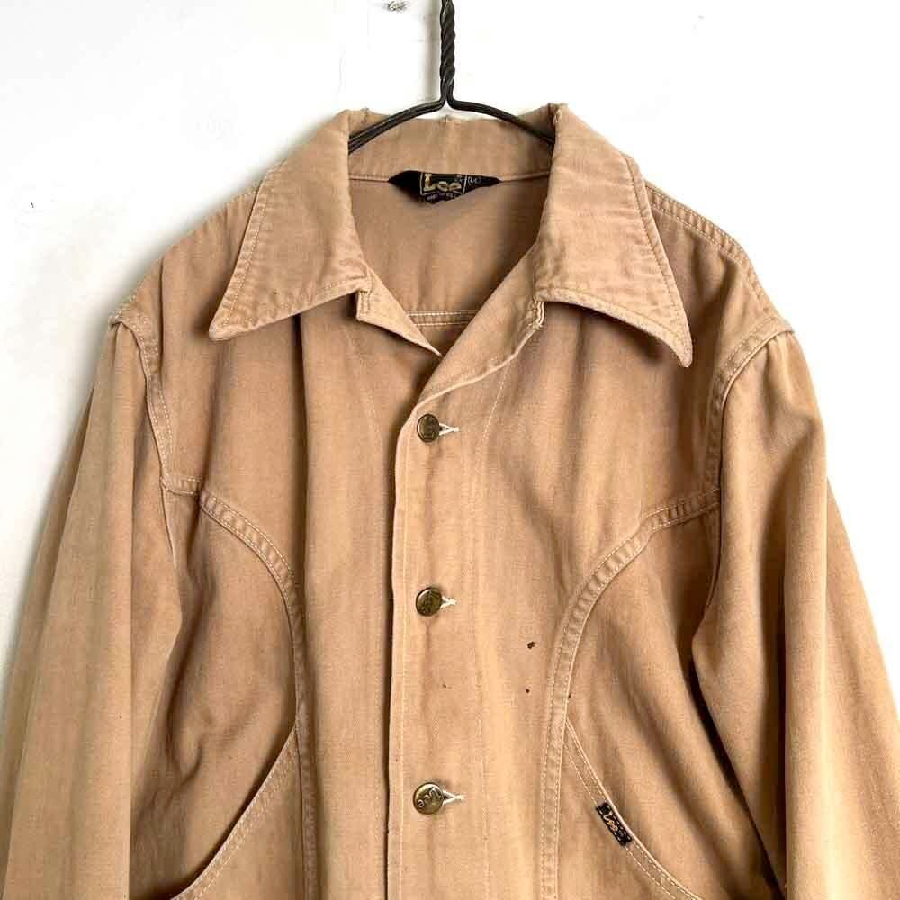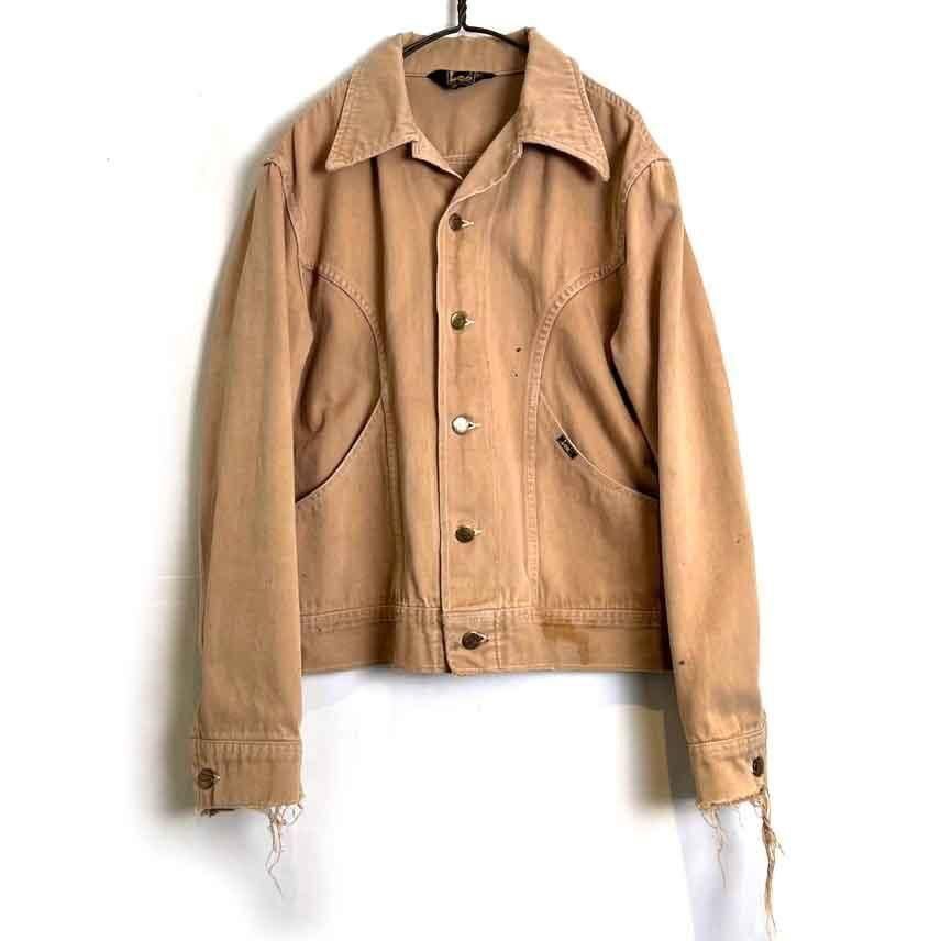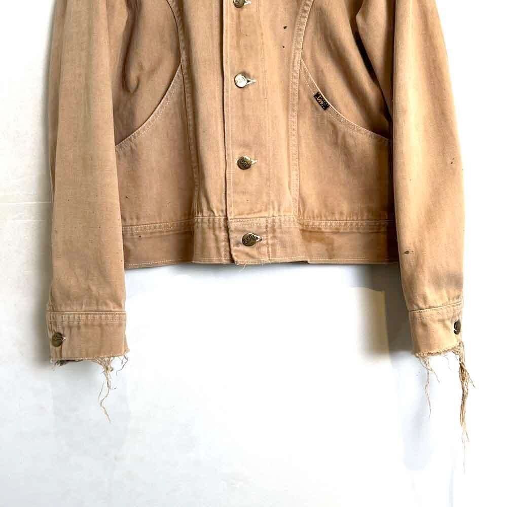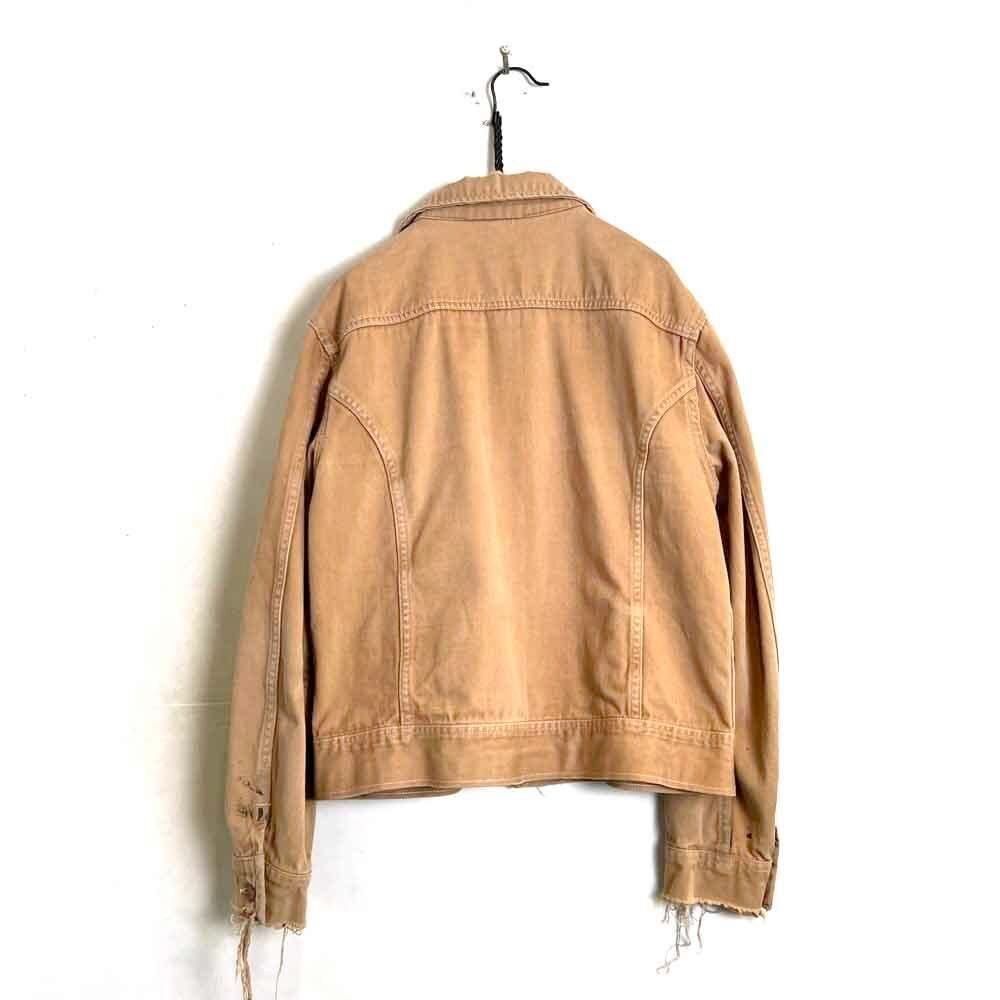 This 70s Lee moleskin trucker jacket has a nice, worn-in look with just the right amount of dirt and damage, a dusty beige color, and a relaxed moleskin texture. Its marked as a size L, offering a comfortable, slightly loose fit while maintaining a clean silhouette.
