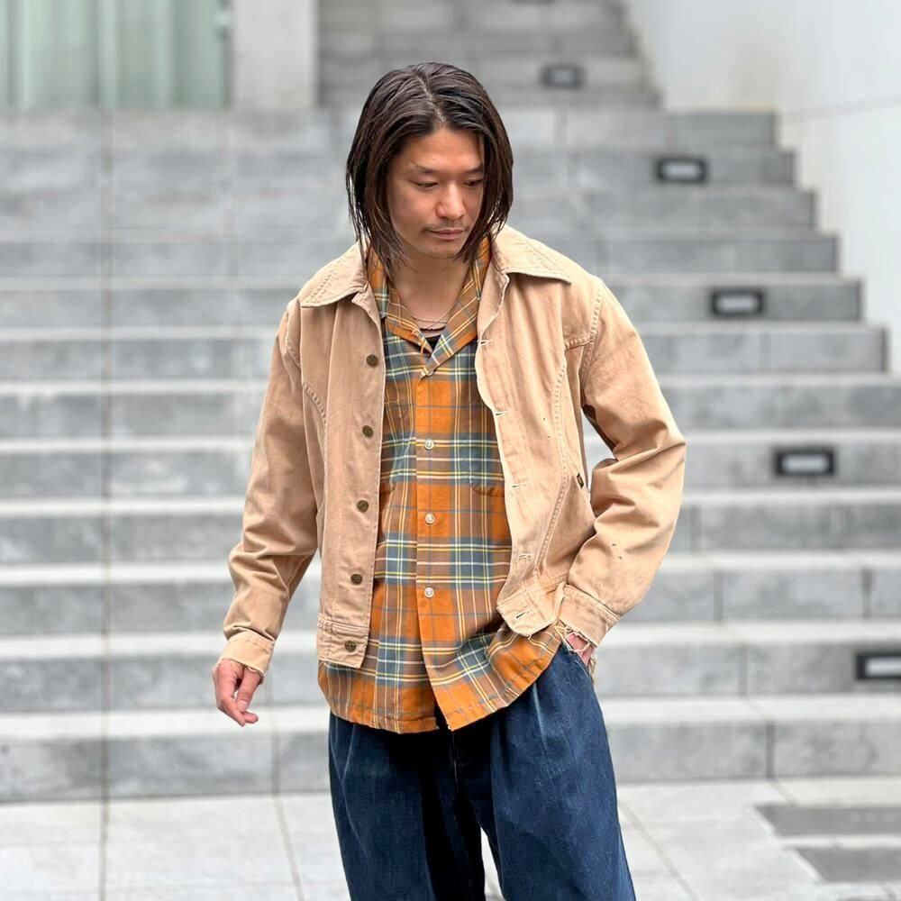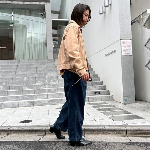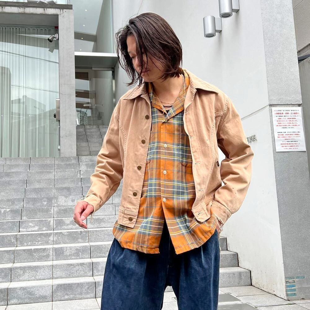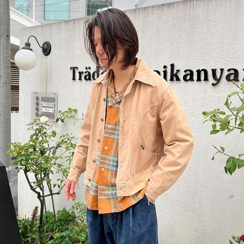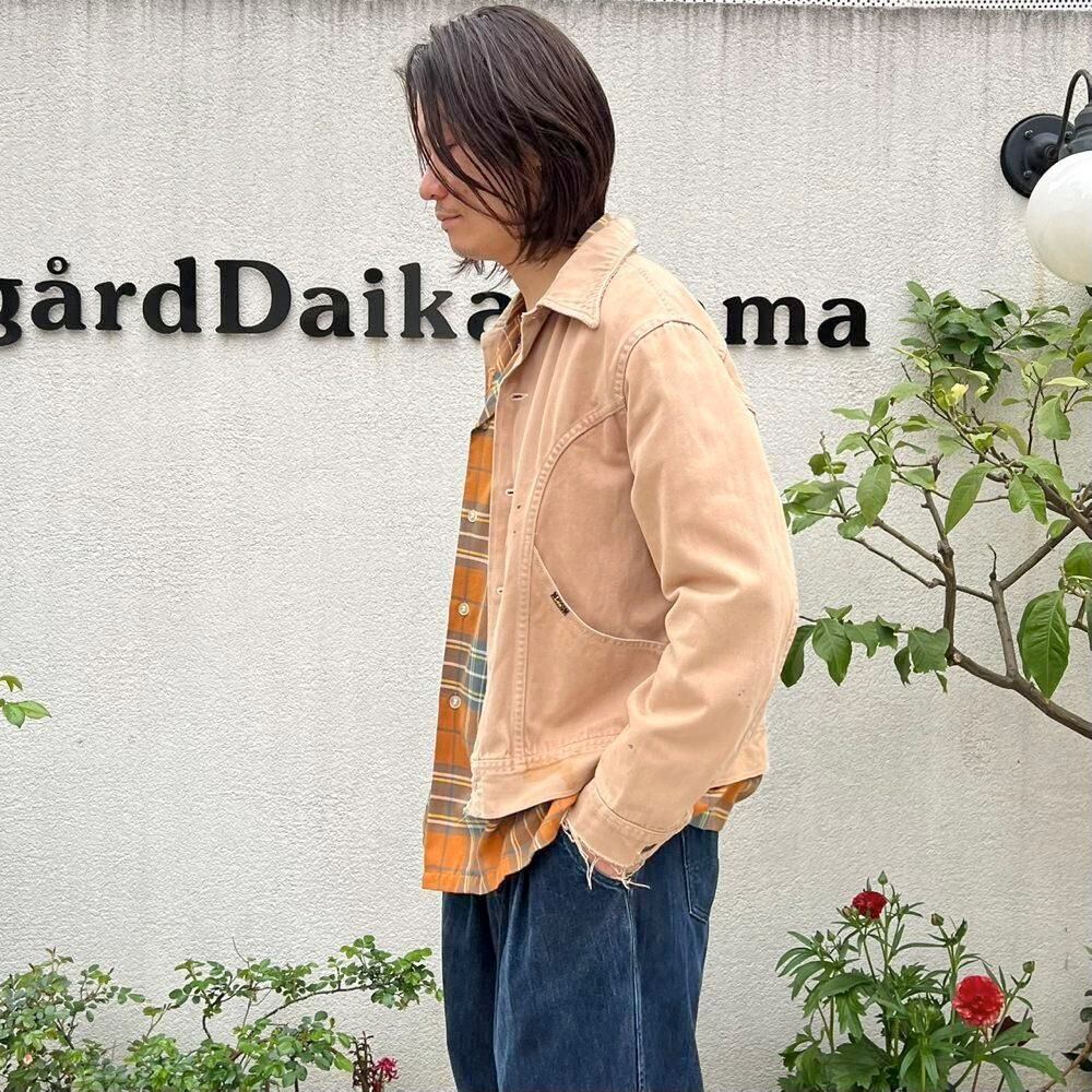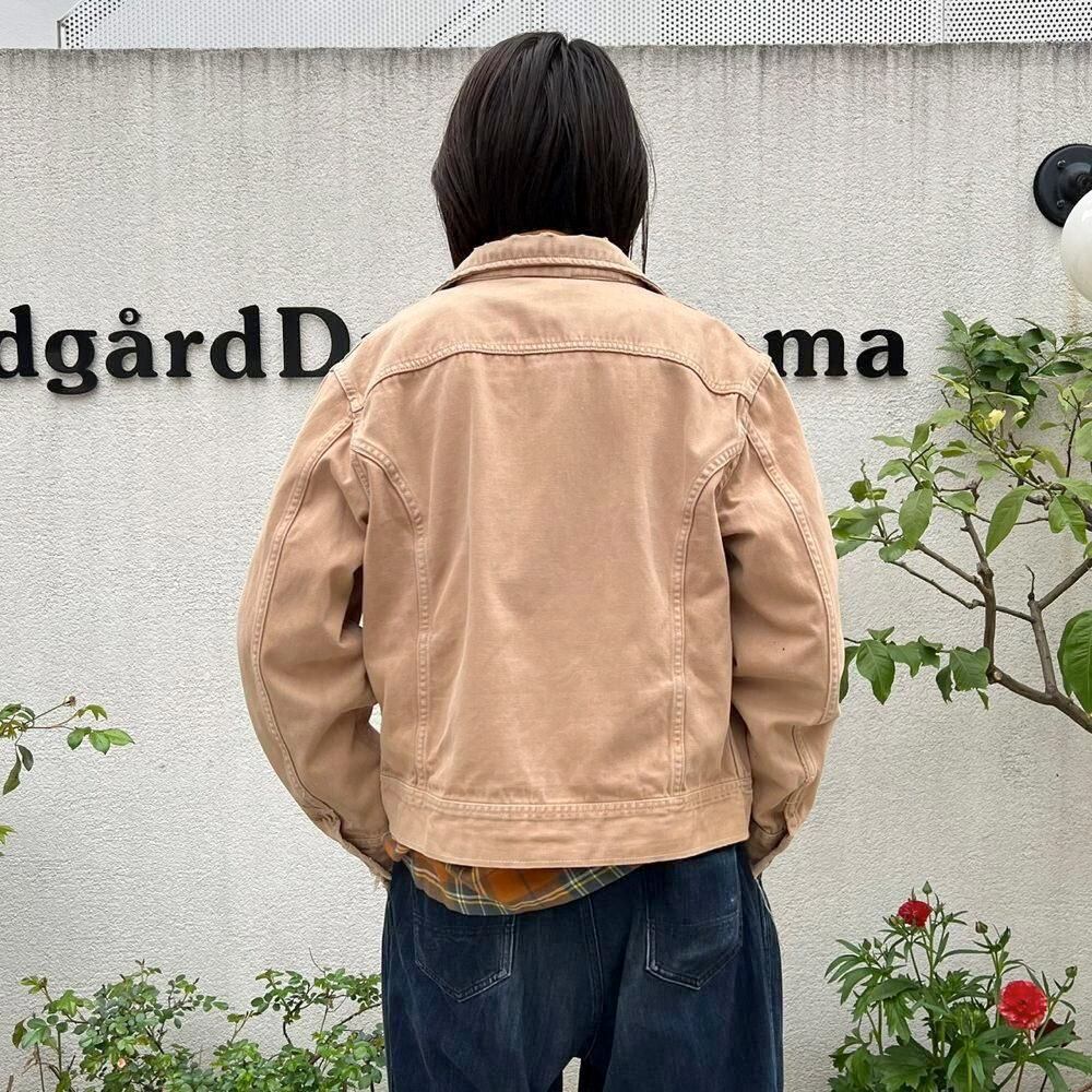This 70s Lee moleskin trucker jacket has a nice, worn-in look with just the right amount of dirt and damage, a dusty beige color, and a relaxed moleskin texture. Its marked as a size L, offering a comfortable, slightly loose fit while maintaining a clean silhouette.