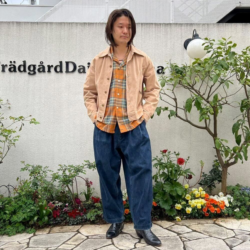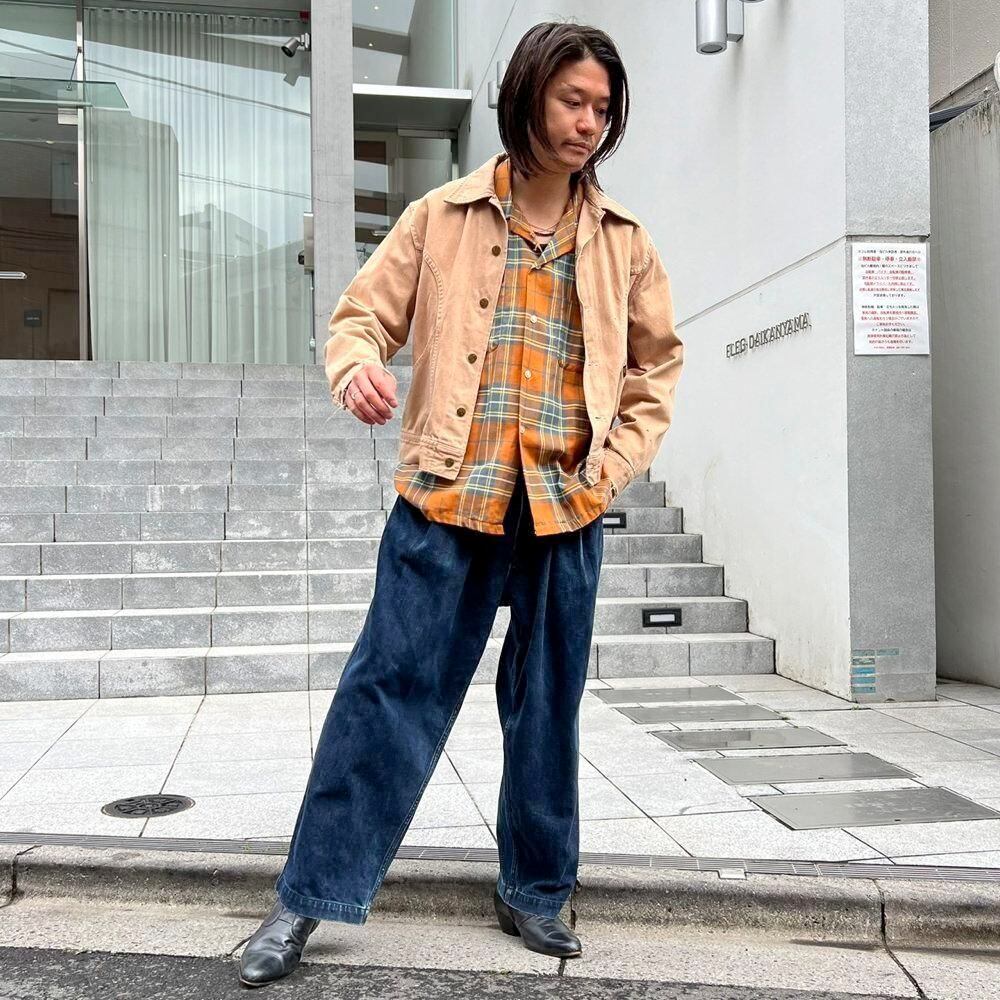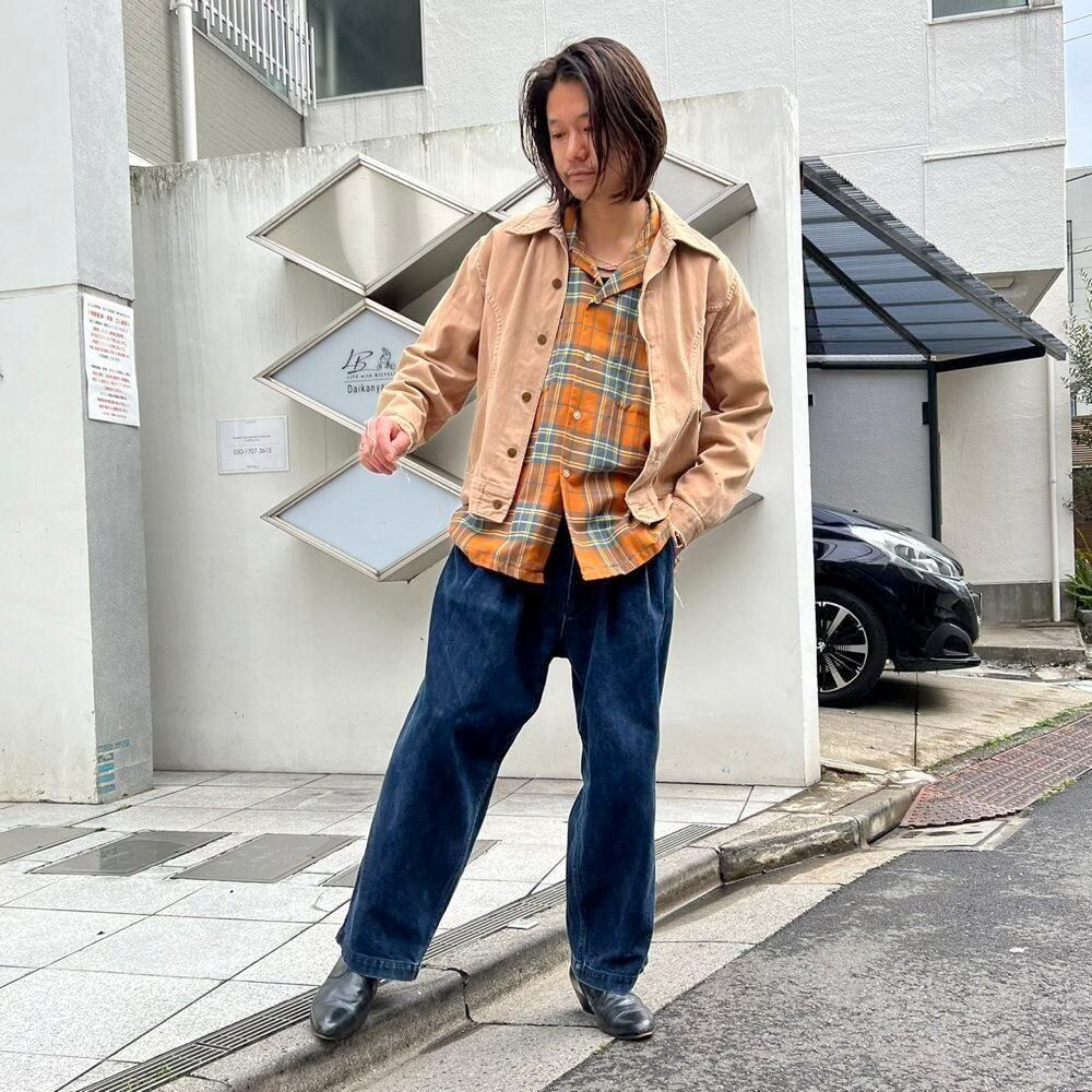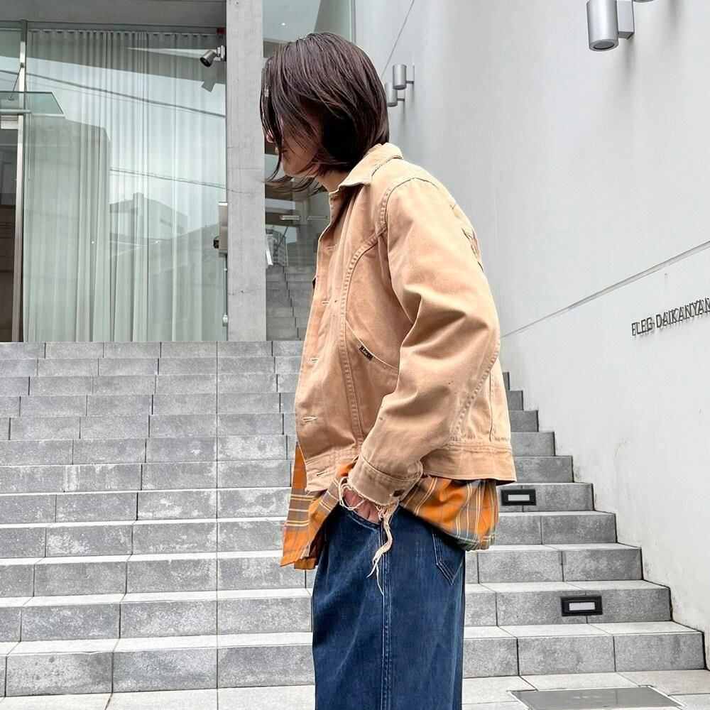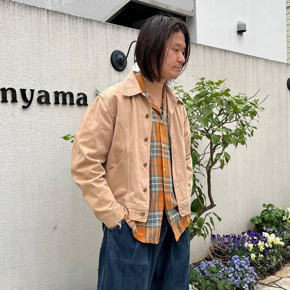 This 70s Lee moleskin trucker jacket has a nice, worn-in look with just the right amount of dirt and damage, a dusty beige color, and a relaxed moleskin texture. Its marked as a size L, offering a comfortable, slightly loose fit while maintaining a clean silhouette.