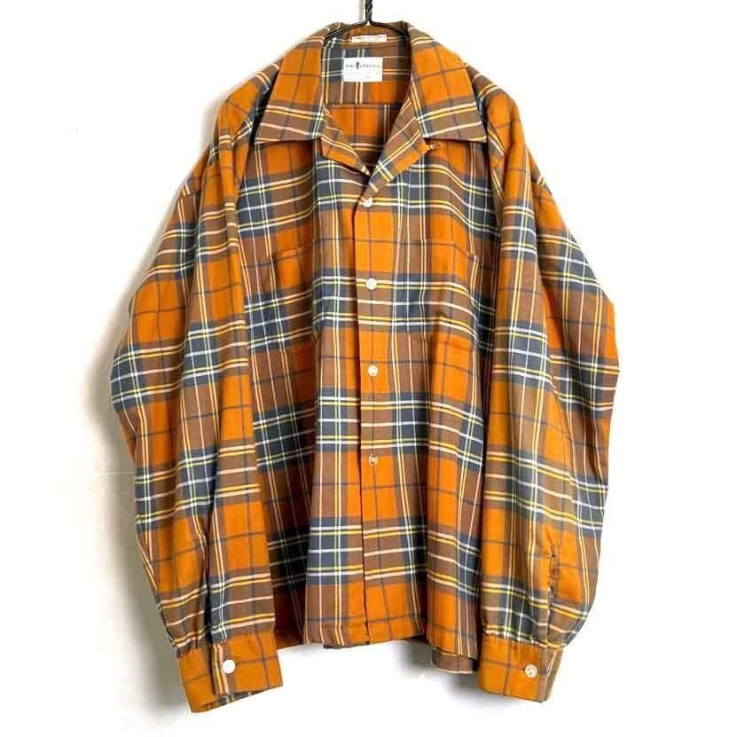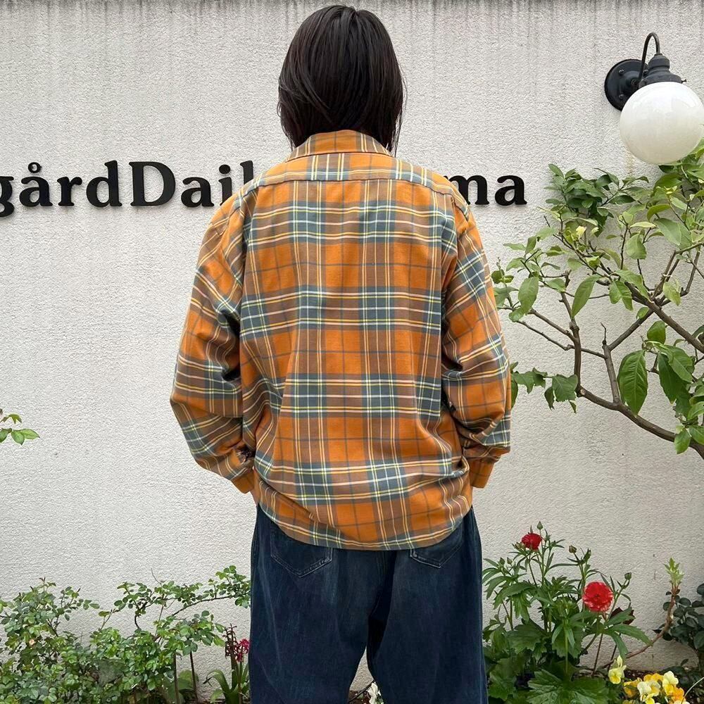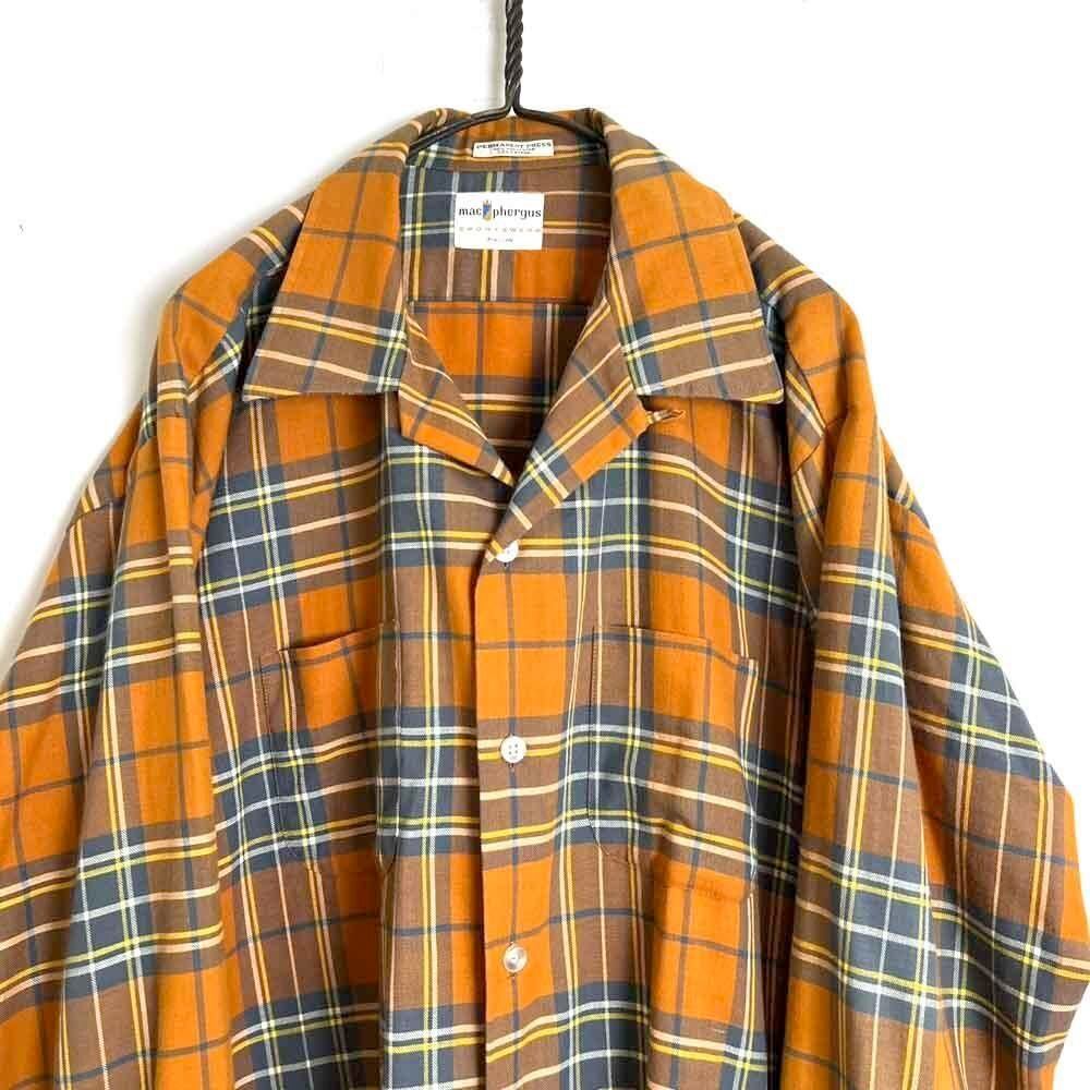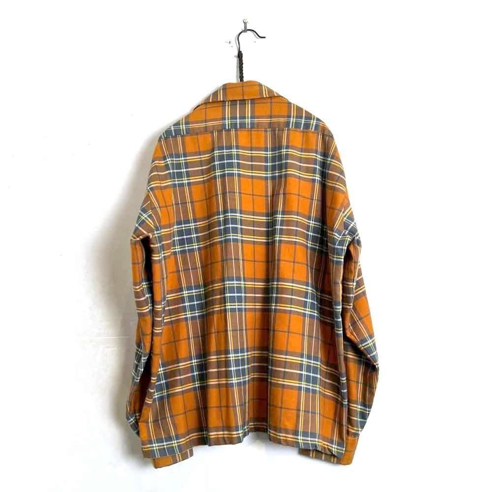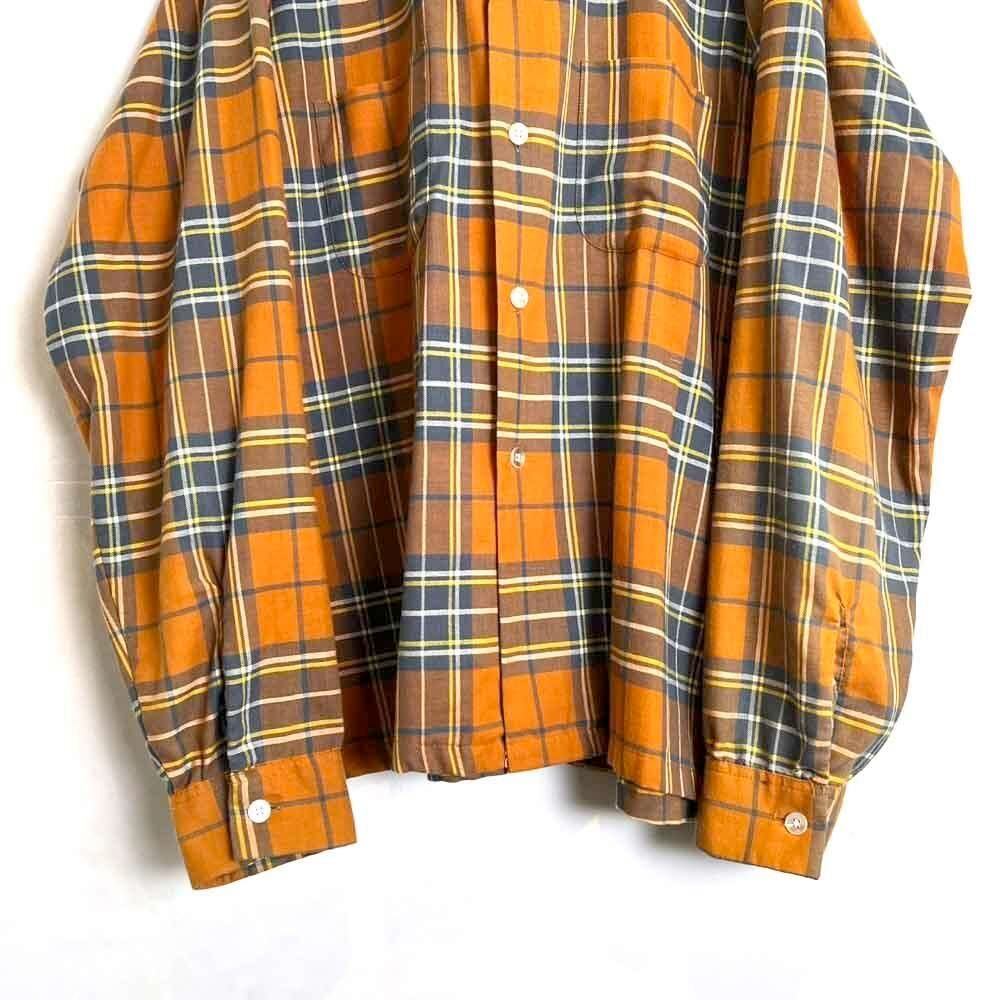 This 70s loop-collar shirt features a muted khaki-orange and gray check pattern with an earthy feel. Made from a 50/50 cotton/polyester blend fabric, it has a comfortable weight—not too thick, not too thin—making it a versatile piece for all seasons. The size is marked as 17.5 (XL), a good size for a relaxed fit.