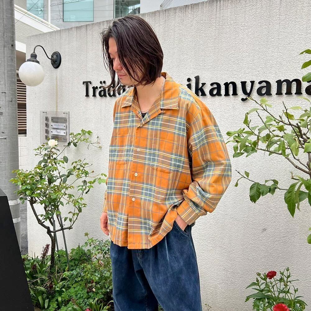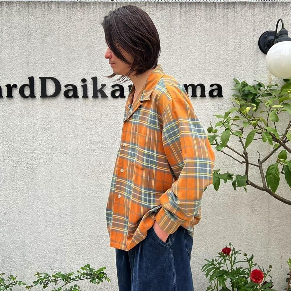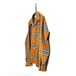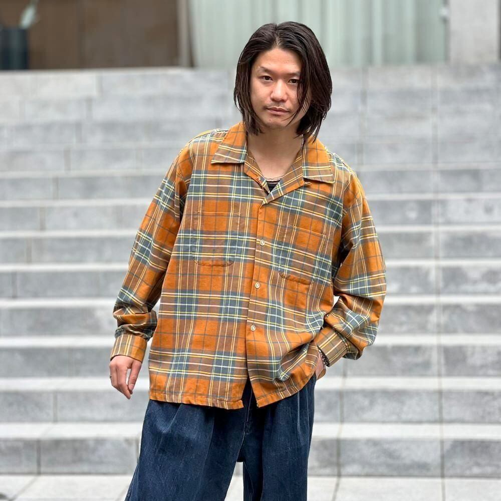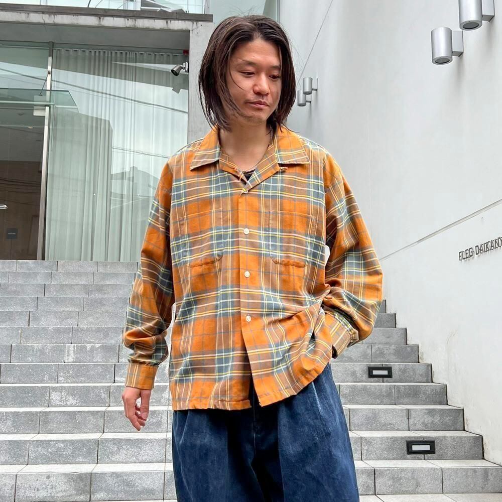 This 70s loop-collar shirt features a muted khaki-orange and gray check pattern with an earthy feel. Made from a 50/50 cotton/polyester blend fabric, it has a comfortable weight—not too thick, not too thin—making it a versatile piece for all seasons. The size is marked as 17.5 (XL), a good size for a relaxed fit.