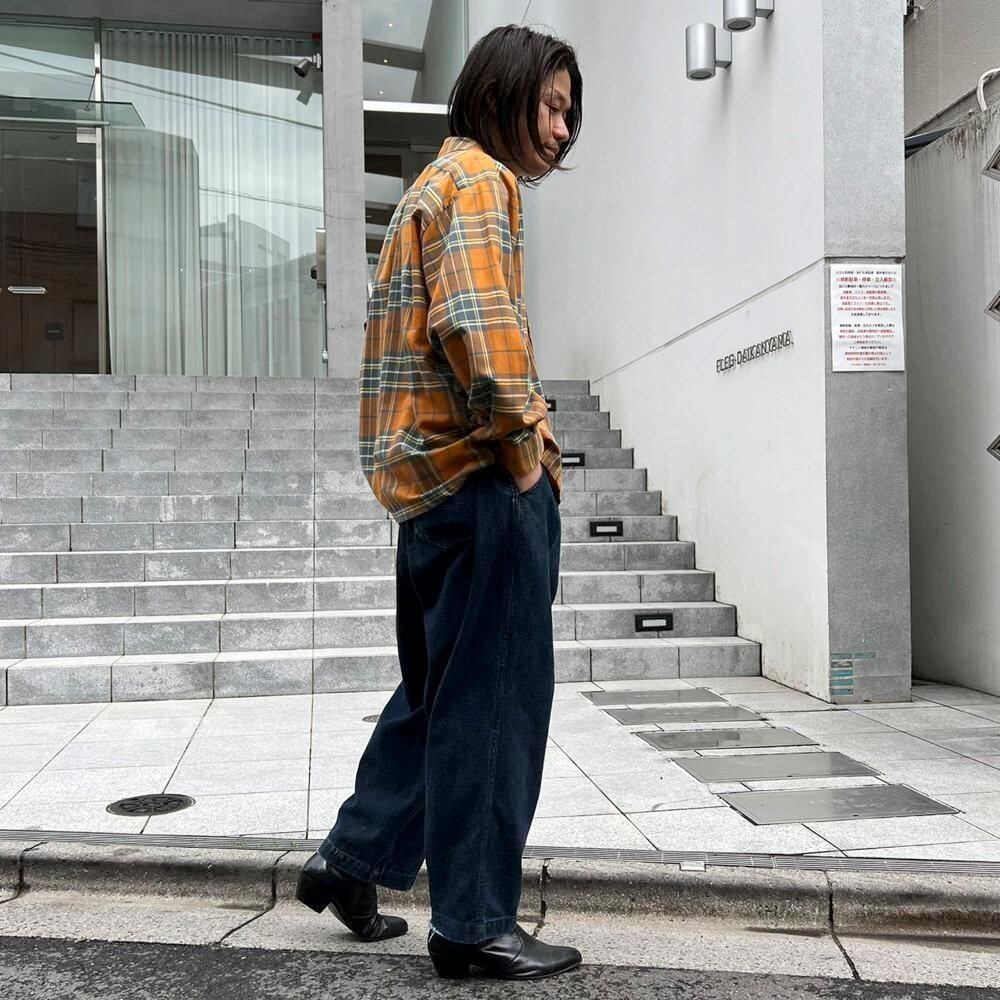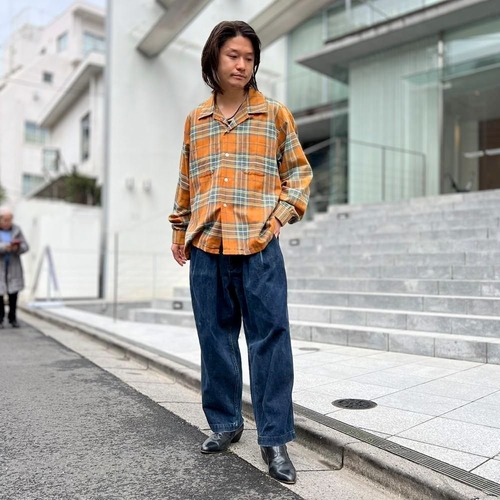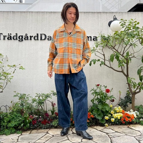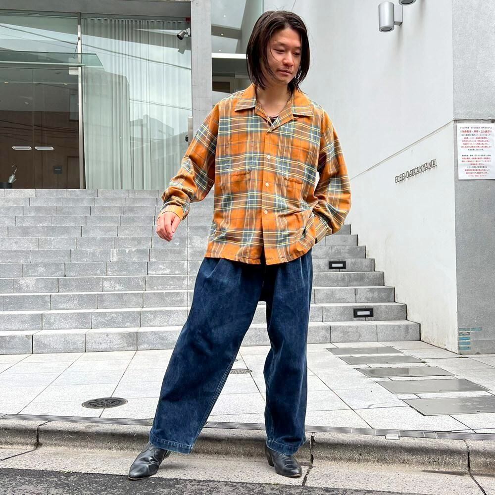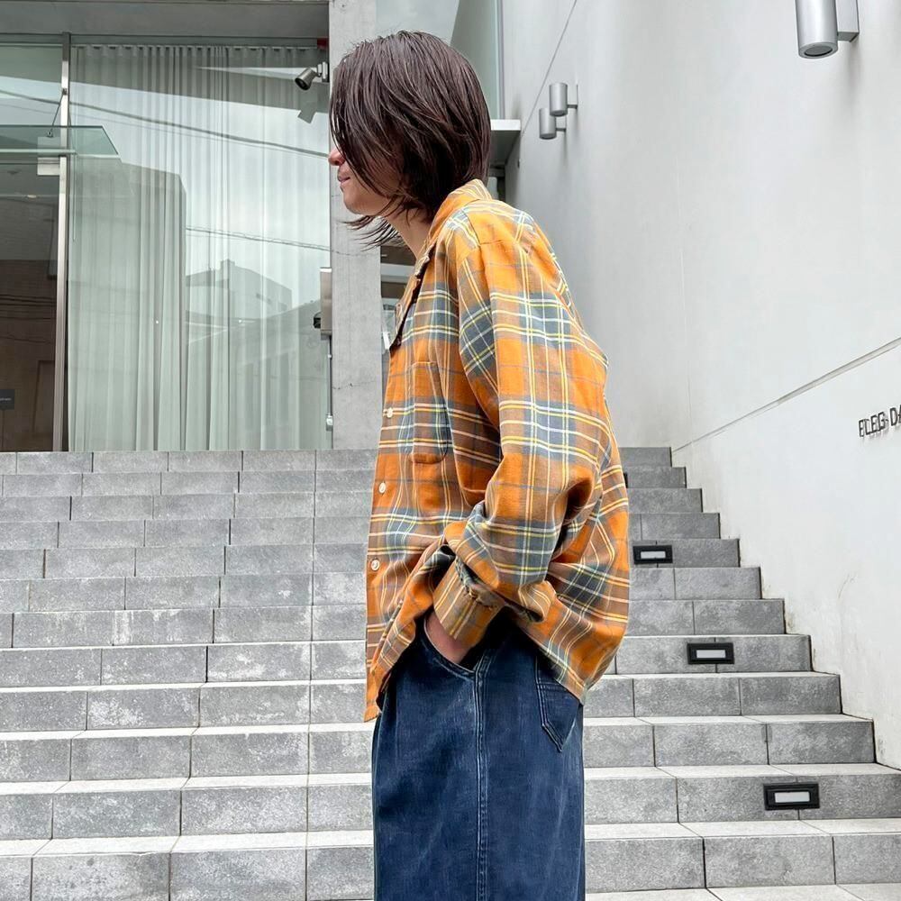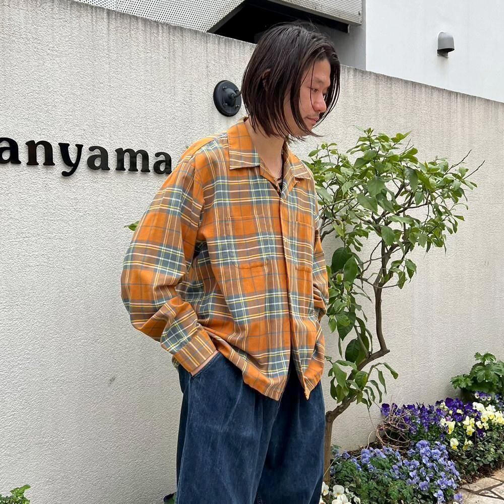 This 70s loop-collar shirt features a muted khaki-orange and gray check pattern with an earthy feel. Made from a 50/50 cotton/polyester blend fabric, it has a comfortable weight—not too thick, not too thin—making it a versatile piece for all seasons. The size is marked as 17.5 (XL), a good size for a relaxed fit.