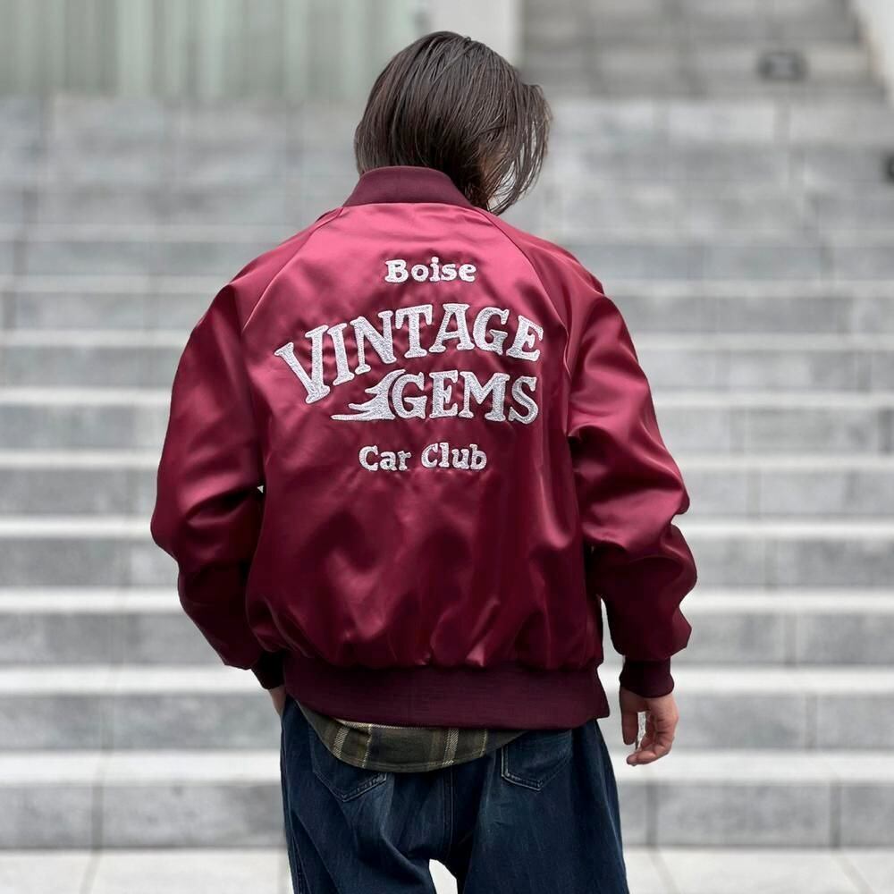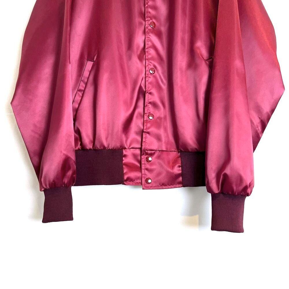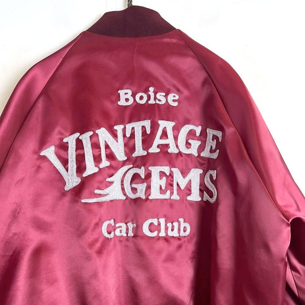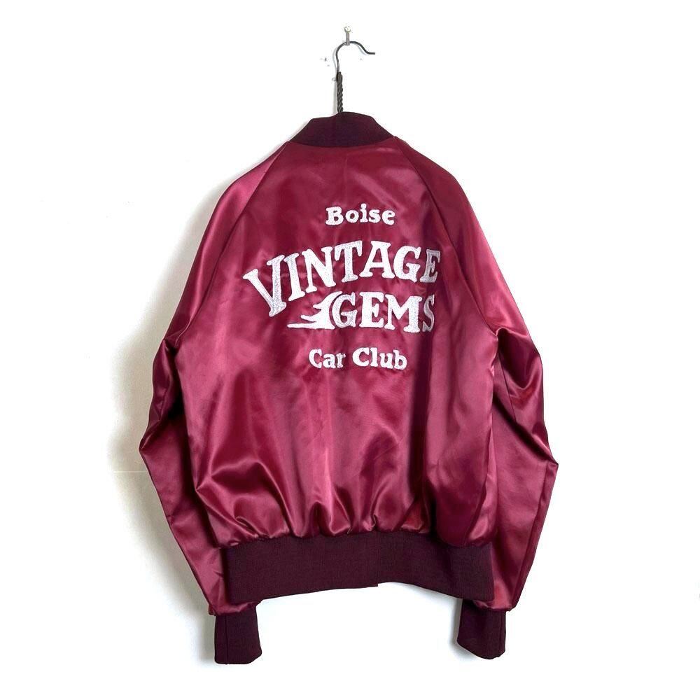 This 1980s nylon satin jacket features embroidery of a car club that still exists in Boise, Idaho, on the back. The sensual burgundy satin fabric perfectly complements the embroidery, making it a truly unique piece. Its marked as a size L, a good size with just the right amount of room.