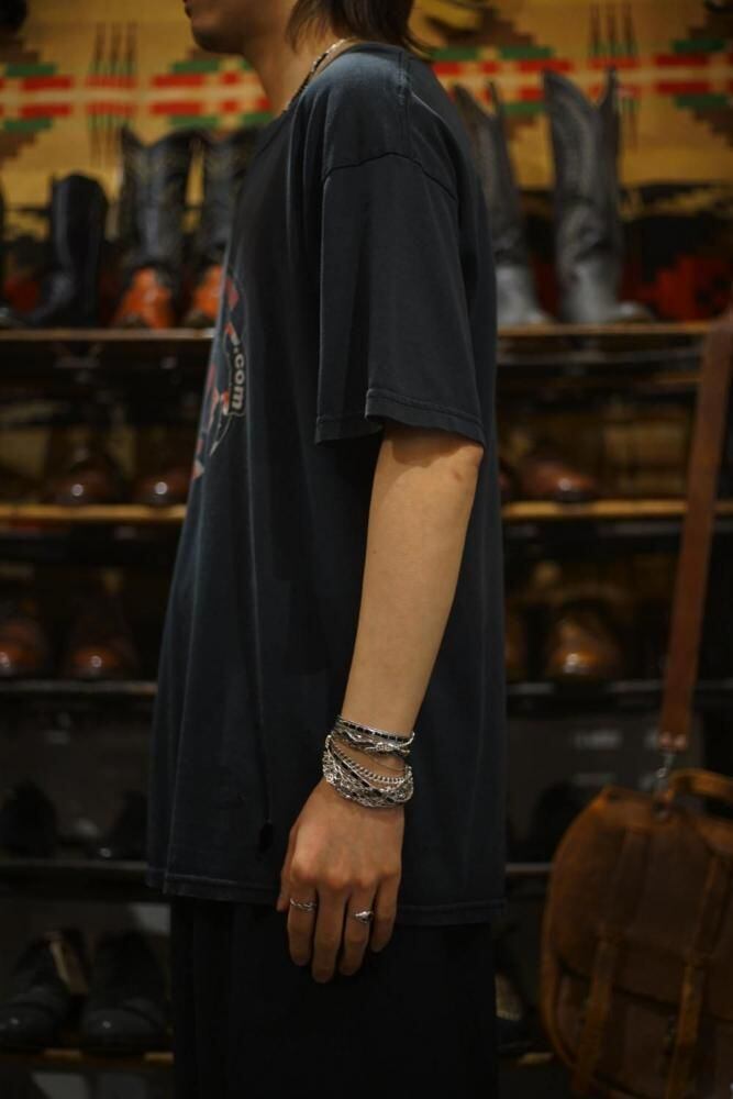 This exceptional item boasts a unique presence thanks to its faded black body and worn-out print.