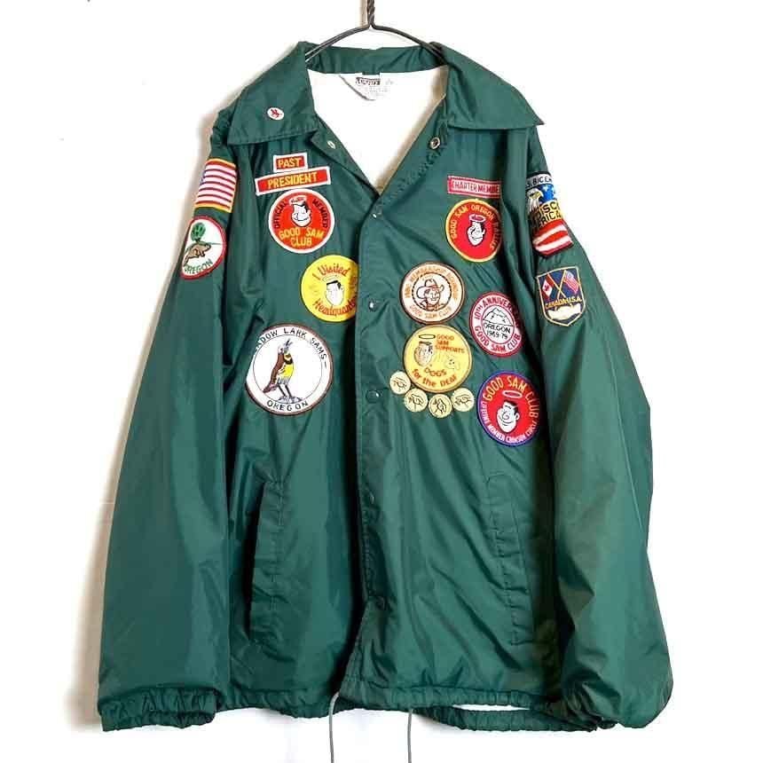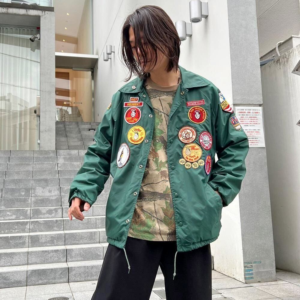 This 1970s nylon coach jacket is adorned with a variety of well-designed patches on the front, back, and sleeves, making it a lively and practical piece for layering during this season. The body is made by Montgomery Ward, and the size is marked as L, offering a comfortable, relaxed fit and a great silhouette.