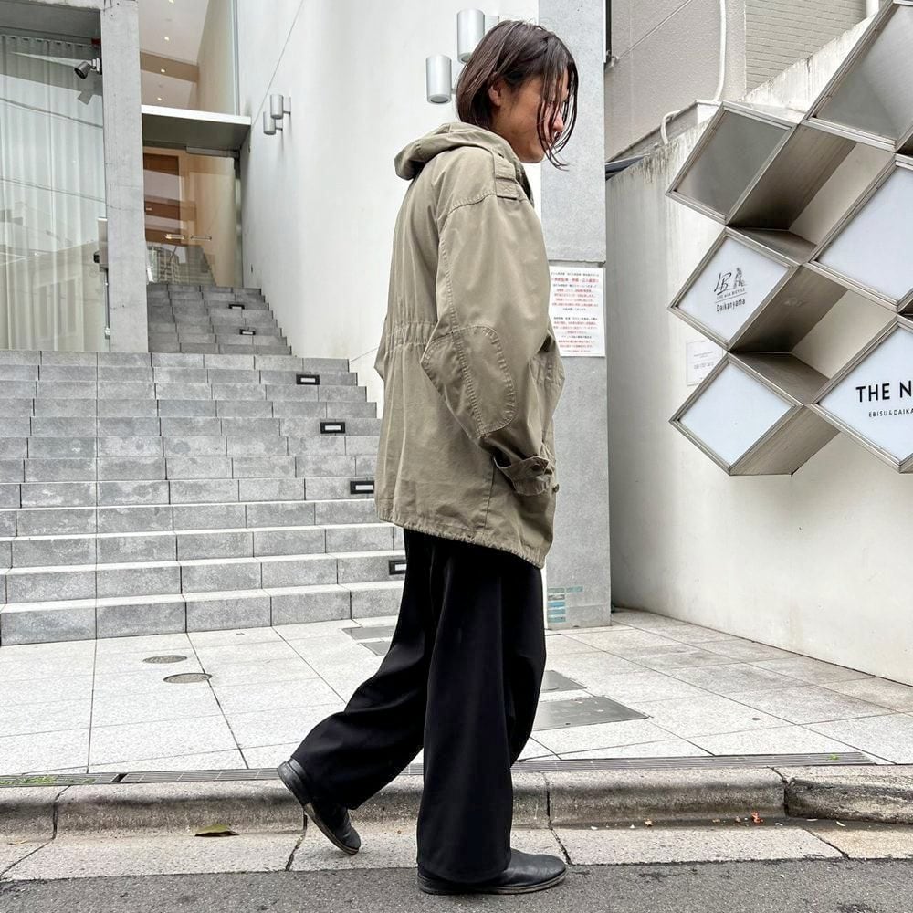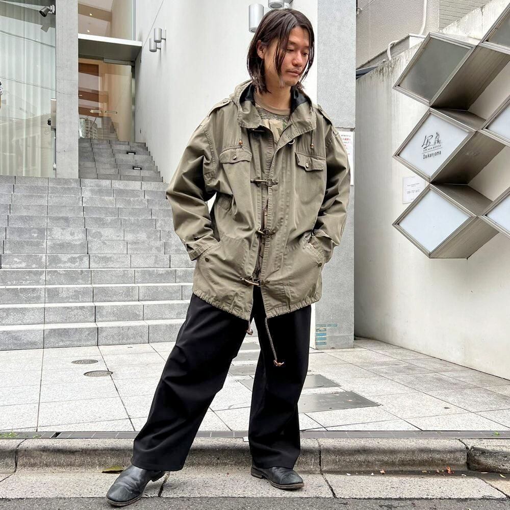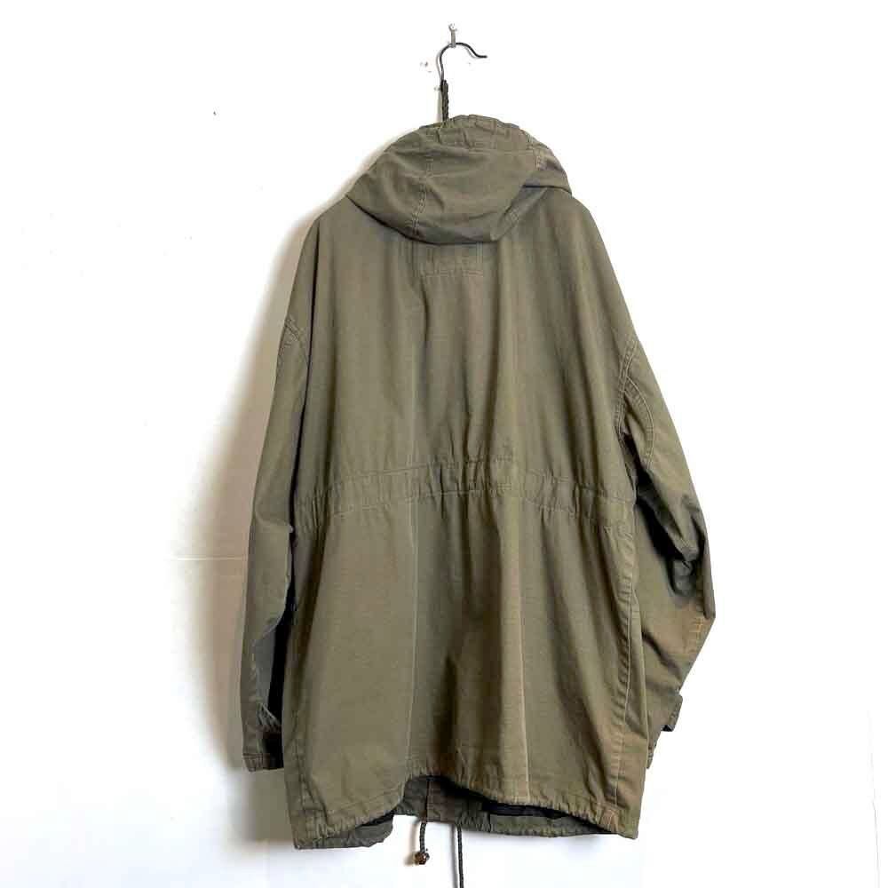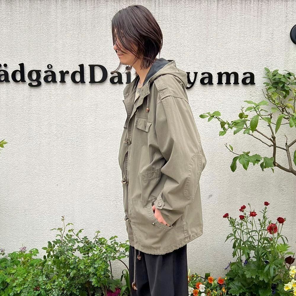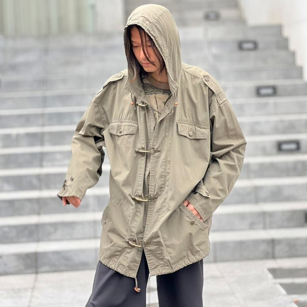This 90s cotton sailing jacket features a military-inspired grayish-olive color and a toggle closure at the front, giving it a substantial feel reminiscent of a firemans jacket. Made from a lightweight, single-layer cotton fabric, its surprisingly light and comfortable to wear. It has a relaxed silhouette that can be easily thrown on.