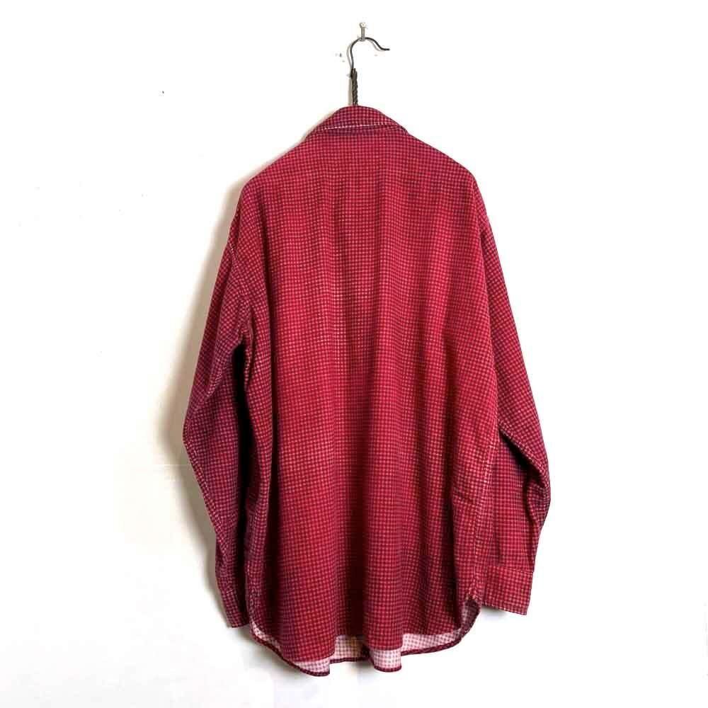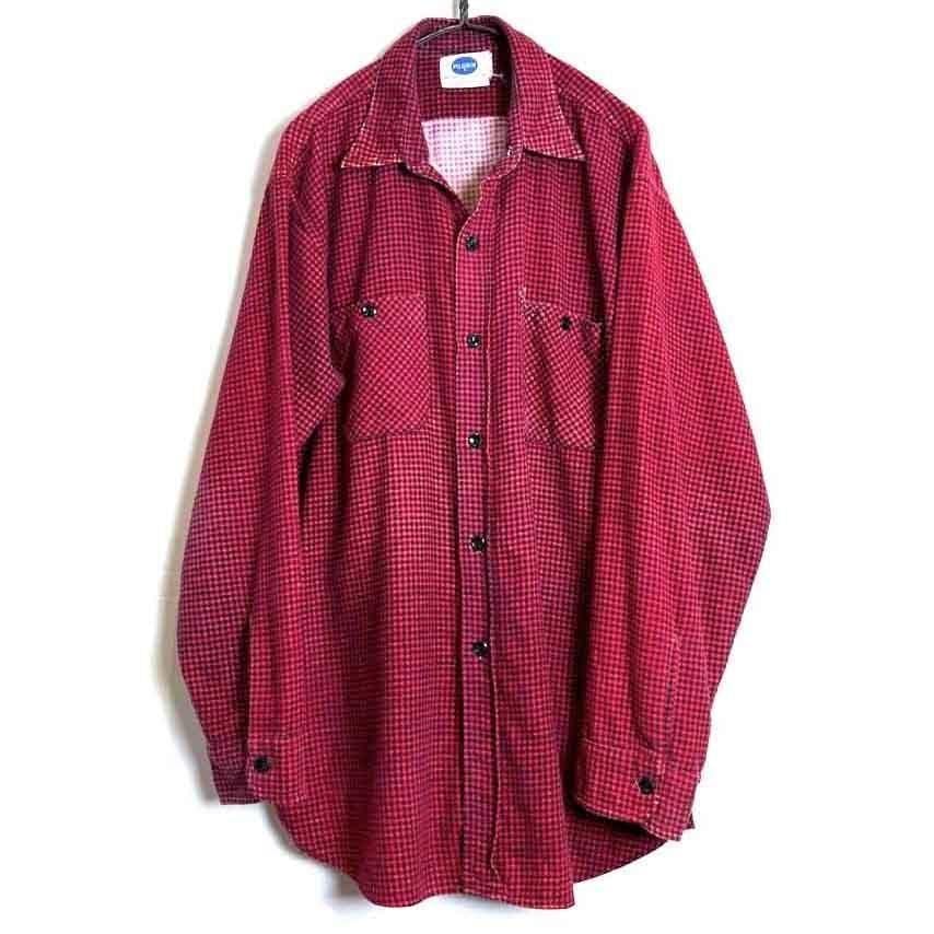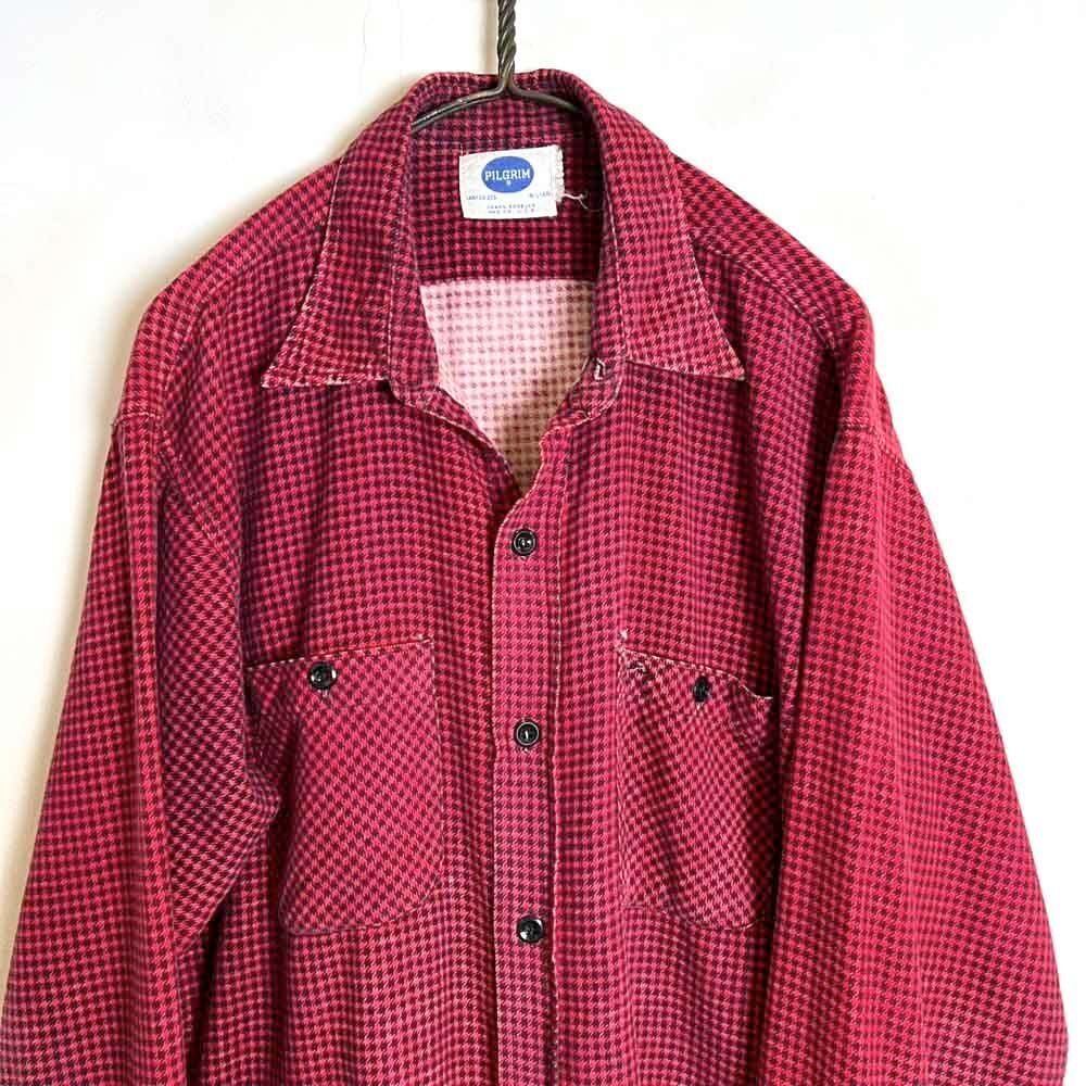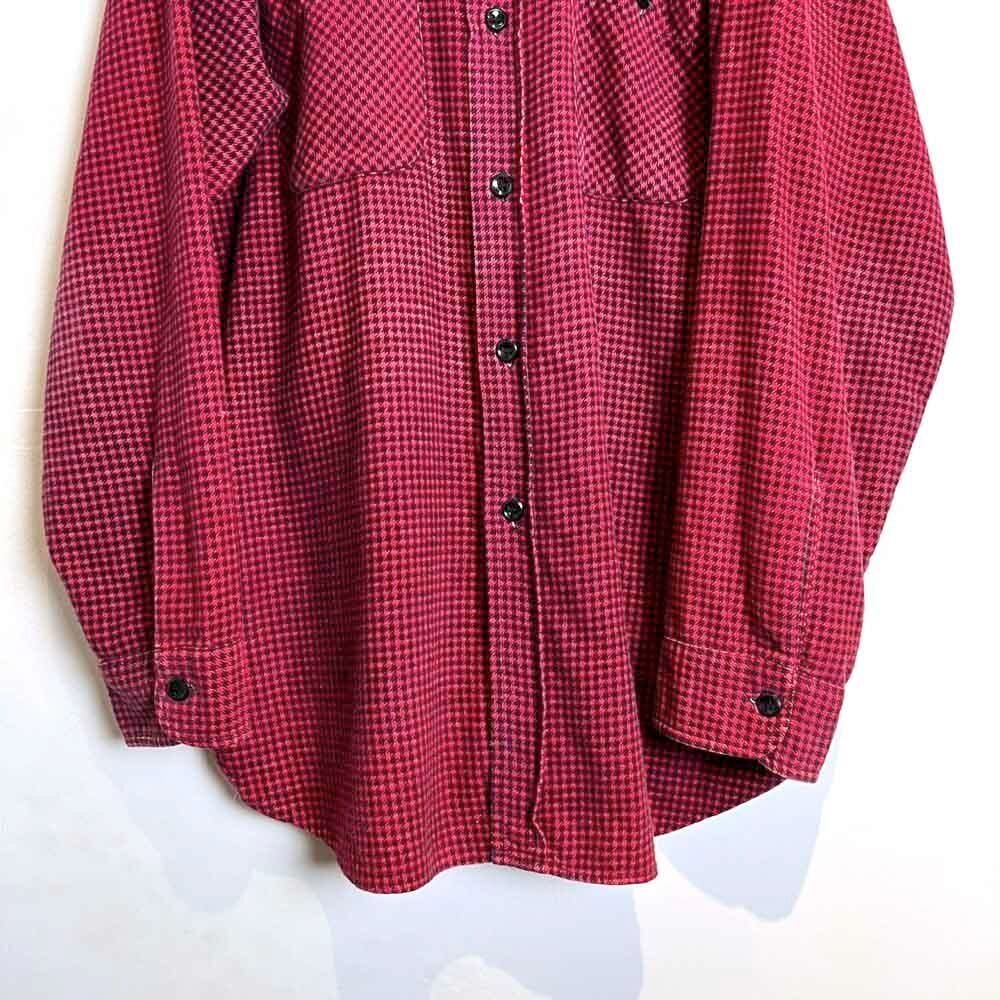 A 1950s Pilgrim cotton flannel shirt with gussets. The red and black houndstooth check pattern has a beautifully faded look due to age. The size is marked as 16 1/2 (L), a rare relaxed silhouette for a vintage shirt. Made from soft and comfortable 100% cotton flannel fabric.