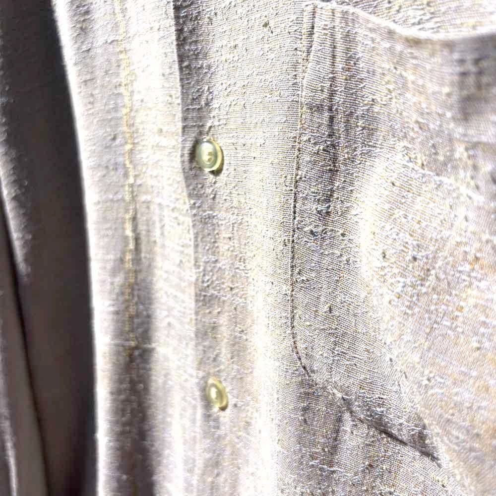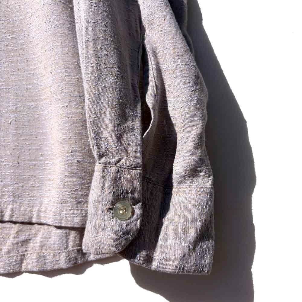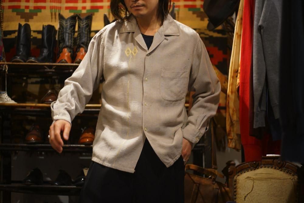 The vintage-style muted greige body, the slub texture running vertically and horizontally, and the double diamond geometric embroidery on the right chest, using heavy, vintage-style thread, create a sophisticated and alluring look characteristic of American mid-century style, with the addition of the subtly lustrous embroidery to the simple gray body.