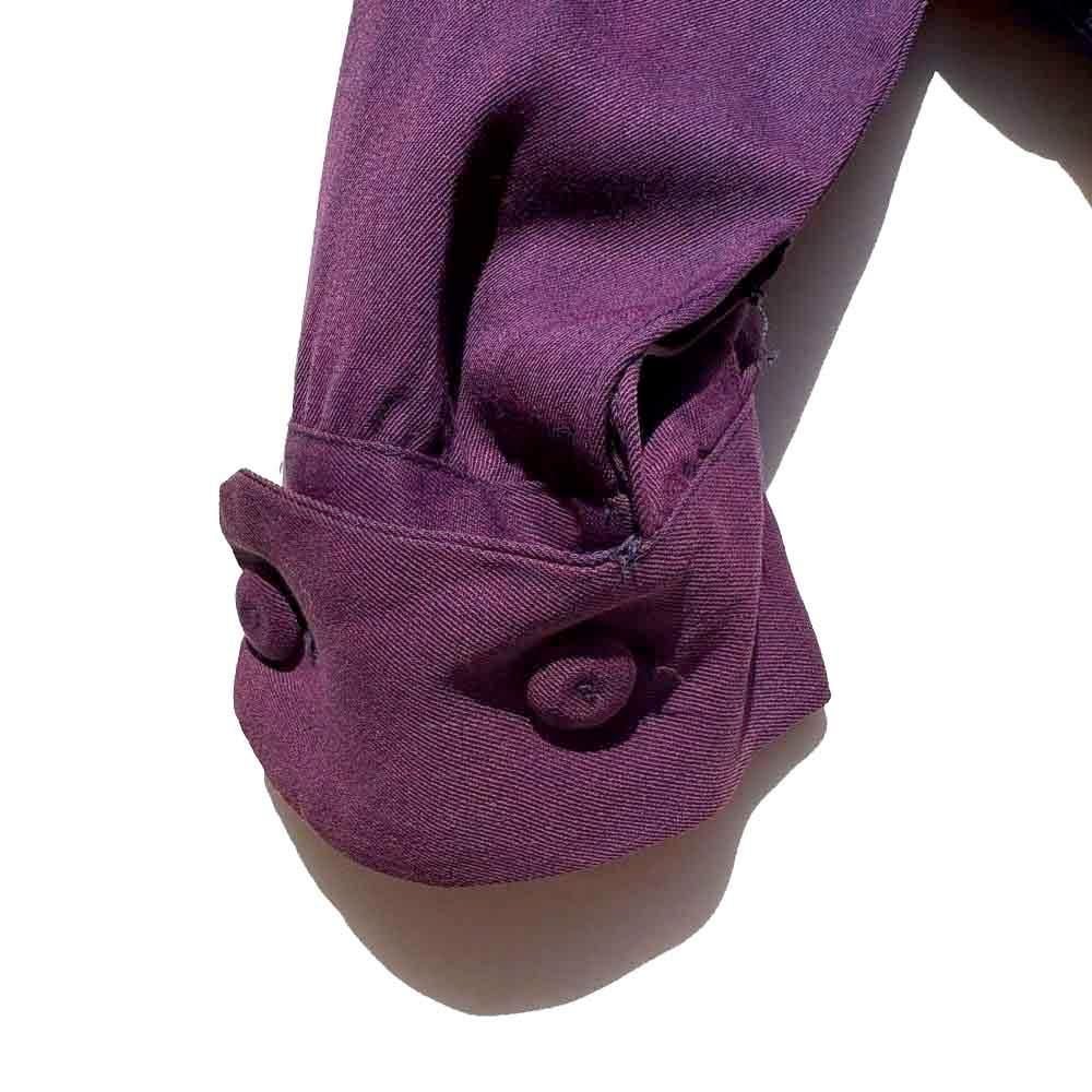 The deep purple rayon gabardine exudes an alluring atmosphere, while avant-garde yellow-beige striped panels are cut in a V-shape, creating a contrasting color scheme that gives it a seductive look characteristic of the American Mid-Century period.
