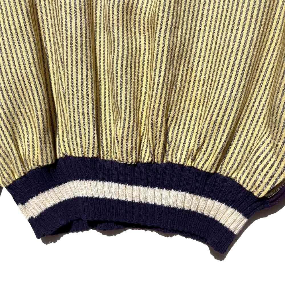 The luxurious fabric-covered buttons and the striped ribbed hem create a blouson effect, completing the distinctive 1950s boxy silhouette.