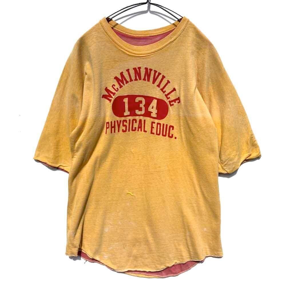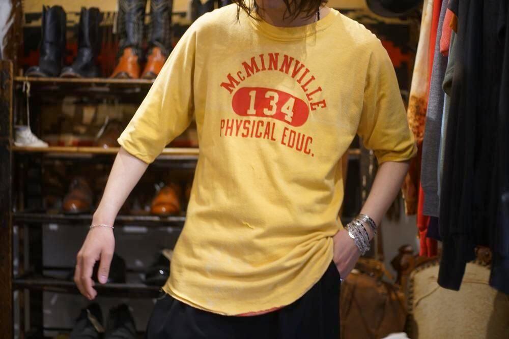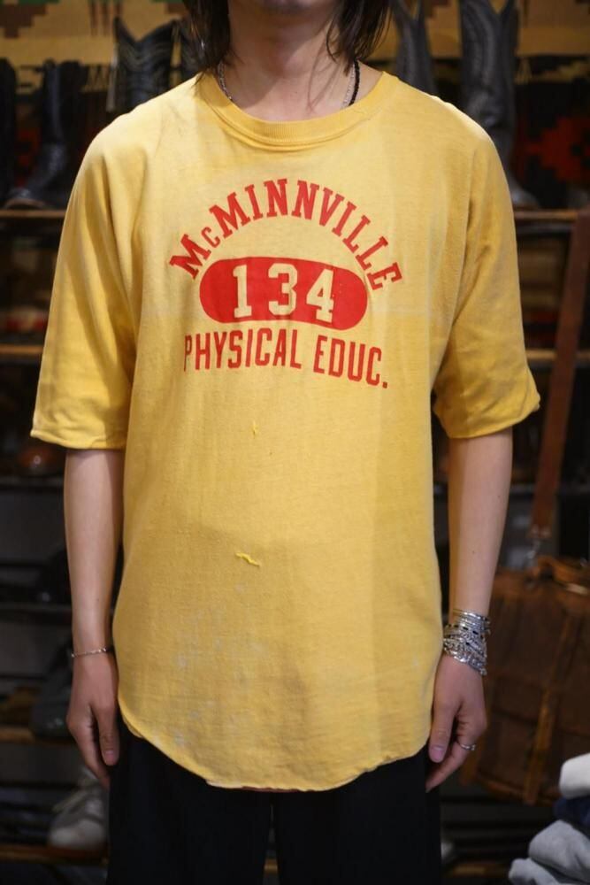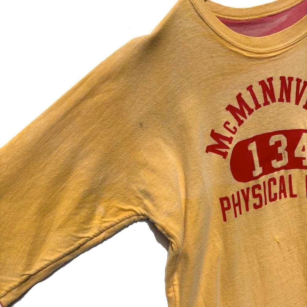 The front features the words McMINNVILLE 134 PHYSICAL EDUC. and numbering printed on it, and the three-tiered print, typical of athletic wear, creates a retro artwork.