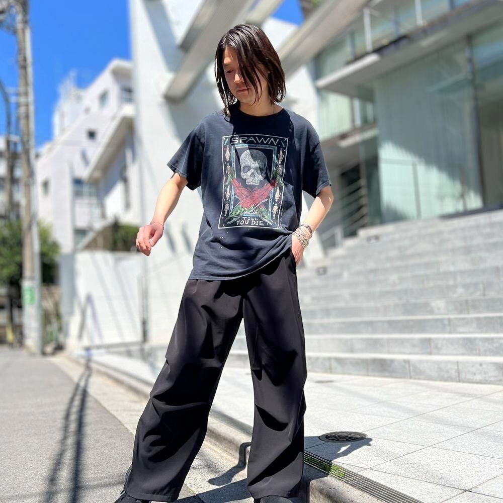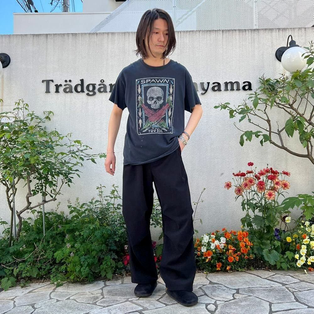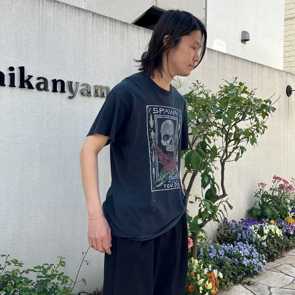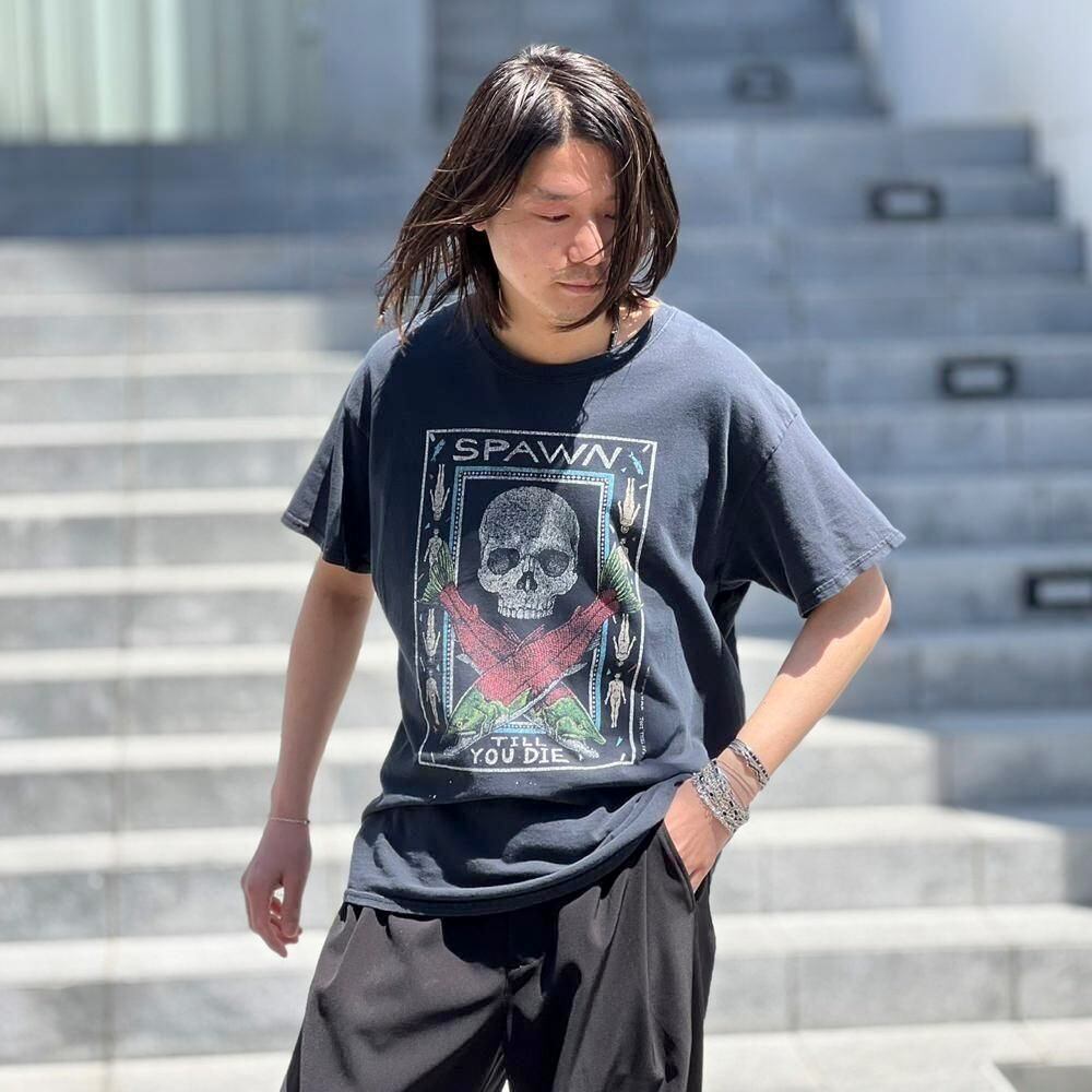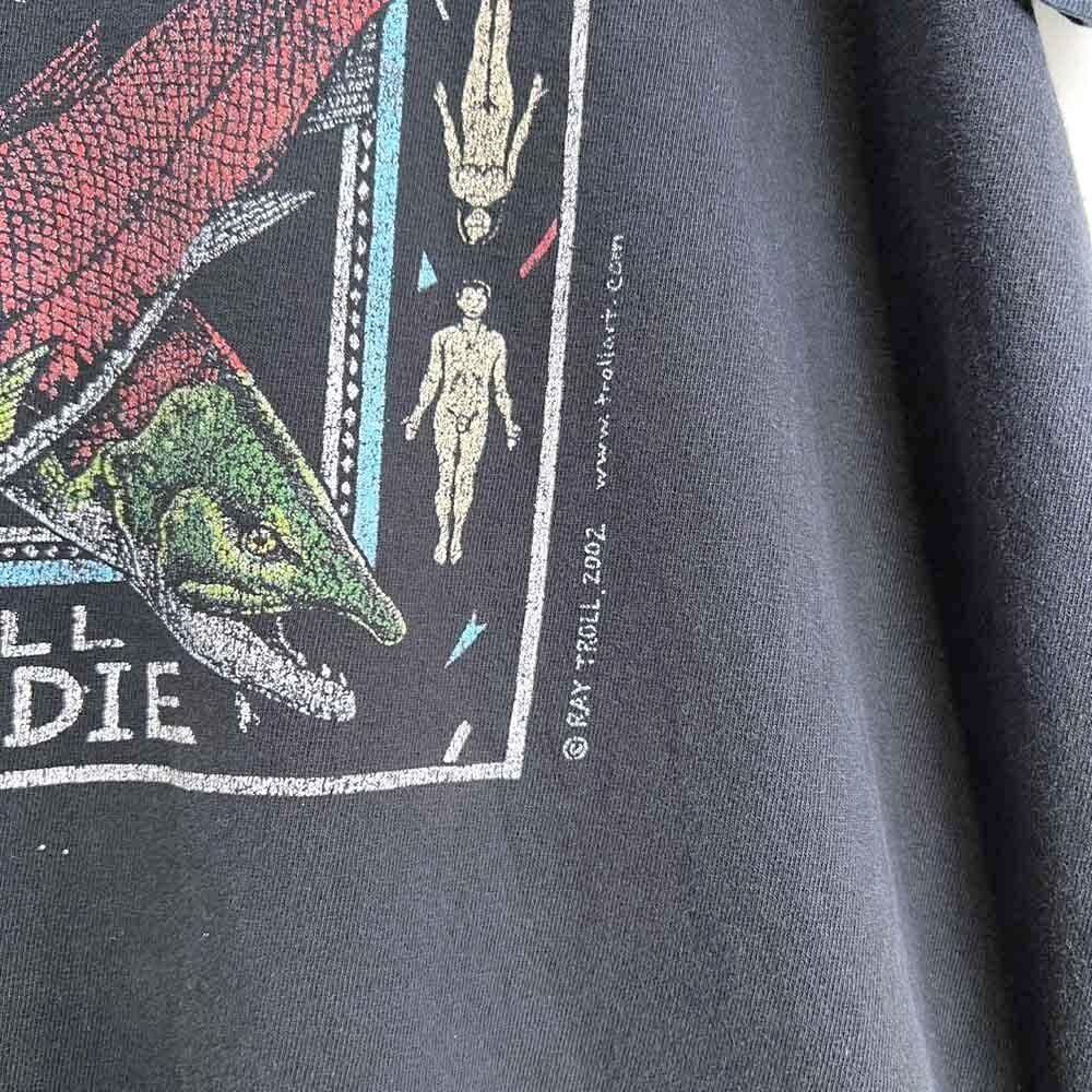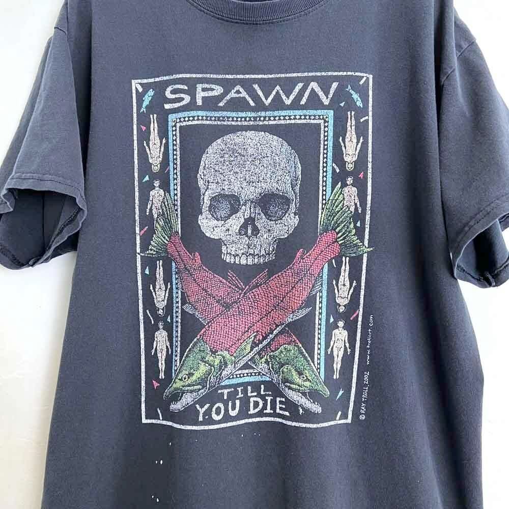 This is a 2002 printed T-shirt featuring Spawn Till You Die, a representative work by marine scientist and artist Ray Troll. The faded black color and nicely cracked print give it a great vintage feel. The body is a 100% cotton GILDAN body, size L.
