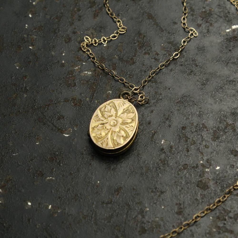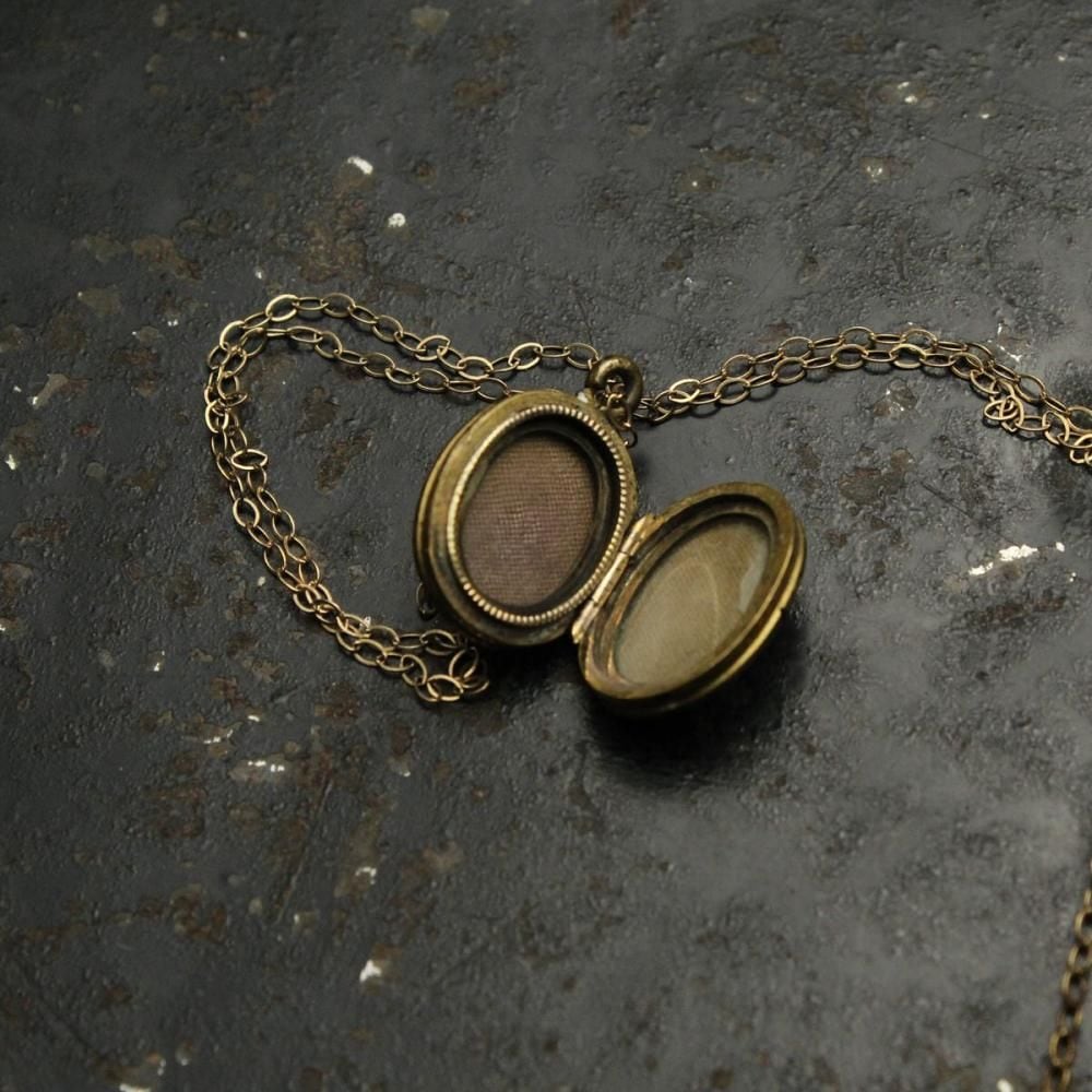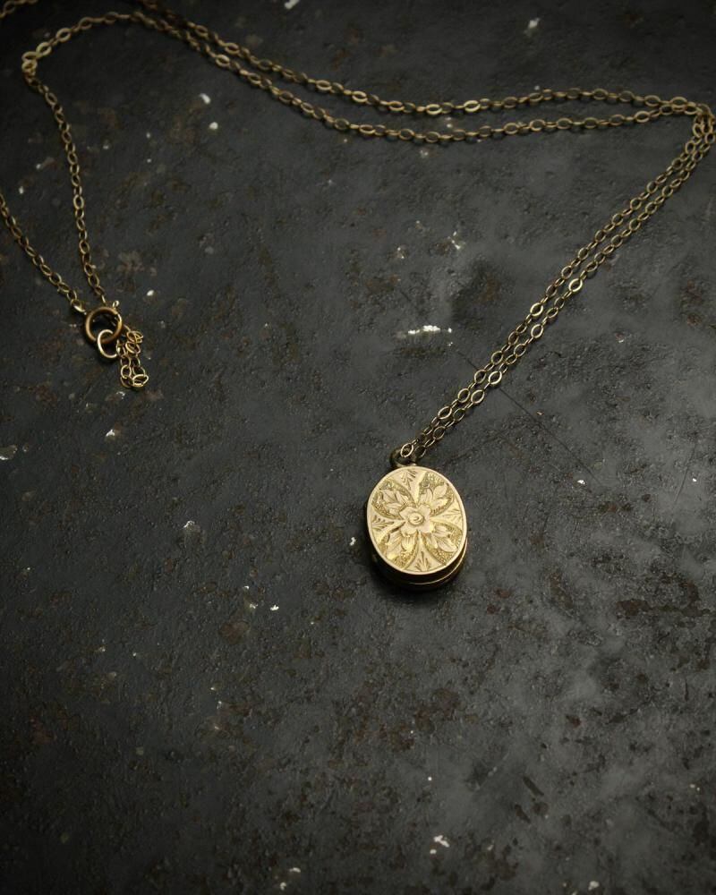 This locket-type necklace likely dates from the late 1930s to the 1940s. It features a rare design with a six-pointed star and four petals, and its gold-plated finish gives it an elegant look, typical of that era. The chain is also gold-plated. As it is an antique, there is some age-related tarnishing and minor scratches. Please check the photos and understand the characteristics of vintage items before purchasing.