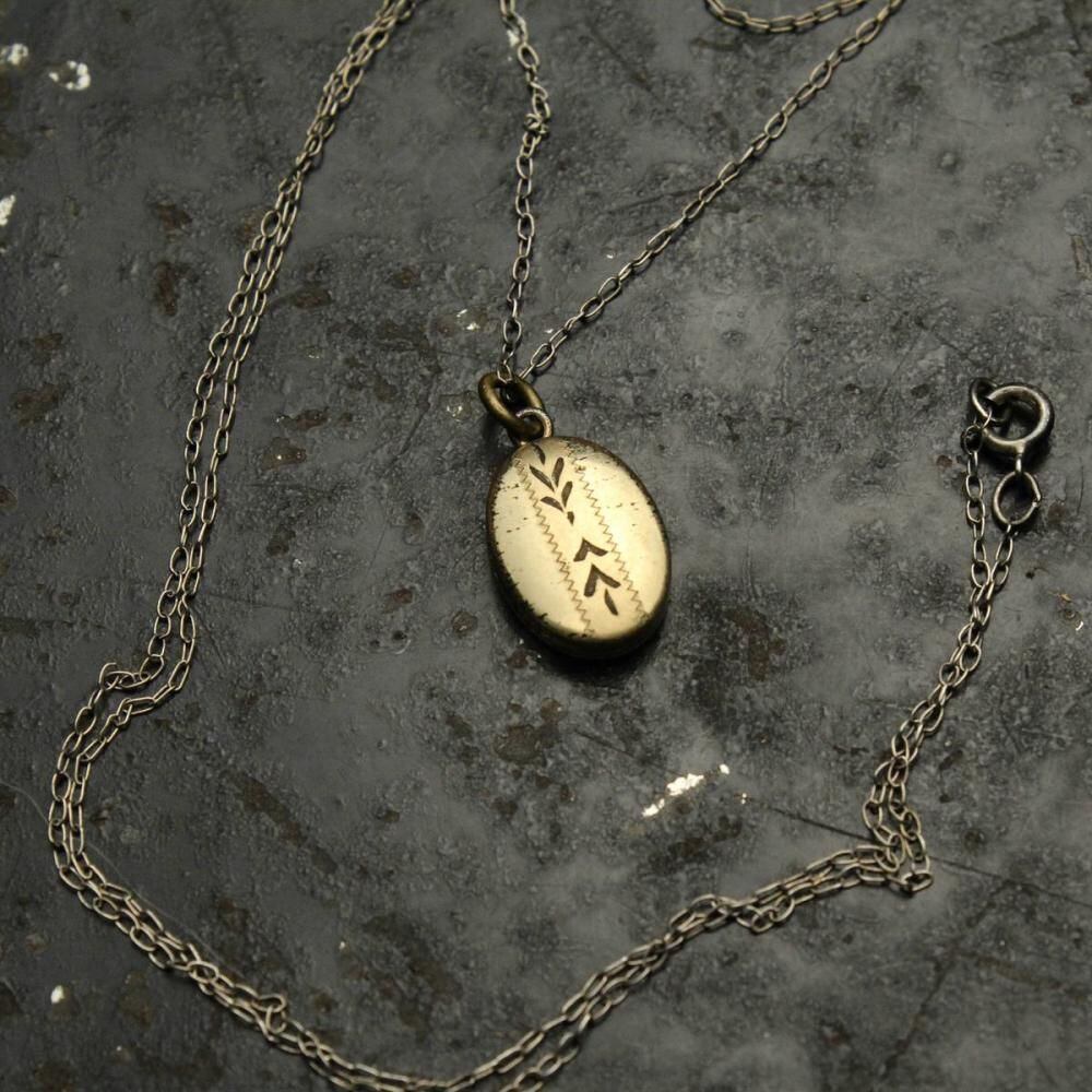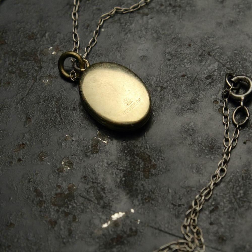 This item was a popular gift between couples during wartime, from the early 1900s to World War II. This is a locket-type necklace, featuring an elegant oval silhouette rather than a heart shape. The gold-plated finish, typical of the era, gives it a refined look. The chain is sterling silver. As it is an antique, there is some age-related tarnishing and minor scratches. Please check the photos and understand the characteristics of vintage items before purchasing.