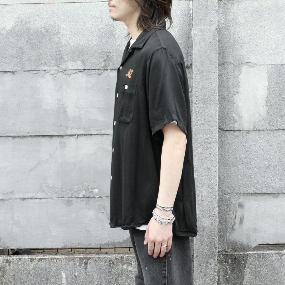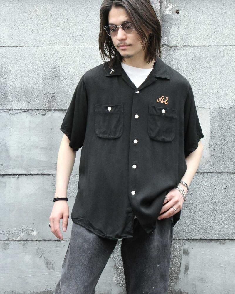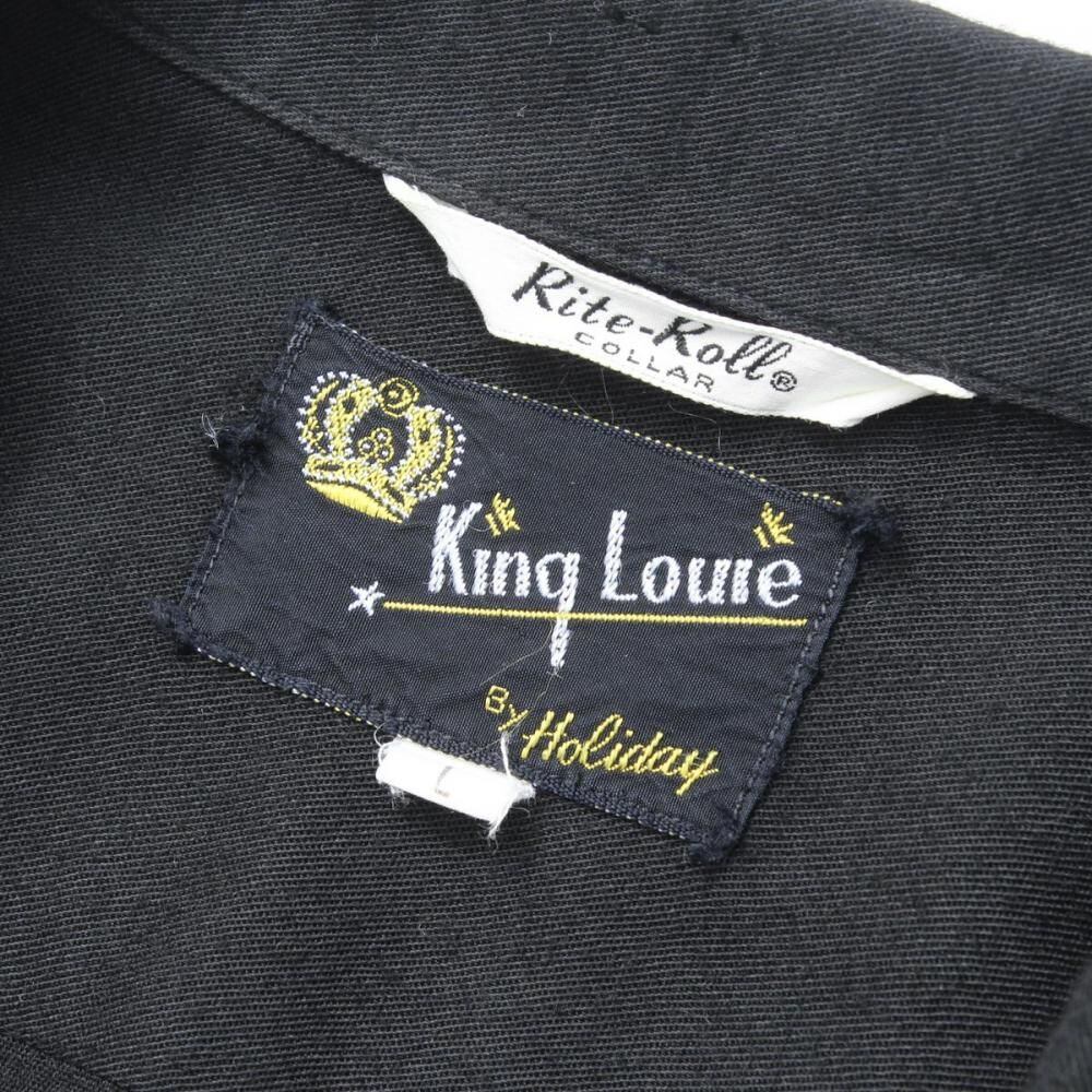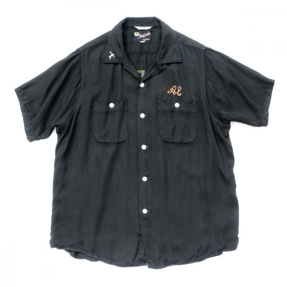 A King Louie bowling shirt from around the 1960s. Made from rare black rayon gabardine fabric, it has a rugged and solid look. The simple embroidery and flock print give it a cool yet minimalist feel. Its a size L with a good amount of room and a comfortable, relaxed silhouette. As it is a vintage item, there may be some signs of age-related deterioration. Please check the photos and understand the characteristics of vintage items before purchasing.