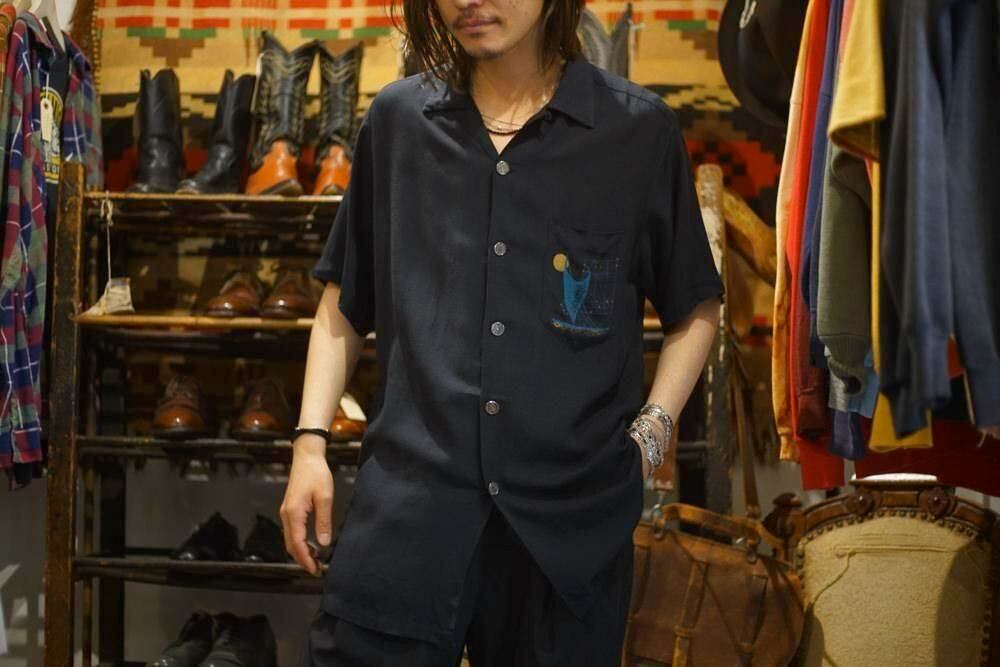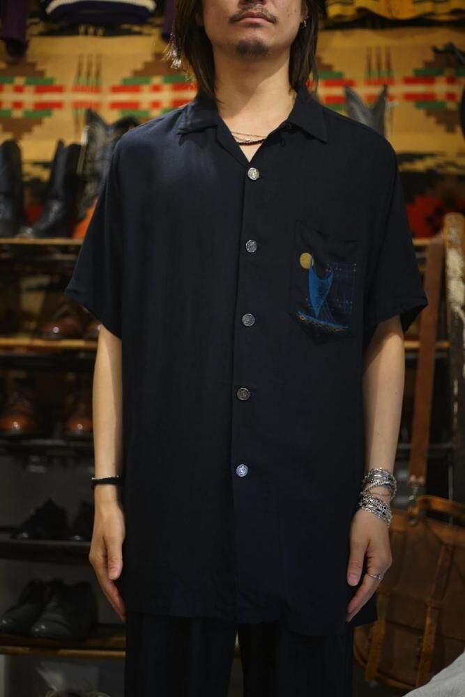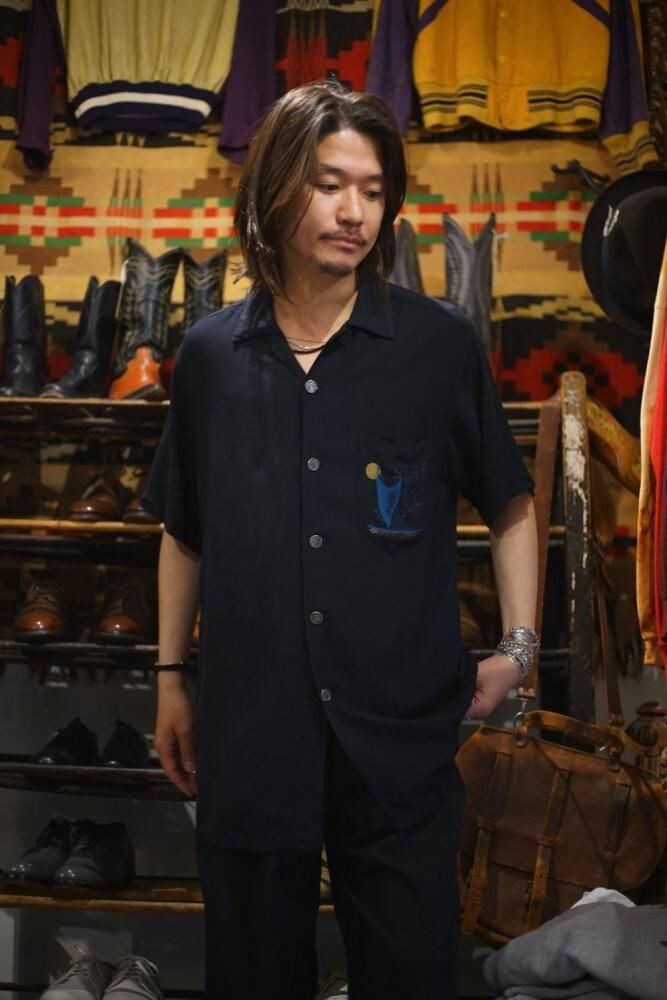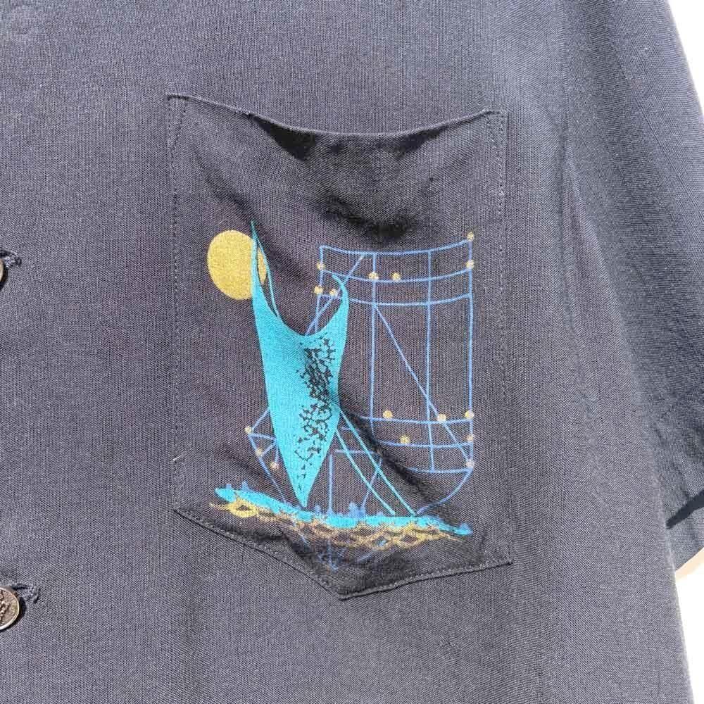 The left chest pocket features an abstract art graphic print symbolizing the mid-century modern style of the time, with a crescent moon and a yacht motif combined with grid lines reminiscent of constellations and delicate depictions of waves, resulting in a design that transcends mere clothing and possesses a level of perfection that resembles a painting.