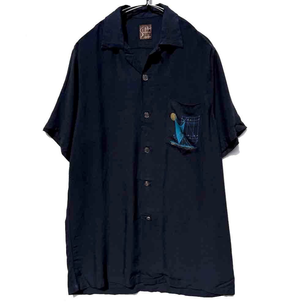 This is a vintage rayon Hawaiian shirt made by Alfred Shaheen, dating from around the 1950s.