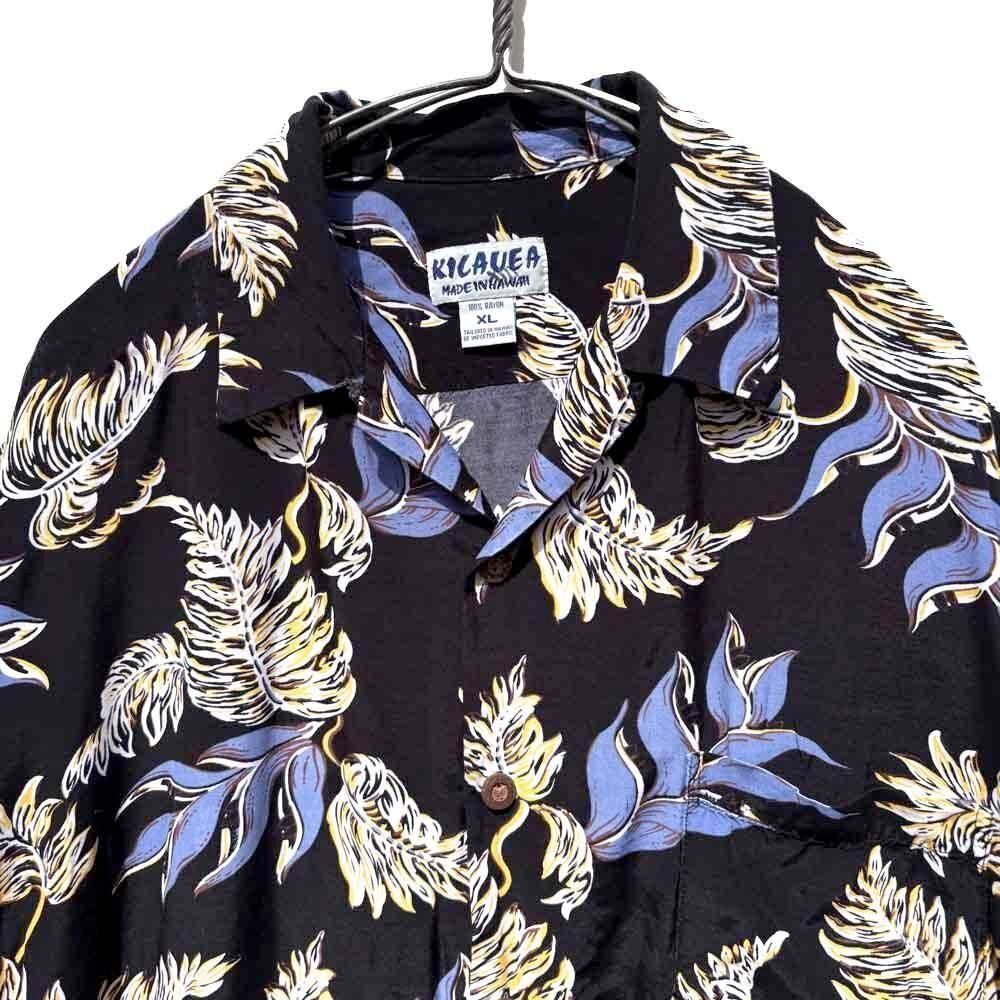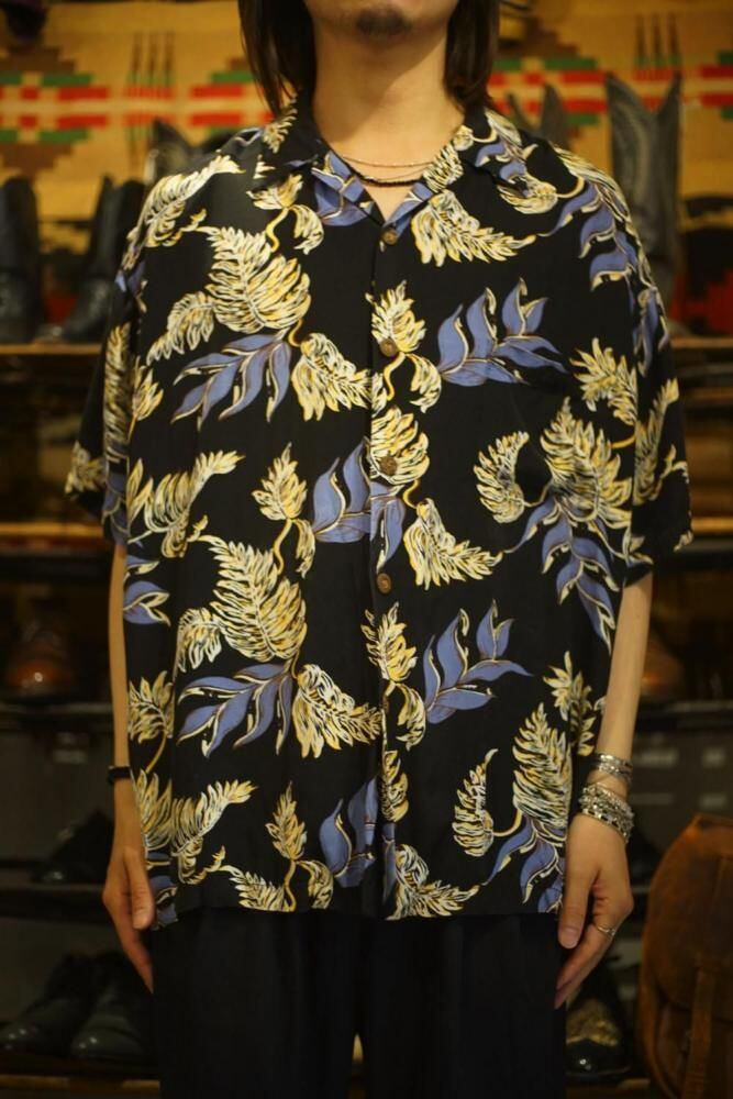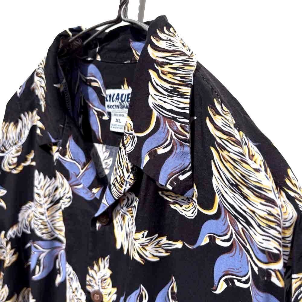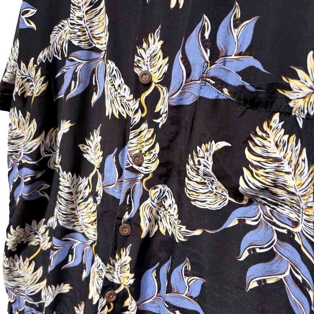 This shirt features a beautiful leaf pattern in cool blues and soft cream tones against a jet-black body, exuding the relaxed feel characteristic of an Aloha shirt while also possessing a sophisticated, urban, and rugged vibe.