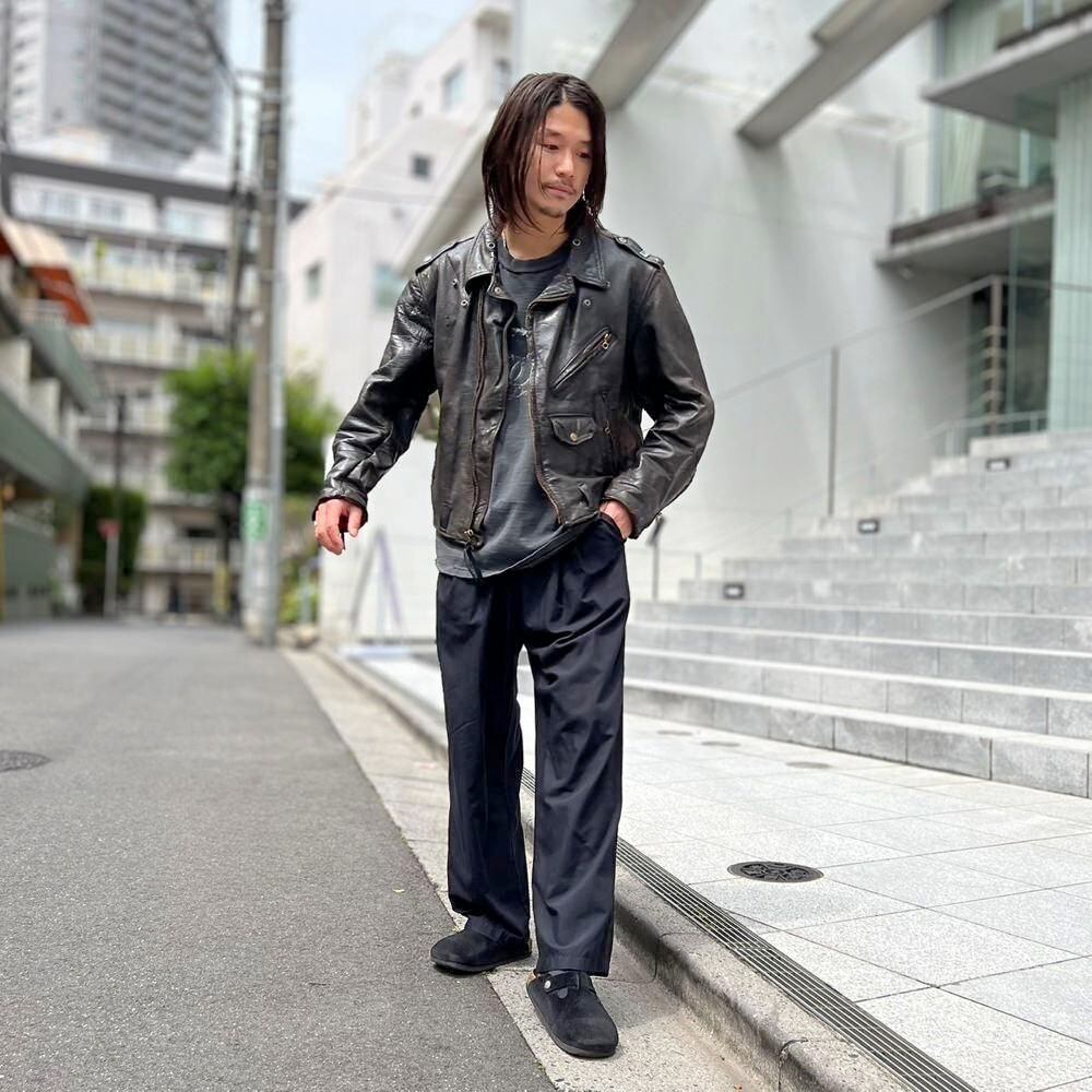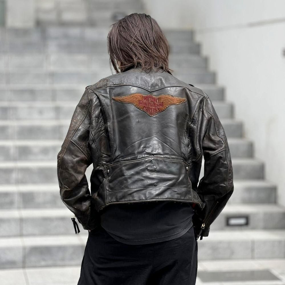 This 70s riders jacket has a soft, supple feel from the aged leather, with a charmingly cracked texture in some areas. Above all, its an extremely rare vintage riders jacket (especially a double-breasted one) with such a good size and silhouette. The Harley patch on the back adds to the overall vibe. Theres no size tag, but it feels like a size 42-44.