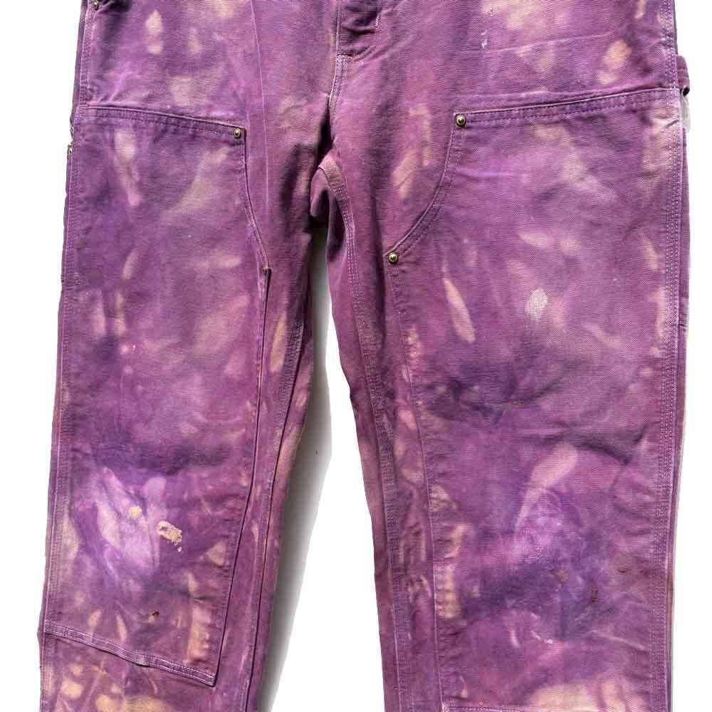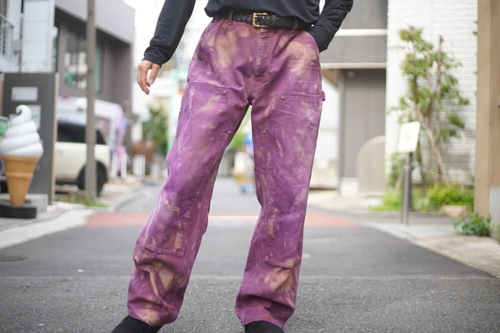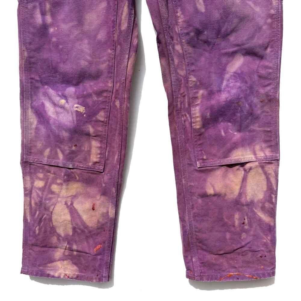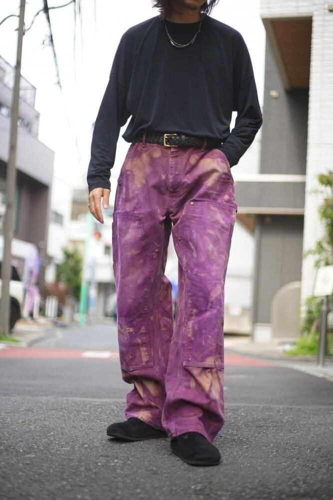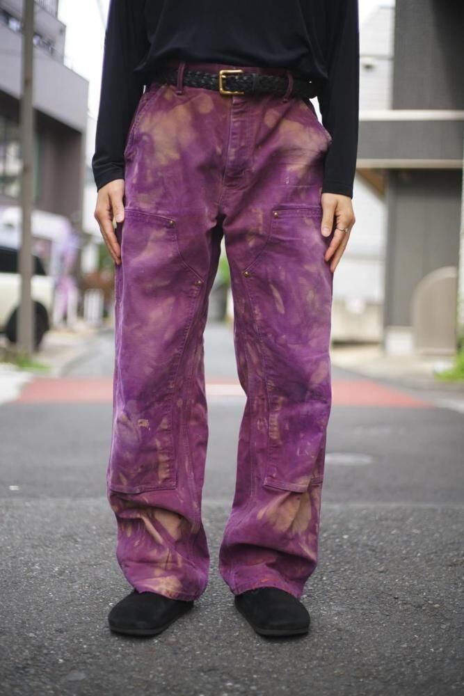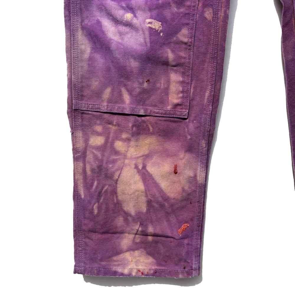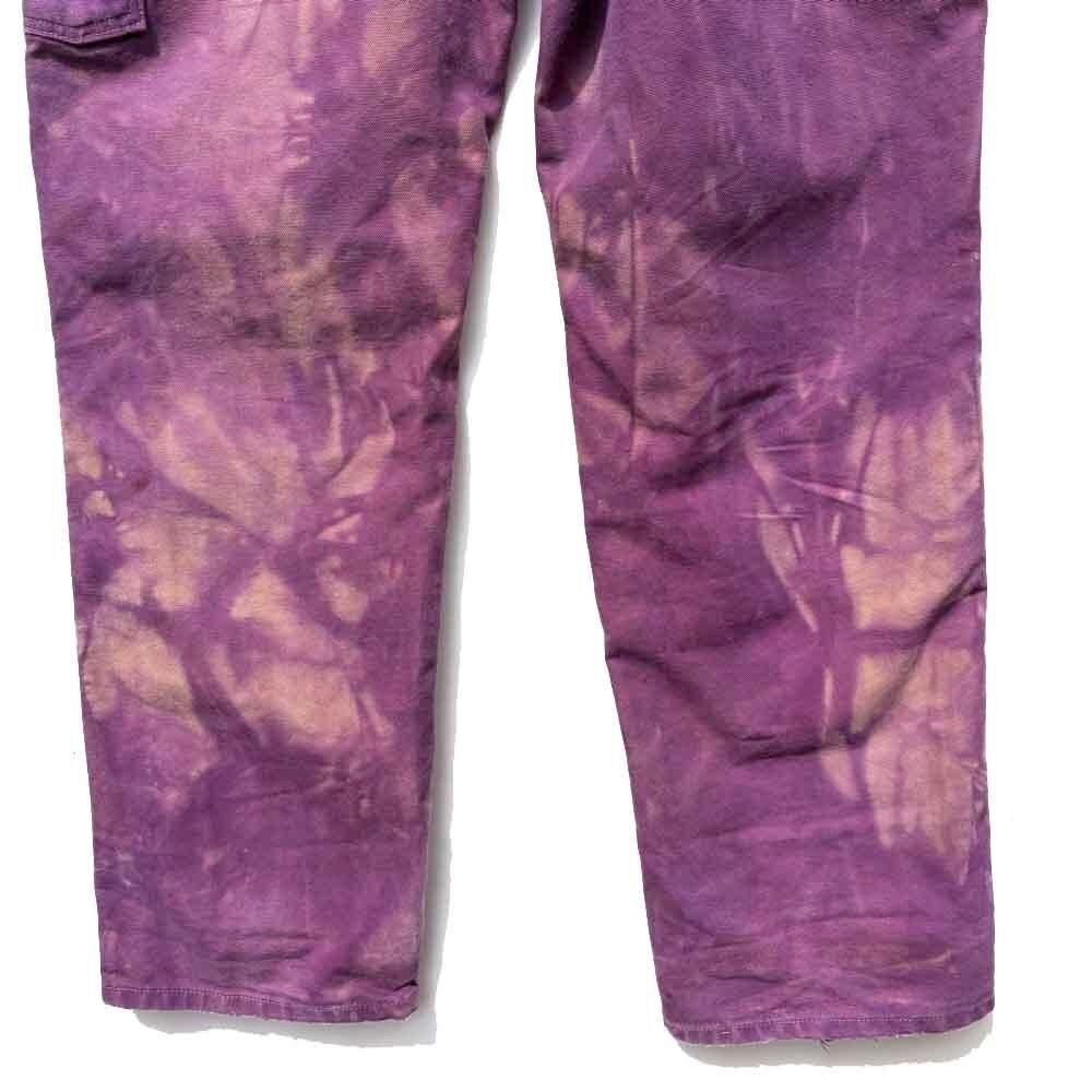 Made from tough cotton duck fabric, this garment features bold coloring and bleaching. The deep purple base is accentuated by tie-dye-like bleach marks that appear to float, giving it a punkish and rebellious aura reminiscent of modern art.