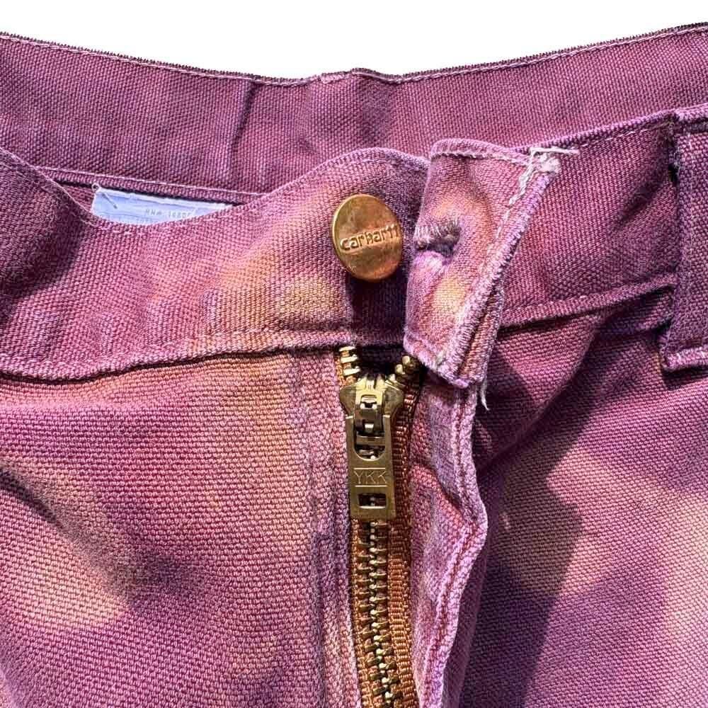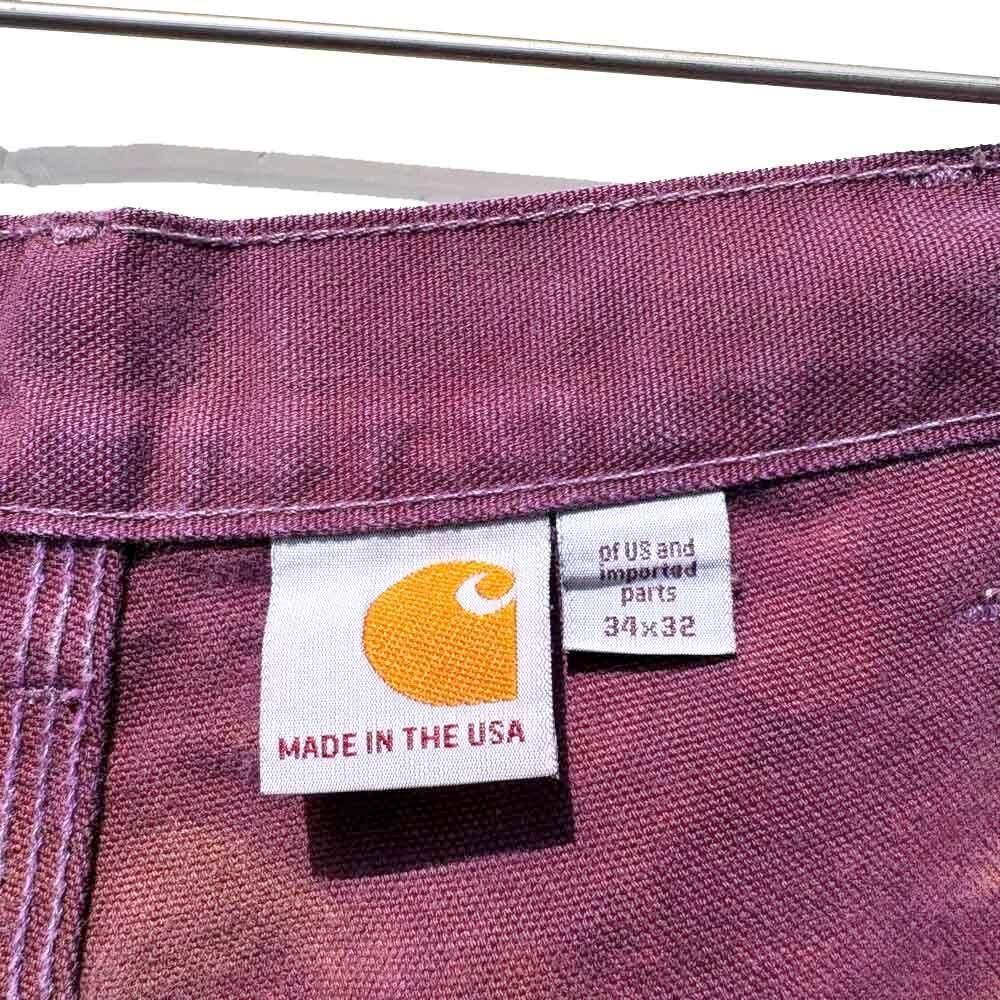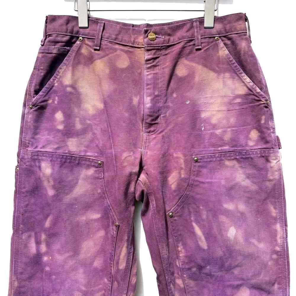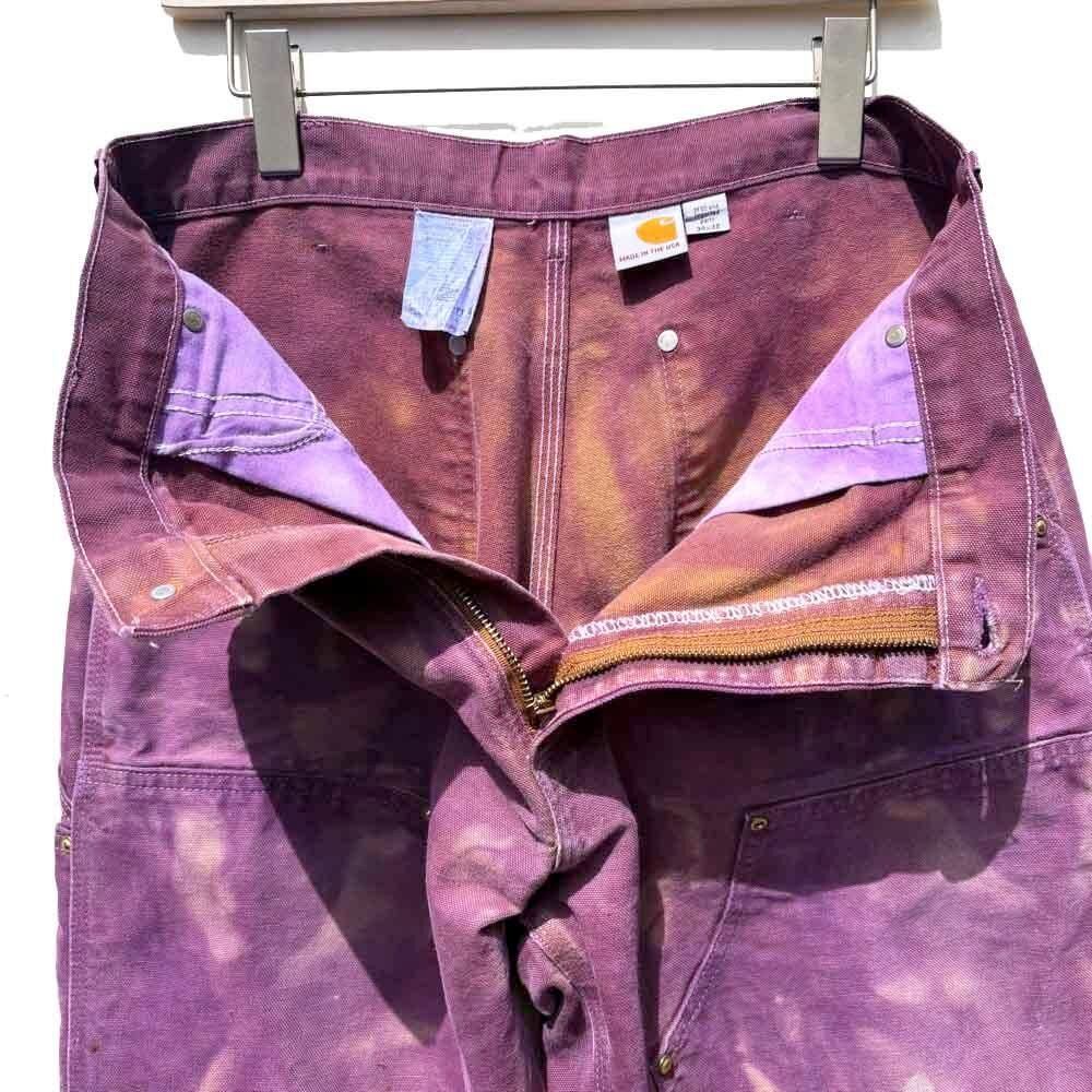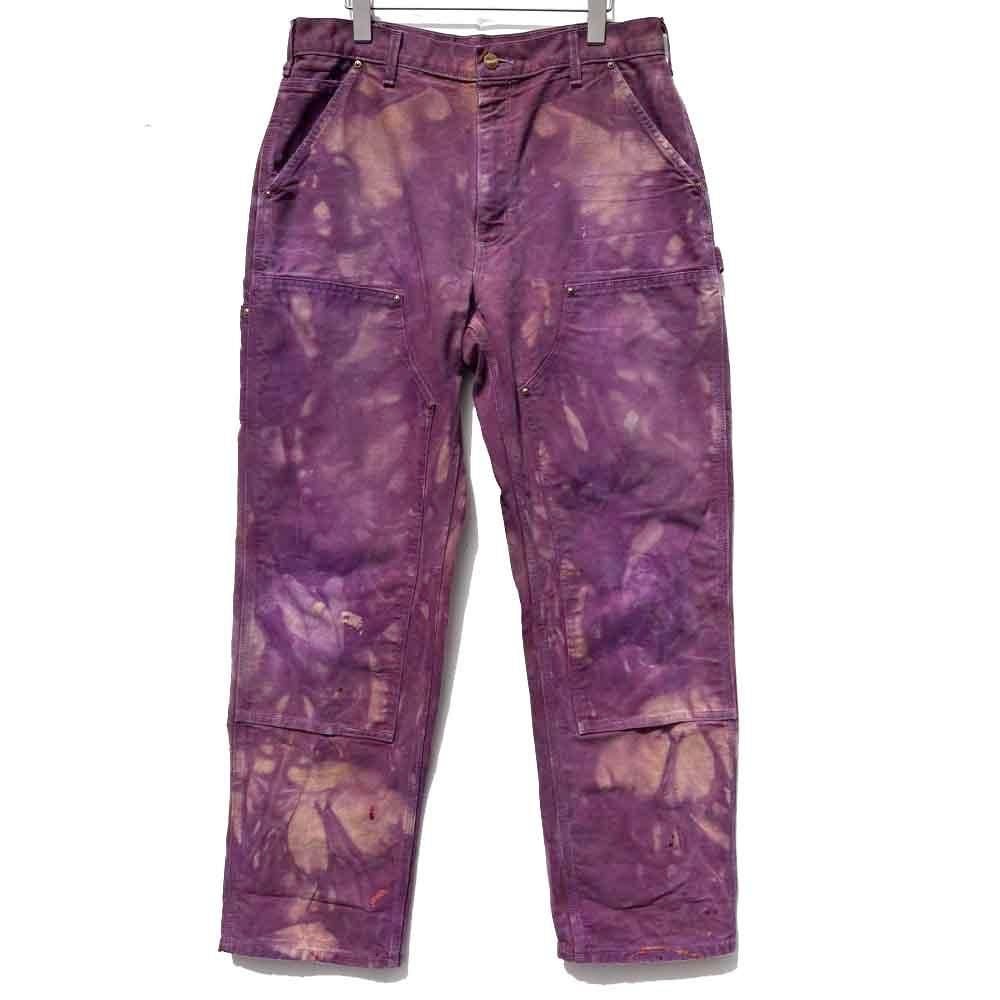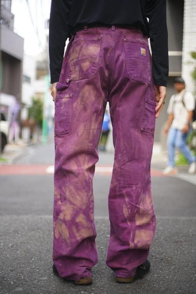 Made from tough cotton duck fabric, this garment features bold coloring and bleaching. The deep purple base is accentuated by tie-dye-like bleach marks that appear to float, giving it a punkish and rebellious aura reminiscent of modern art.