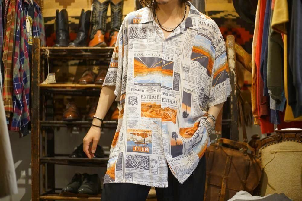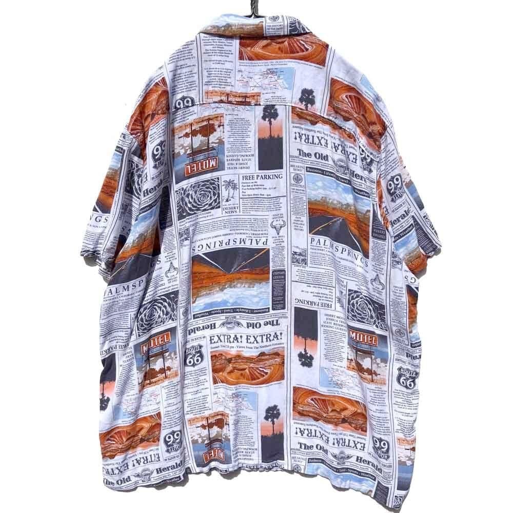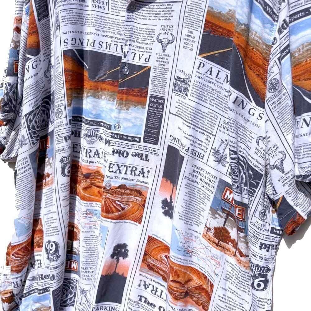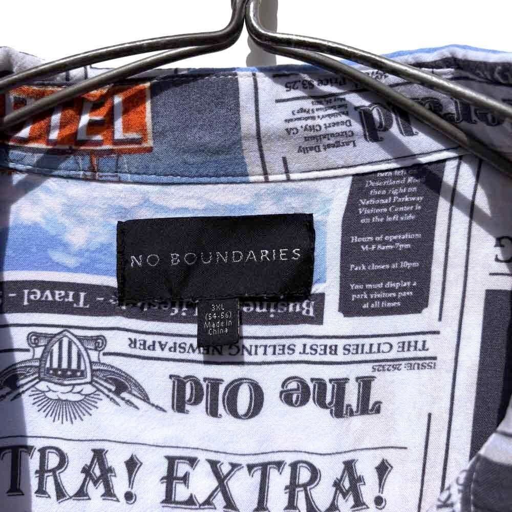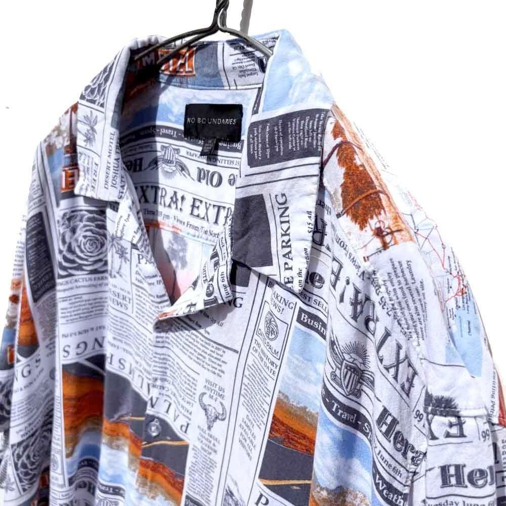 This is a rayon aloha shirt with a newspaper print, made by NO BOUNDARIES, from around the 1990s.