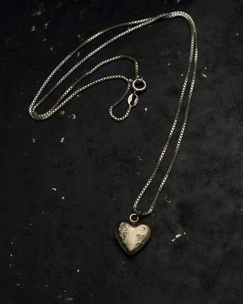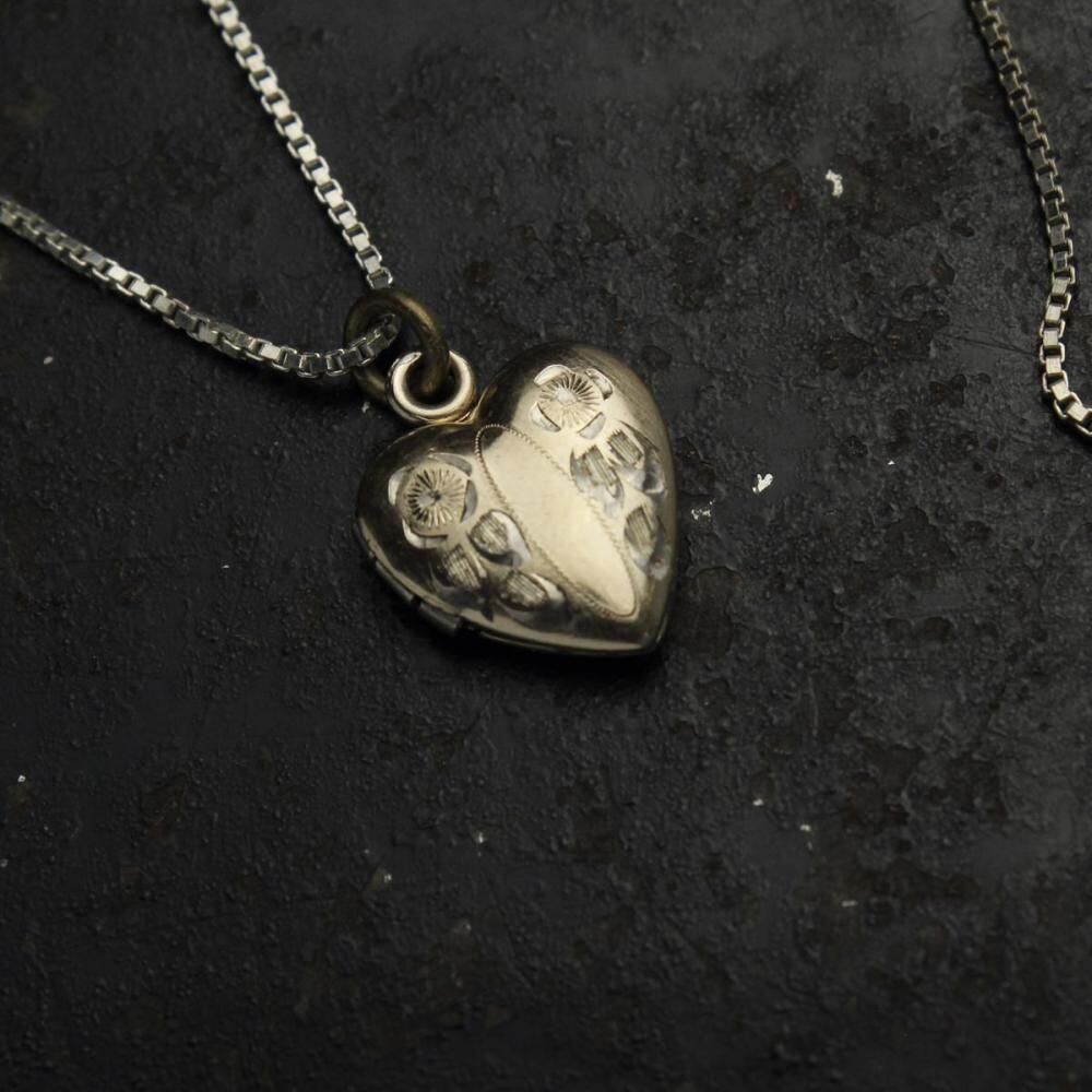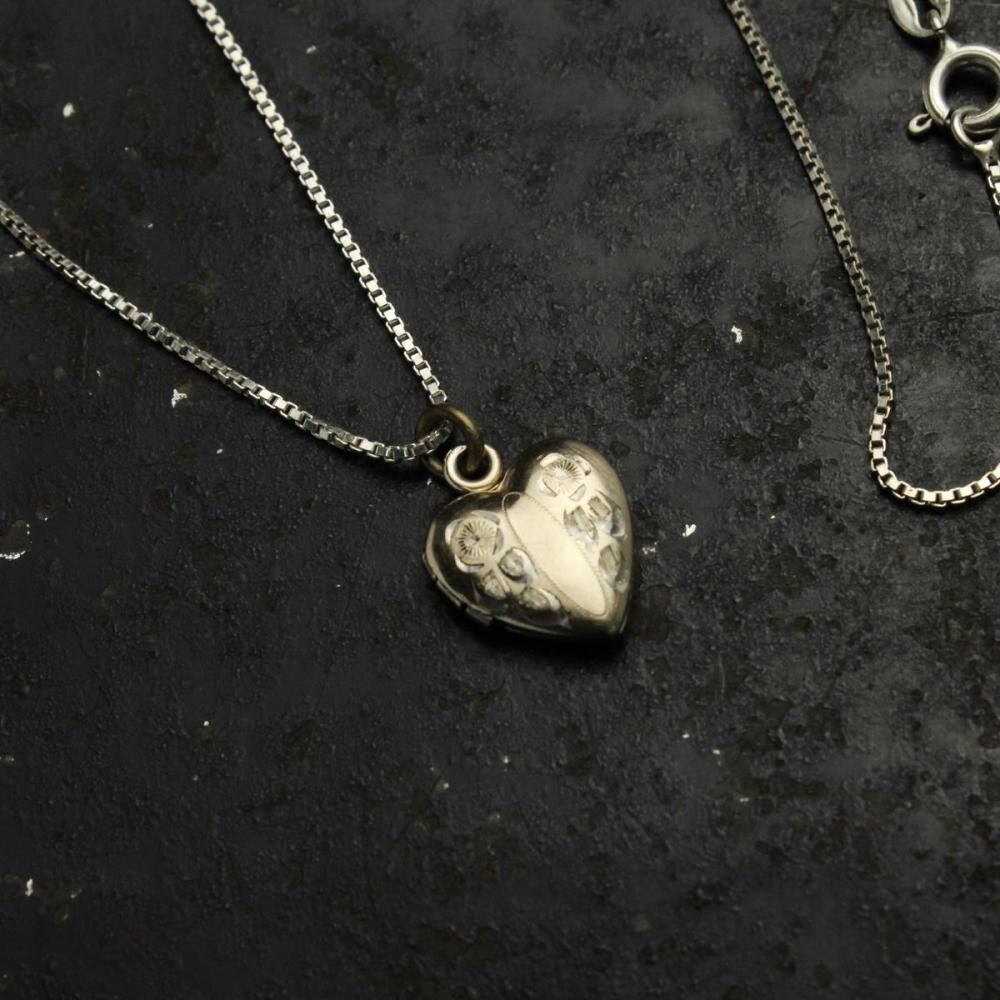 This item was a popular gift between couples during wartime, from the early 1900s to around World War II. This is a locket-type necklace with a small, elegant pendant featuring a flower motif. The gold-plated finish gives it a refined look, typical of the era. Both the pendant and chain are made of sterling silver. As it is an antique, there is some age-related tarnishing and minor scratches. Please check the photos and understand the characteristics of vintage items before purchasing.