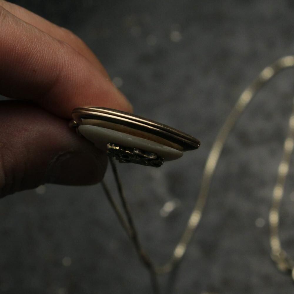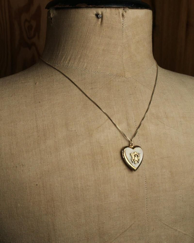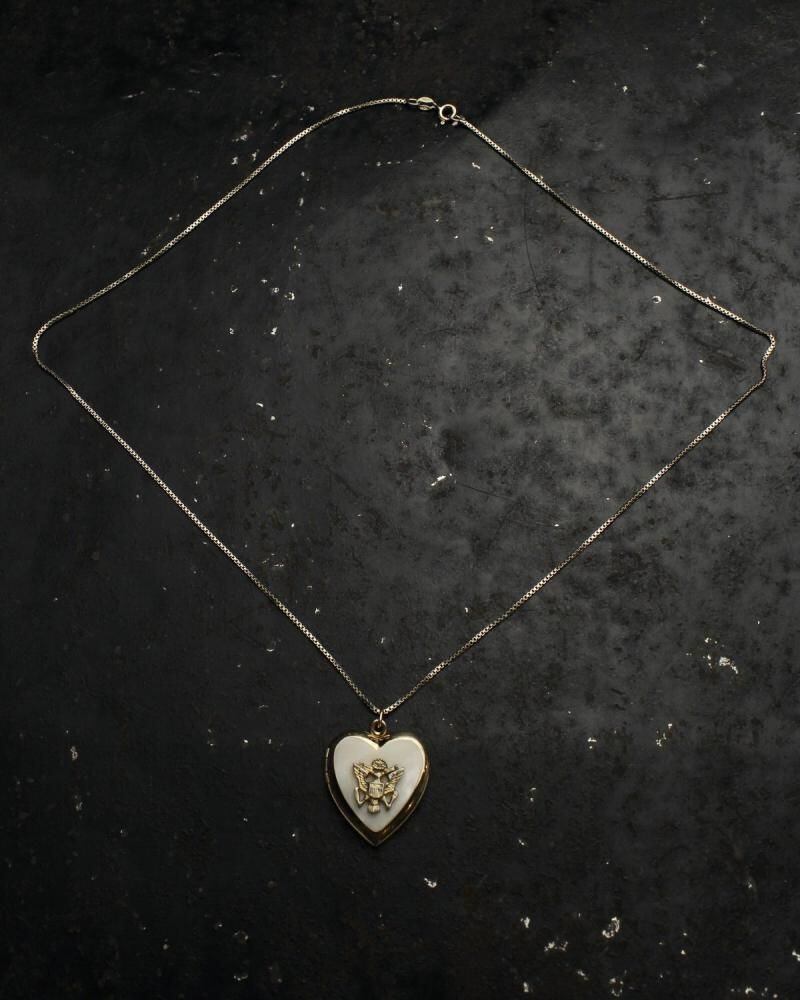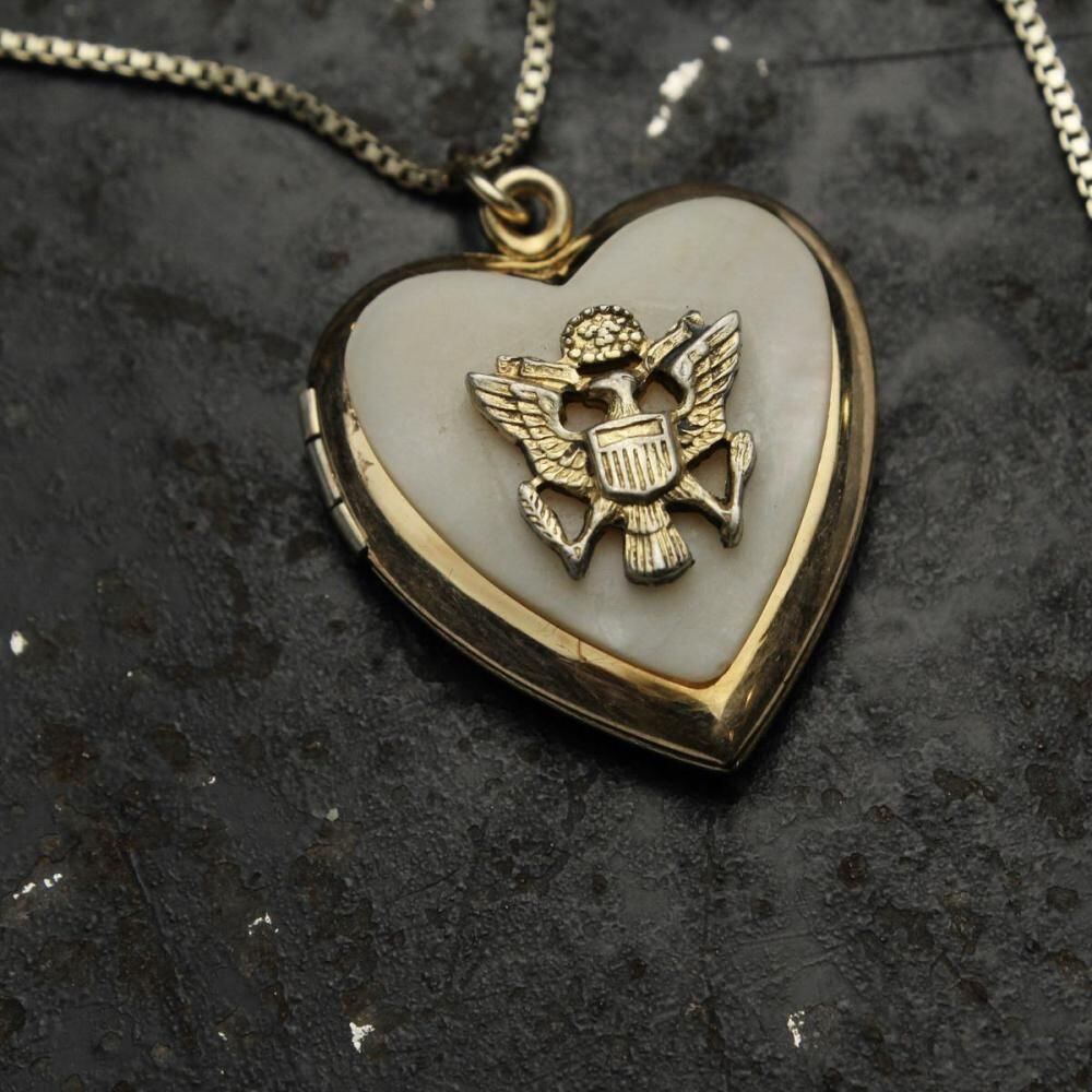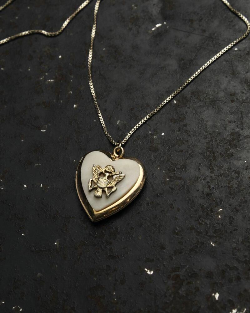 This item was a gift between couples during wartime, from the early 1900s to around World War II. This is a locket-type necklace with a large mother-of-pearl pendant and an army eagle motif, making it a particularly elaborate piece among these items. The gold-plated finish is typical of the era, giving it an elegant look. The chain is gold-plated sterling silver. As it is an old item, there is some tarnishing and minor scratches due to age. Please check the photos and understand the characteristics of vintage items before purchasing.