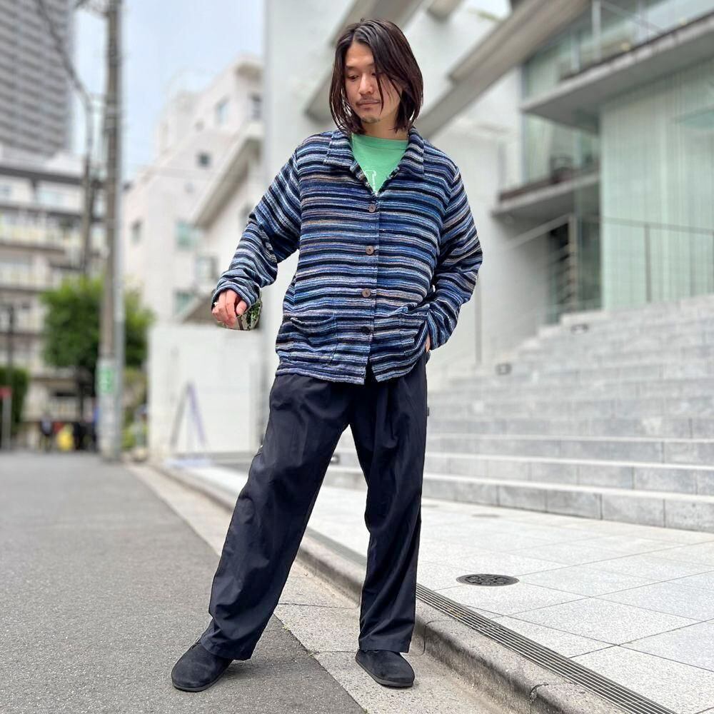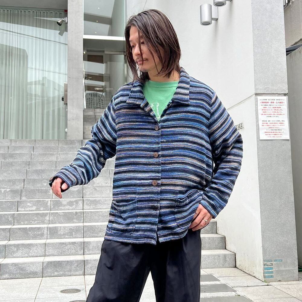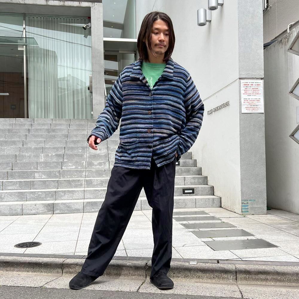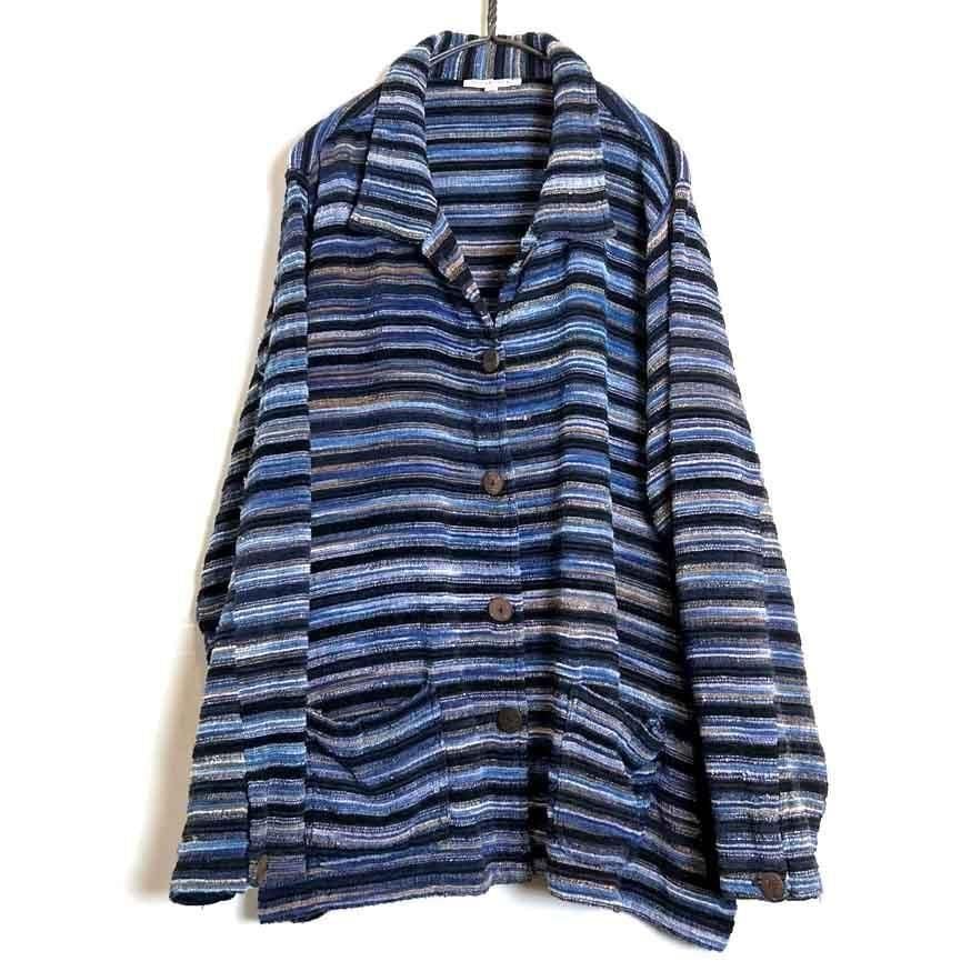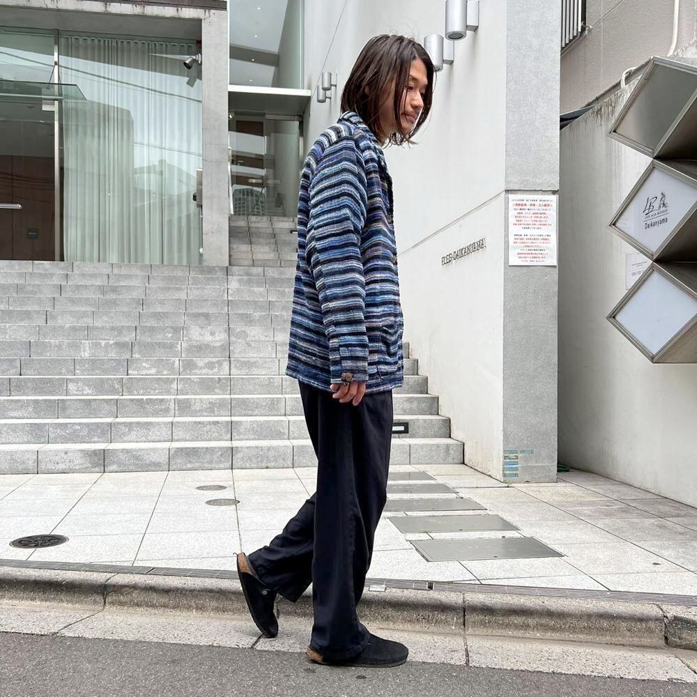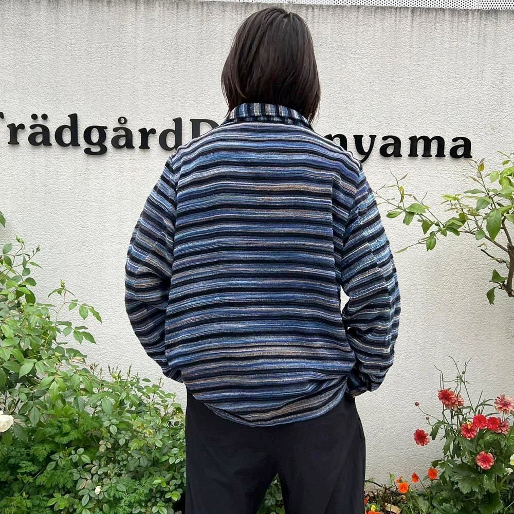 This pile jacket from the 2000s is made of a soft, fluffy, and lightweight cotton, rayon, and polyester blend with a beautiful drape. Its light, cardigan-like feel makes it perfect as a light outer layer for spring. The blue gradient with black stripe pattern creates a lovely color combination. It has a comfortably relaxed fit and silhouette.