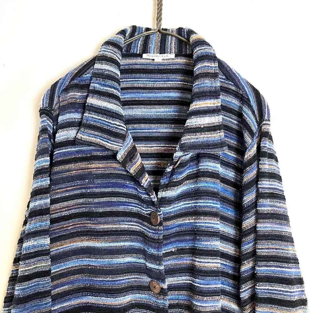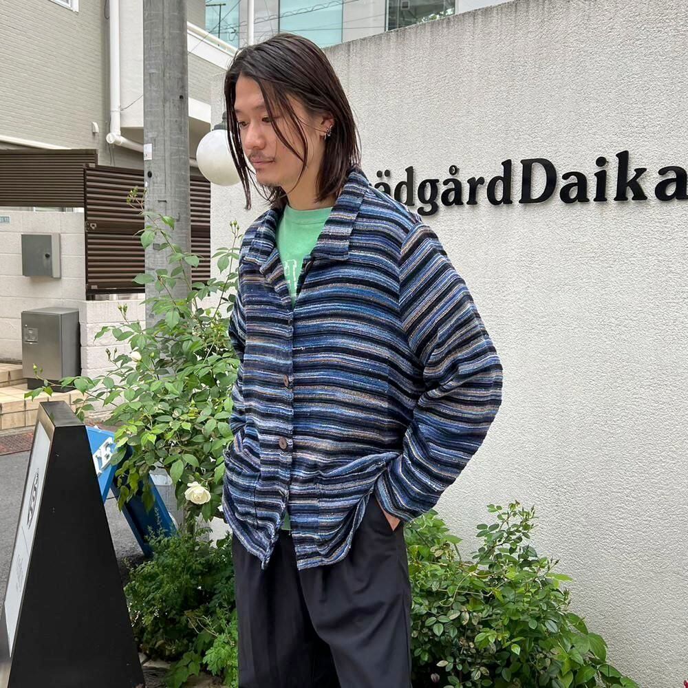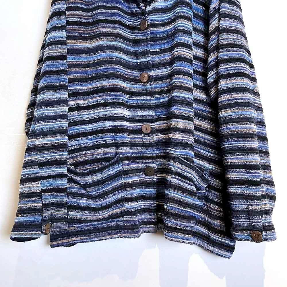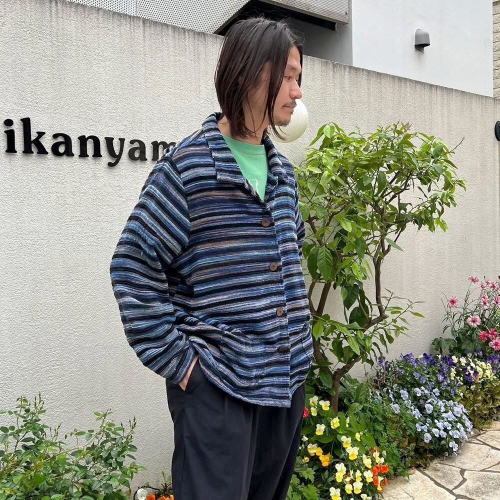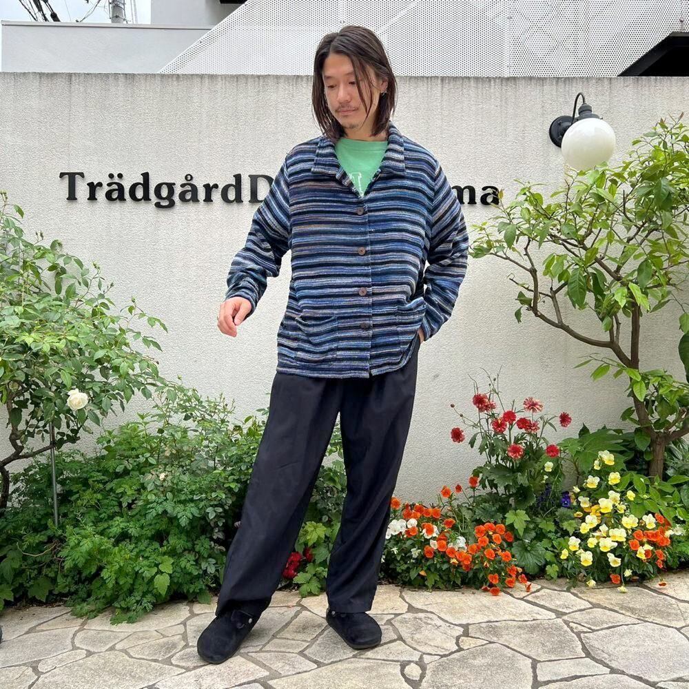 This pile jacket from the 2000s is made of a soft, fluffy, and lightweight cotton, rayon, and polyester blend with a beautiful drape. Its light, cardigan-like feel makes it perfect as a light outer layer for spring. The blue gradient with black stripe pattern creates a lovely color combination. It has a comfortably relaxed fit and silhouette.