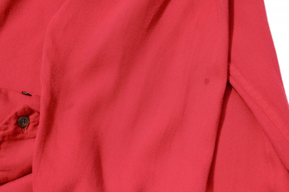 Around the 1950s, this is an open collar rayon shirt. The red-colored body that jumps into your eyes and the hand-printed shirt-like hand print on the front show a contrast, giving it a rudy atmosphere that is typical of this age. Rayon gabardine fabric has a light drape and is soft to the touch. A precious 16 (L) size silhouette with a relaxed resort feel. Some of the sleeves are lightly soiled, and the whole is in good condition subjectively. Since it is an old product, it rarely deteriorates over time. Please check the photo and purchase after acknowledging the characteristics of vintage.