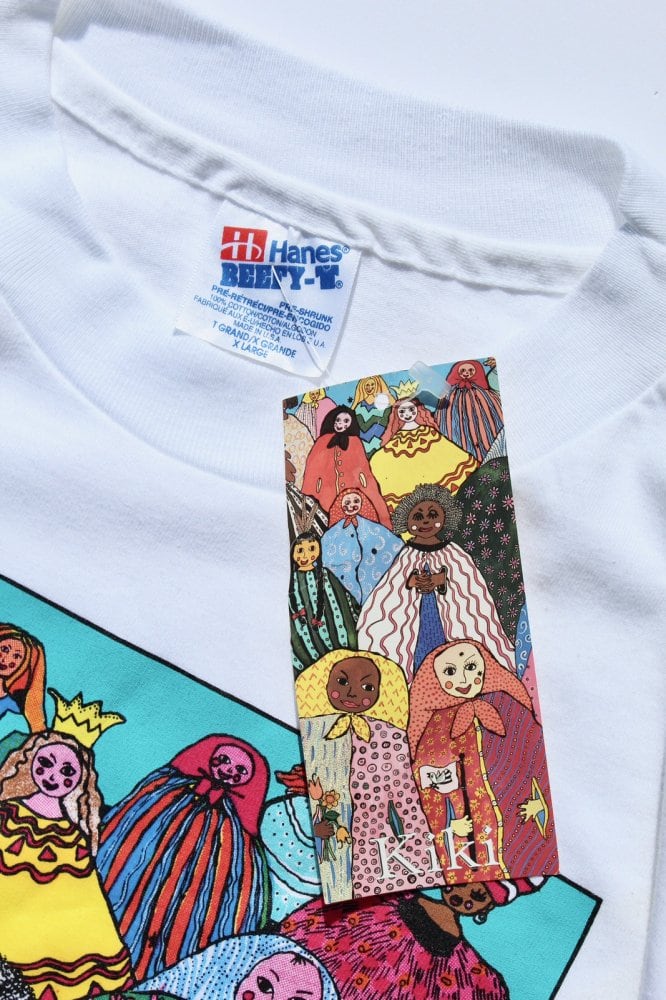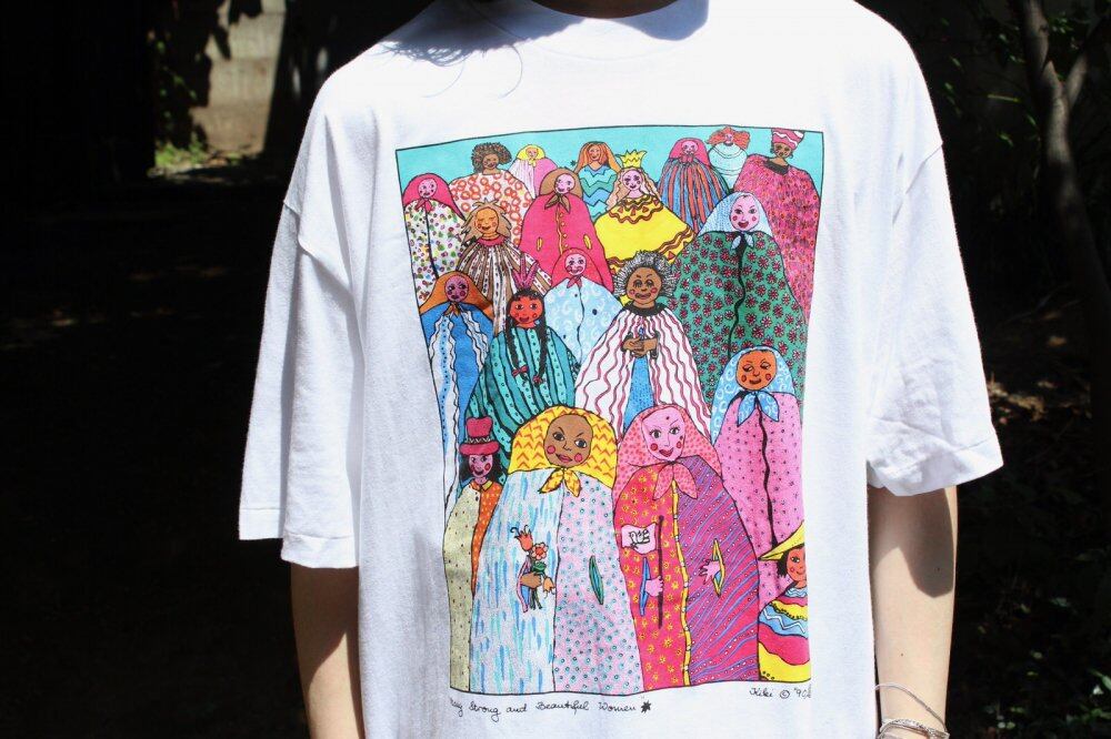 Kiki Suarez is a German psychotherapist and artist. Impressed when I visited Mexico on a trip in the 1970s, I lived in Mexico and got married and opened a cafe bar with an art gallery. Her art is influenced by local coloring and is a social activity from autobiographical to violence against women, support for people with disabilities, consideration for the environment, promotion of ethical values and childrens rights. There is also a typical aspect. This is an early precious piece that became popular when mainly selling art print products in the United States in the 90s. Her feminist art and pop color scheme are eye-catching designs, and the signature of Many Strong and Beautiful Women brings out the strength of the painting. The color is white, Tall XL size and a loose silhouette. Old stock with a tag, in good condition. Since it is an old product, it rarely deteriorates over time. Please check the photo and understand the characteristics of Vintage before purchasing.
