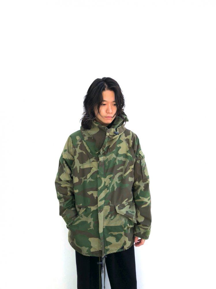 80s US Army Camouflage Parka A feeling of size that is reasonably generous and easy to use The full zip-up state makes it a fairly high-necked silhouette, so it can be used in the cold of midwinter.