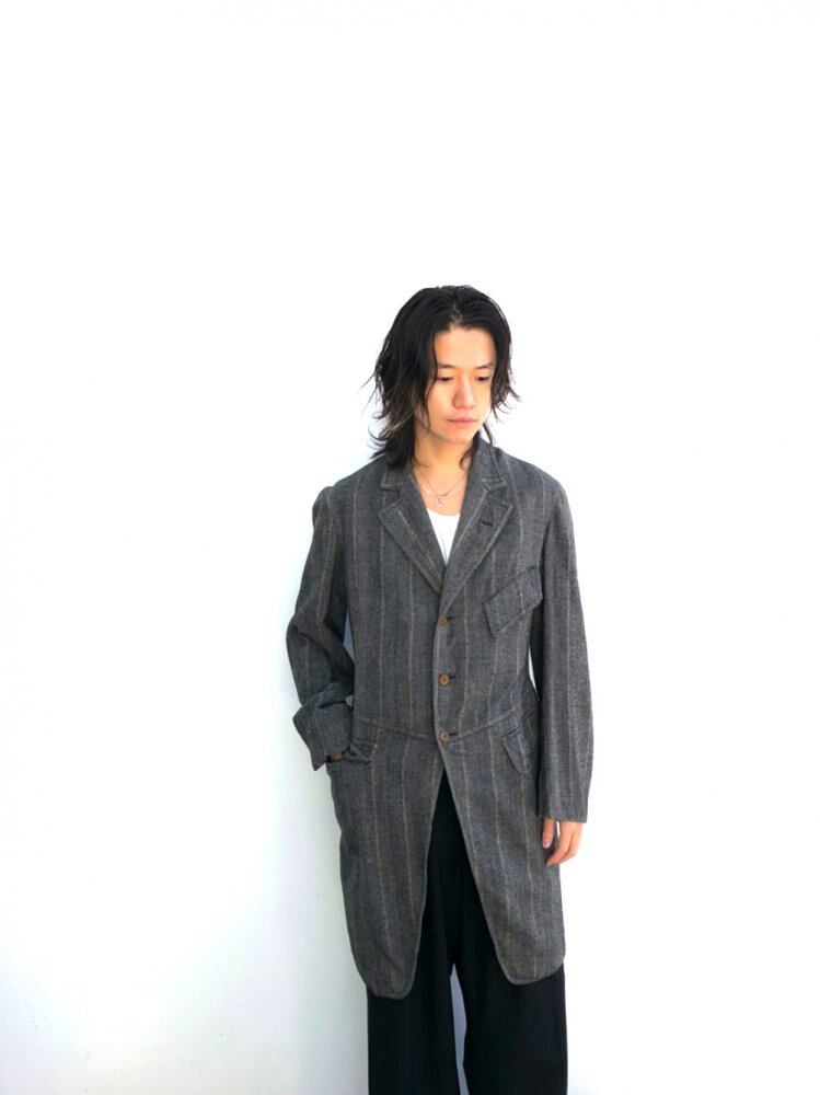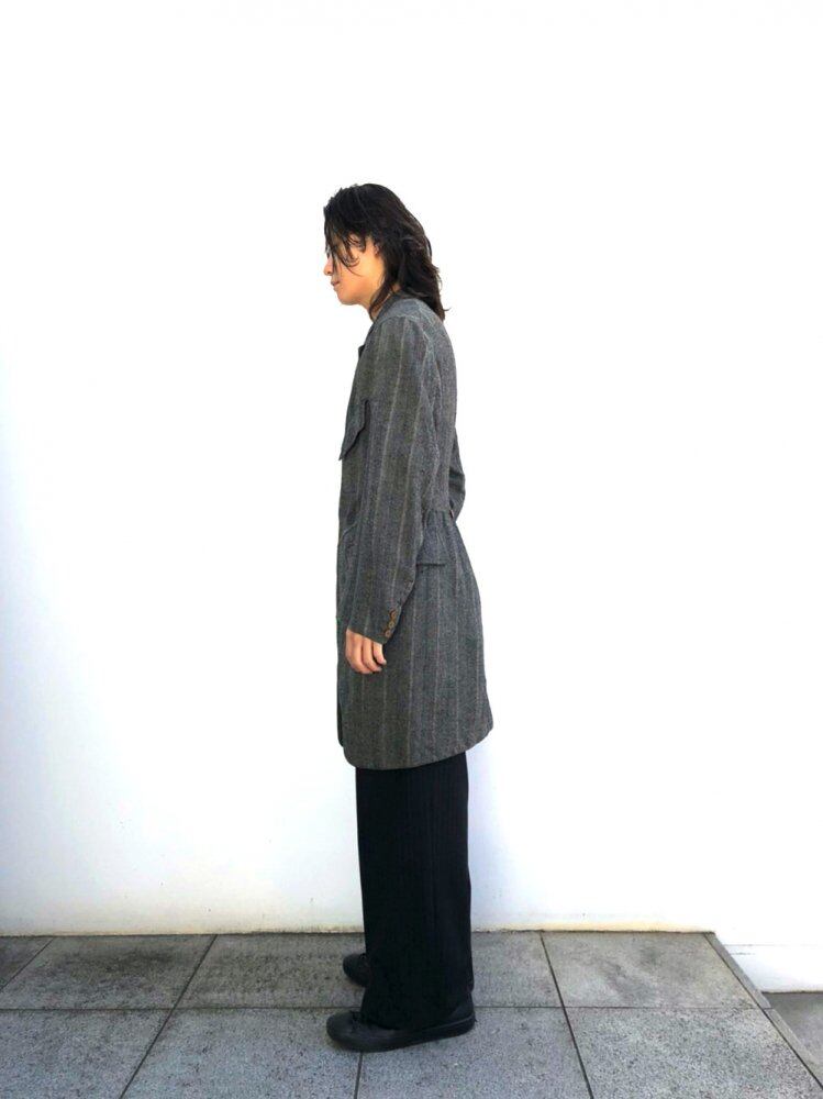 The vintage jacket 80 to 90 years ago has a classic texture and silhouette. Herringbone stripes with gray, white, and blue have a shape like an old tailor-made jacket. There are some hole damages. Please understand