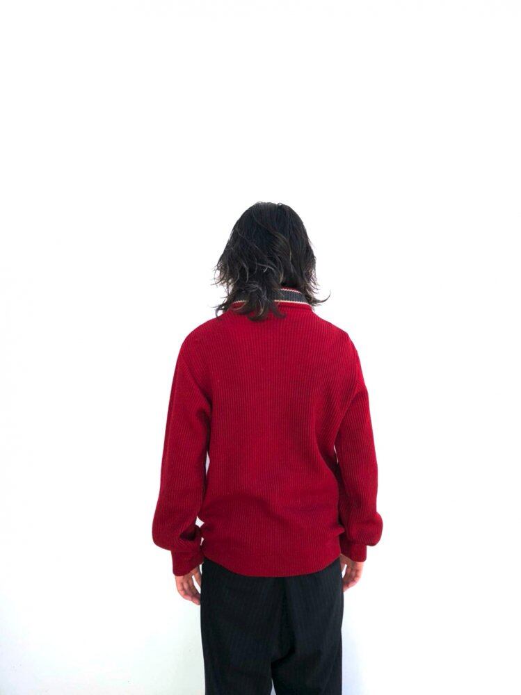 Vintage cardigan from the 50s to 60s A shawl color design in a deep red color. A cute zip-up type cardigan with a cute emblem on the chest. A sporty impression. A good silhouette with plenty of room.