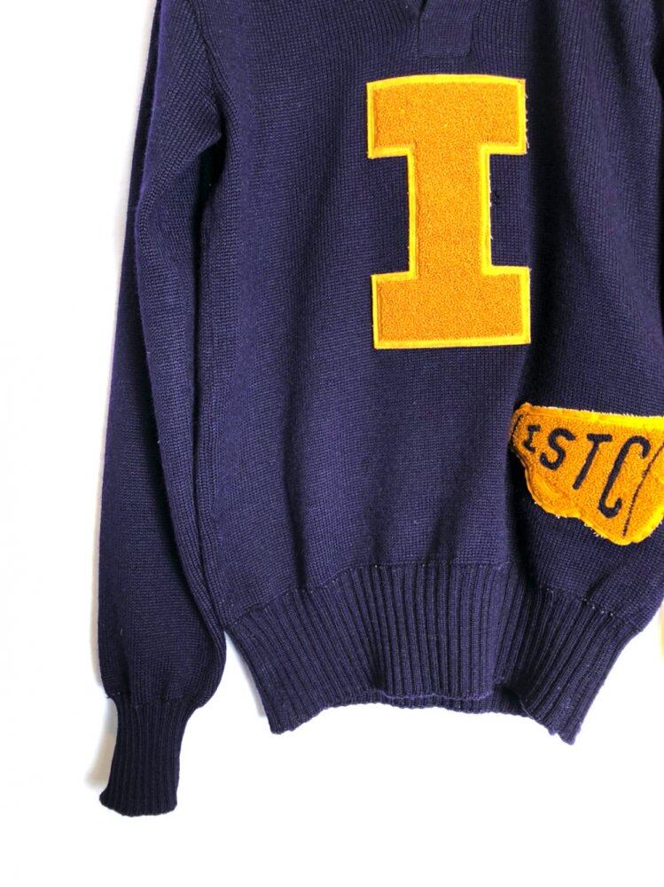 50s lettered sweater The texture of a tightly packed high-gauge knit 1st place with a navy color like mustard navy and a mustard emblem. A feeling of size that goes well with the bottom of a loose silhouette * Several holes on the ribs at the hem Please note that there is damage