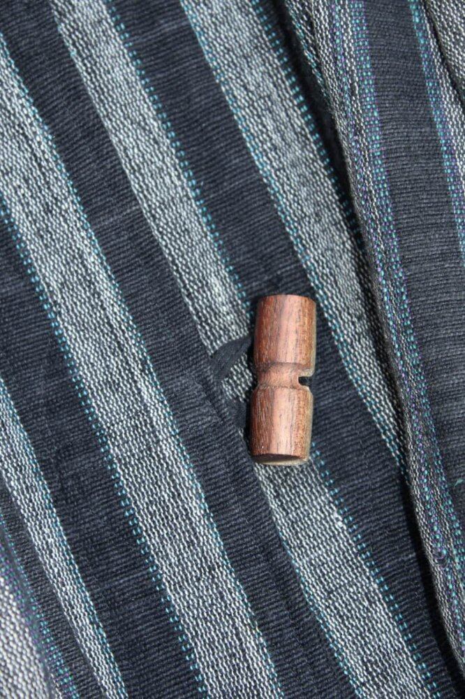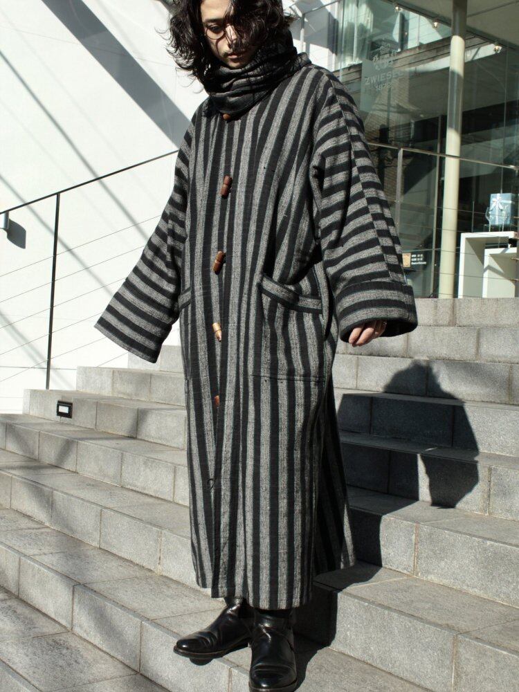 A long coat made in Nepal. A solid woven fabric with natural cotton threads is used for a solid texture. The charcoal black, blue, and gray stripes are designed to look sporty. The best time to see it is the relaxed appearance with a loose pattern of one piece, and the stall at the collar is also a point. There is also a wide sleeve, so you can feel the Japanese atmosphere. The cotton lining is dirty, and it is in good condition subjectively. Since it is an old product, it may deteriorate over time. Please check the photo and purchase after acknowledging the characteristics of Vintage.