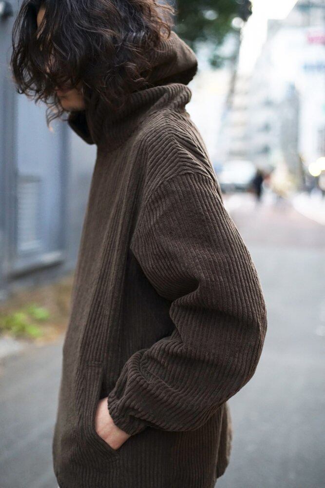 [Roundabout] 2020 A / W Collection 3.5 A pullover hoody made from thick-ridged corduroy fabric with a soft and gentle warmth. The volumey rounded form gives a nice thickness and a feeling of falling, and expresses a beautiful drape. The large hood stands up well and is made three-dimensionally, and keeps a beautiful shape even when worn. A drawcord is placed on the hem to adjust the length and you can enjoy changing the silhouette. In addition, the sleeves are pivot sleeves so that they do not interfere with the movement of the sleeves when worn. The wearing photo is size 2 (M).