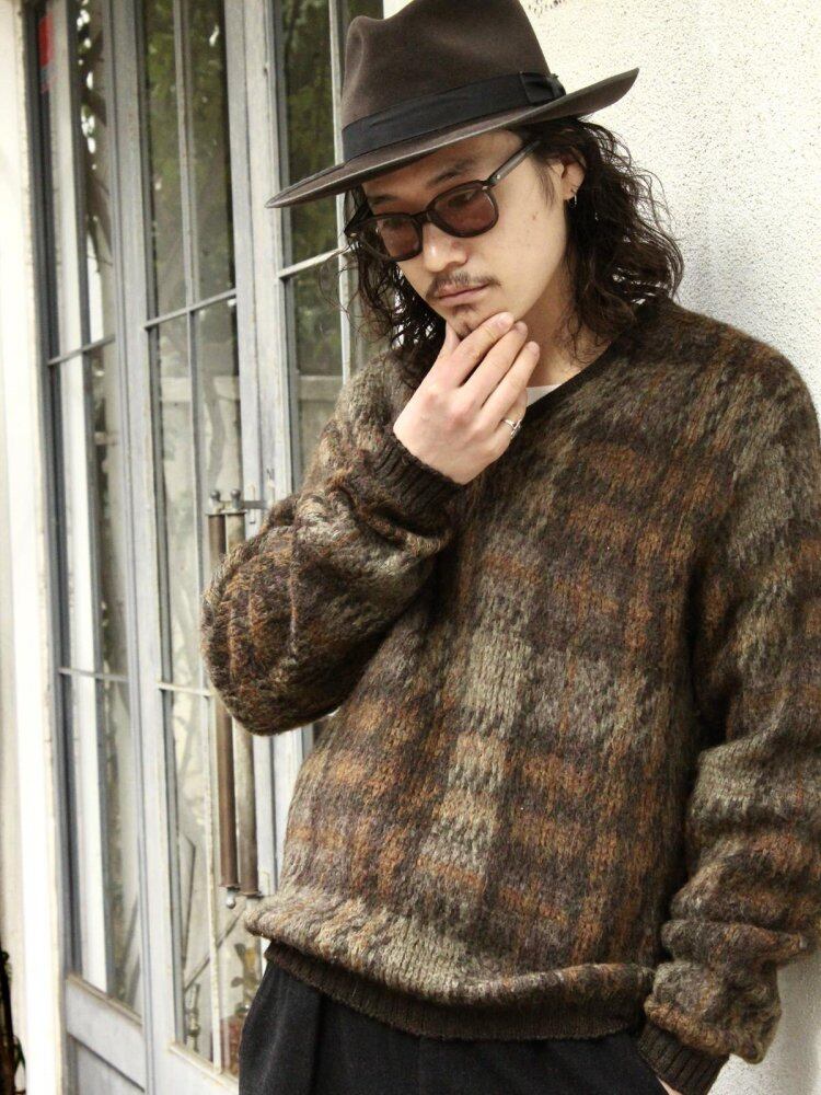 Jacquard knit around the 1960s. Probably 100% virgin wool is used and it is a soft jacquard knit that feels a little hairy like a mohair knit. The V-neck line, which is not too deep, looks nice and neat, but the silhouette is not too thin. It is a warm vintage coloring with astringency based on dark brown. Hairy knits are a very valuable piece in recent years. The hem rib is damaged in one place, and it is in good condition subjectively. Since it is an old product, it rarely deteriorates over time. Please check the photo and understand the characteristics of Vintage before purchasing.