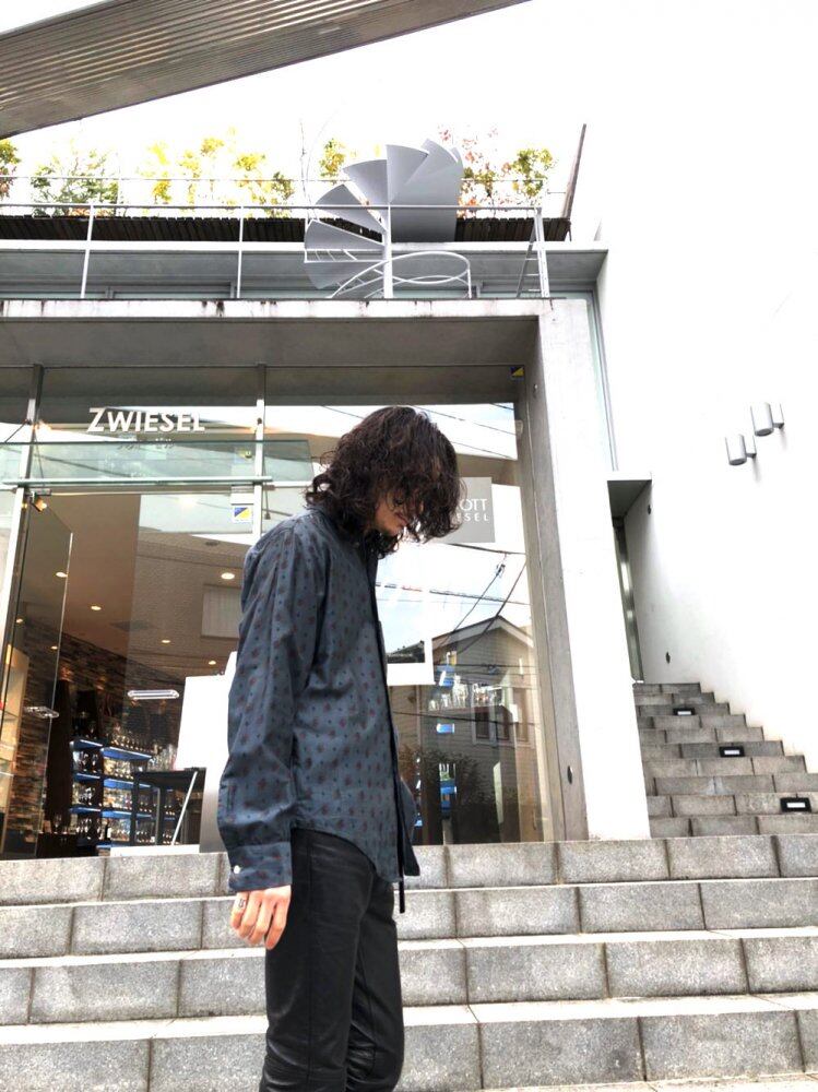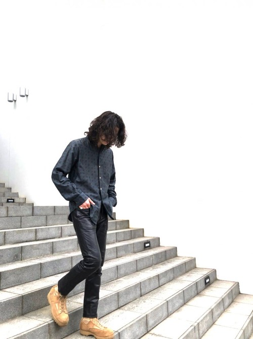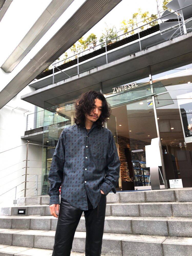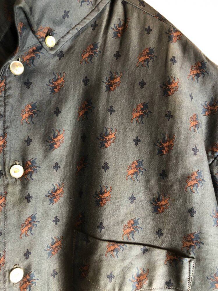 Vintage B / D shirt of the 1960s The unicorn and lily prints that represent chastity are cool. The smooth and light texture of the cotton fabric and the calm charcoal color. Good silhouette with just the right amount of room.