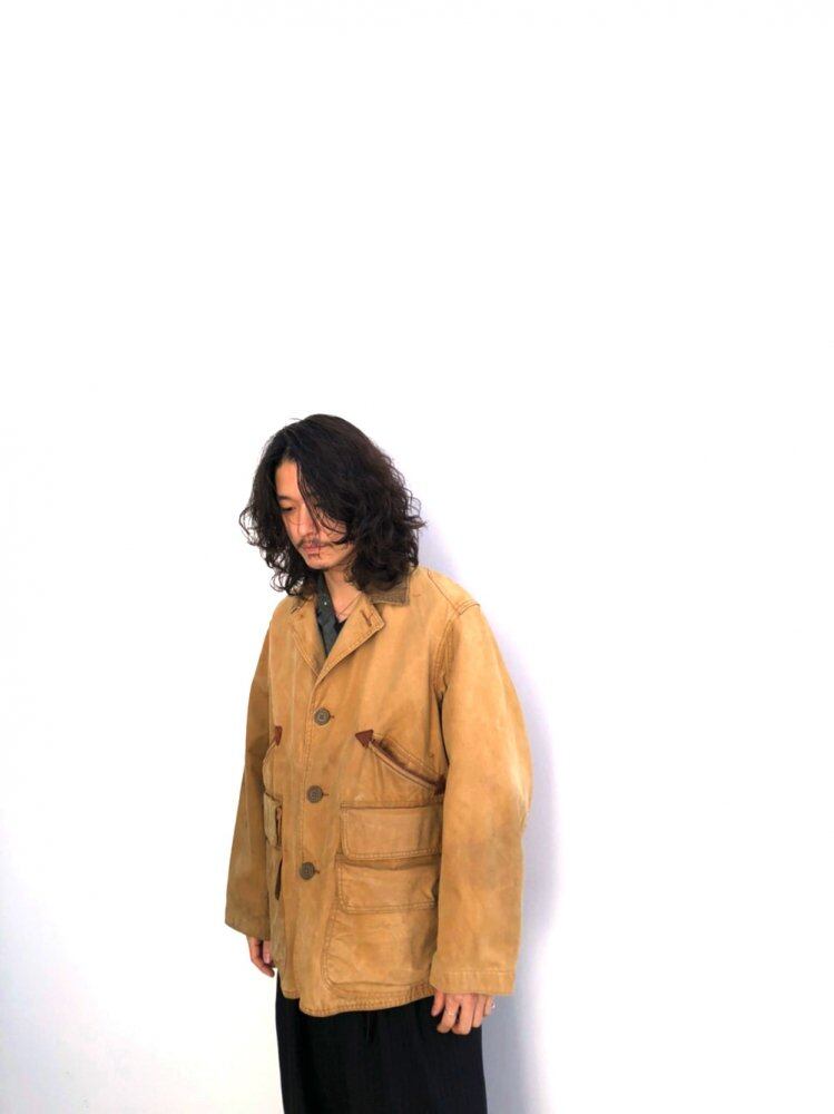 40s hunting jacket A rugged and masculine khaki color that has aged over time. A rare design fabric with hand pockets with leather piping that has a western feel. A jacket that is just right for a haori coat in early spring. A well-balanced silhouette with just the right amount of room