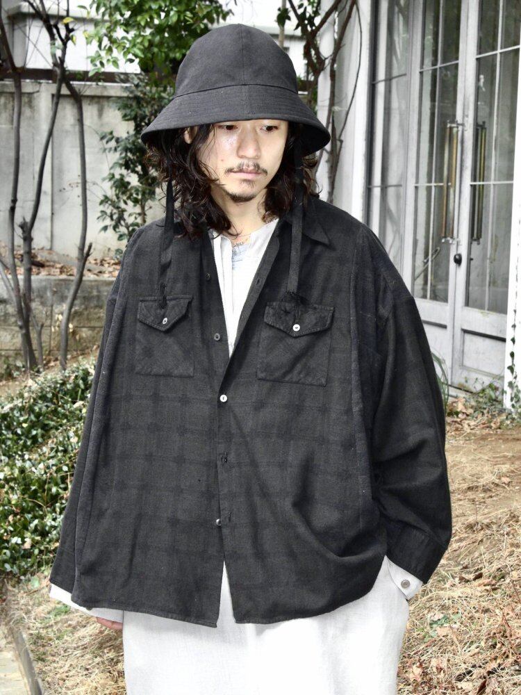 Our original pimpstick remake line The vintage cotton flannel shirt is dyed black to give a more minimalist impression. The original color looks like it stands out depending on the amount of light, and you can see a light check pattern. You can experience a softer expression with more air by using two shirts and tailoring it to a big silhouette to make the soft and light touch of the strongly washed fabric more conscious. I am also conscious of the image like a poncho, a wide sleeve with two pieces joined together. Since it is an old product, it rarely deteriorates over time. Please check the photos and understand the characteristics of vintage before purchasing. In addition, there is damage in various places due to strong washing. We have repaired it, but some of it is left as a design. As it is a dyed product, discoloration may occur. Please note that.