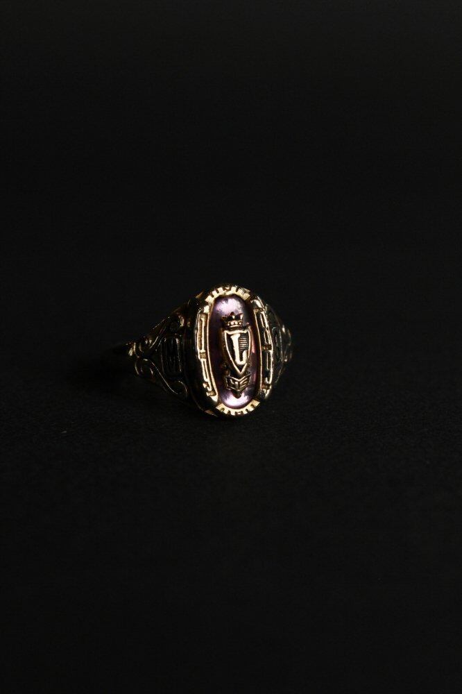 It is a vintage class ring of 1989. A luxurious structure with amethyst on the top with a 14-karat gold yellow gold specification with a small number of balls. It has an elegant appearance combined with delicate engraving that looks like an antique medal even in a relatively new age. Amethyst is the guardian stone of love, the Greek word amethystos which means dont get drunk. Long-established Herff Jones 14kt gold engraving. Please check the condition in the photo and purchase after acknowledging the characteristics of vinteg.