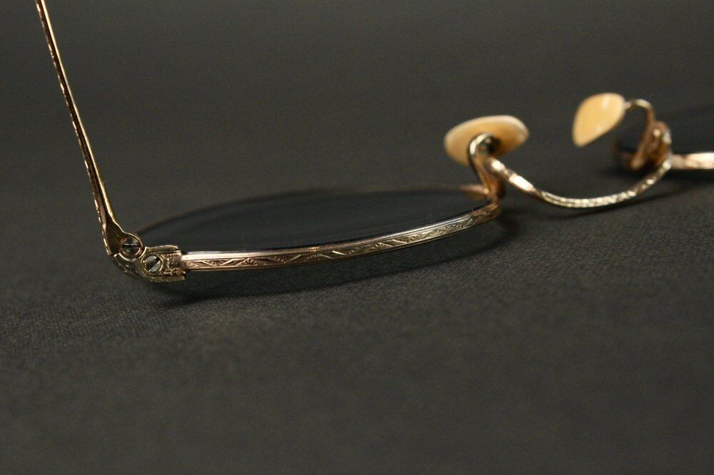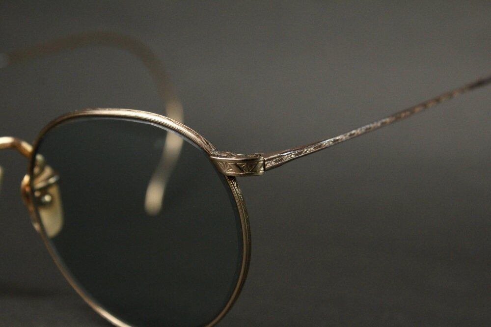 Vintage [American Optical] glasses from the late 1930s to the early 1940s. The worlds oldest eyeglass maker, commonly known as AO, is a historic brand that laid the foundation for eyeglasses. A full-view type round frame with a temple developed in the car society at the top, engraving by a watchmaker at the time of the war. Is a delicate and elegant design. Bread with a slightly flat upper part and a valuable type with a slight style. The actual size of the temple is long for this type, so it is easy to put on. It is a 12Kt-Yellow Gold gold-plated specification. We have newly added a grayish green color UV lens. It has been maintained at the eyeglass store. The size of the wire (nawate) can be adjusted. (At your local optician) We have scrutinized the condition, but since it is a vintage item, there are threads and scratches. Please purchase after understanding the characteristics of vintage and antique.